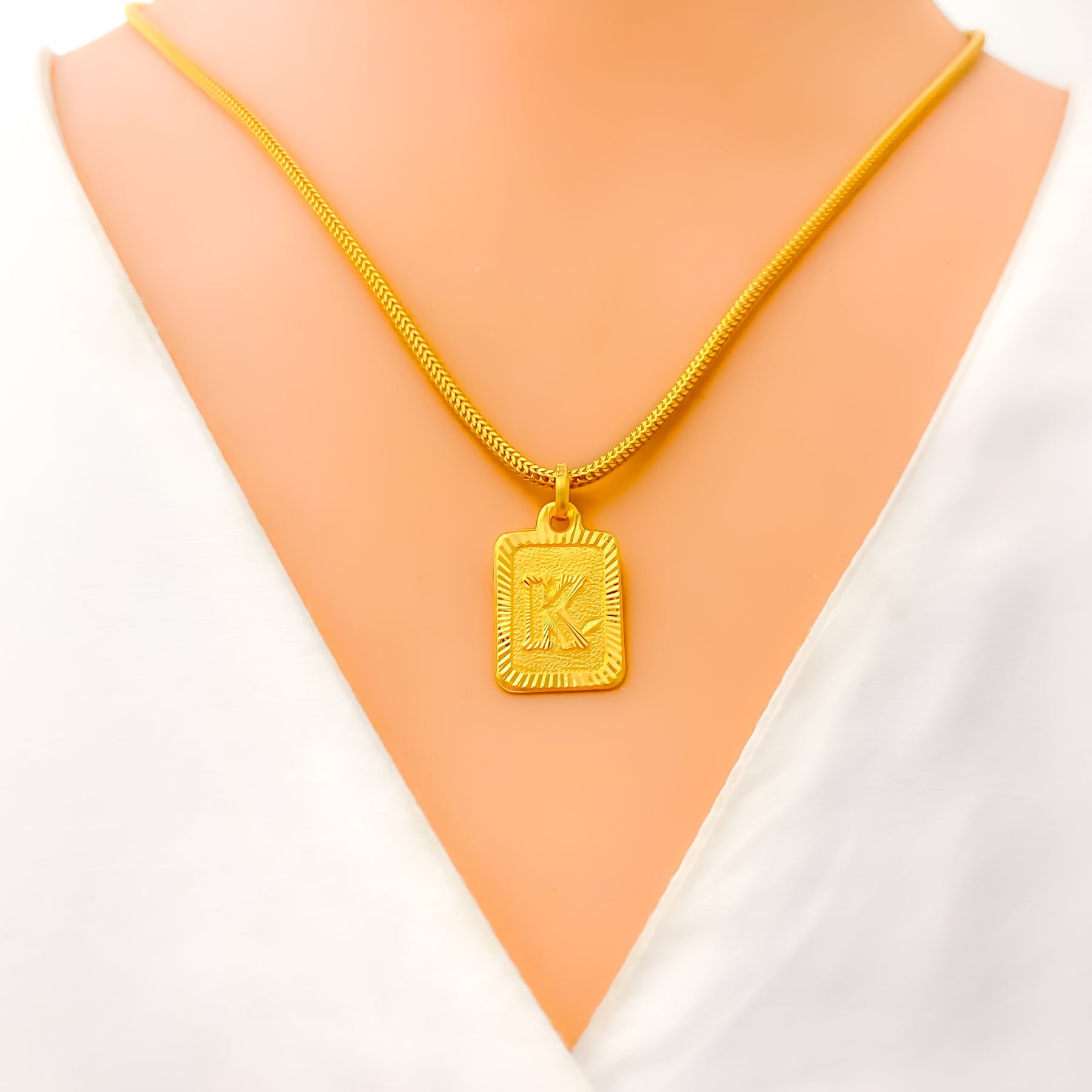Elegantly fashioned, this 22k gold pendant exudes sophistication through its ornate letter design and meticulous detailing. Weighing 1.3 grams, it balances delicacy with striking presence. The yellow gold finish radiates warmth, amplifying its graceful allure. Measuring 0.9 inches, it offers timeless beauty for both daily wear and special moments.