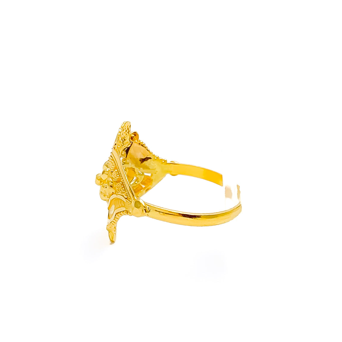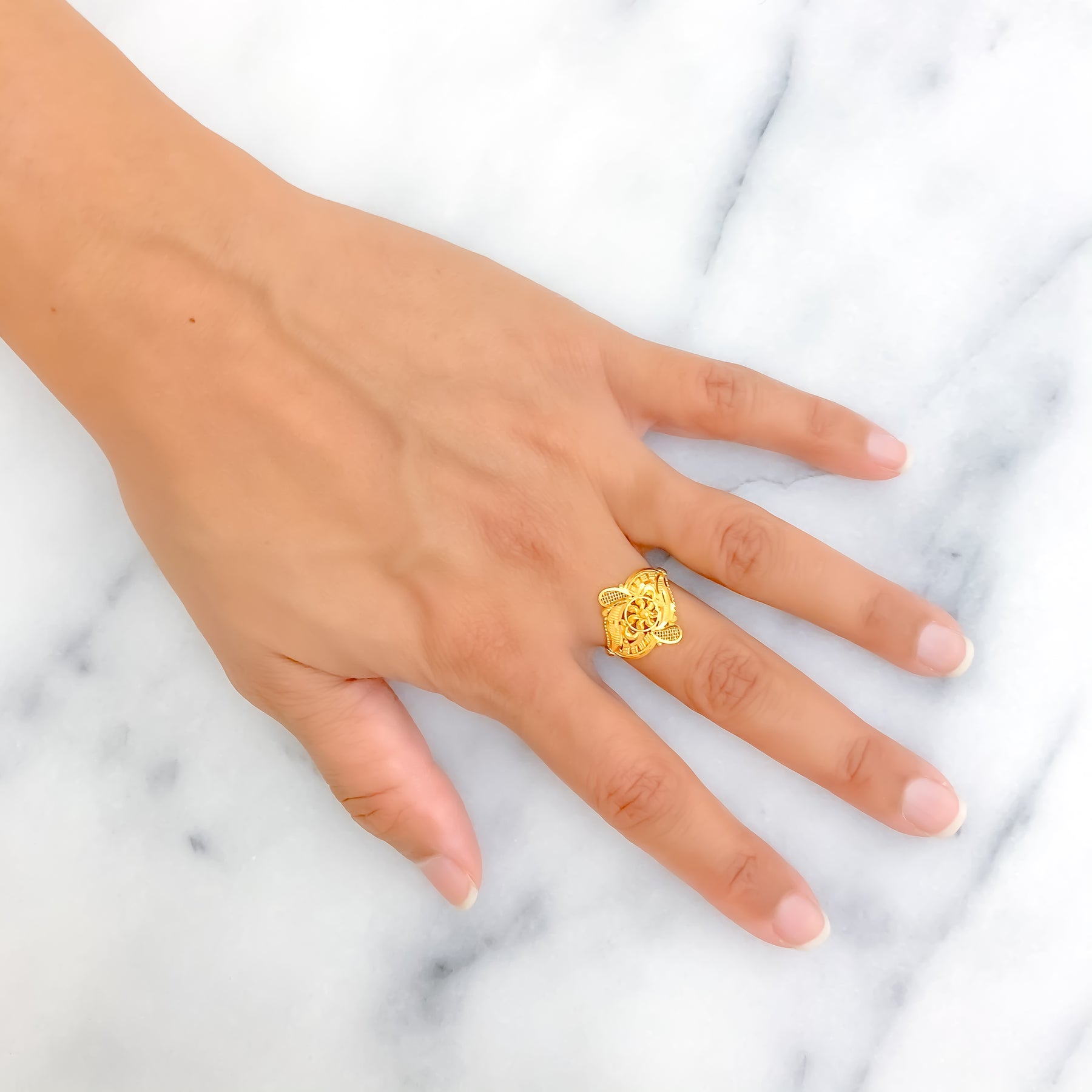 Delicately styled with artistic charm, this 22k gold ring highlights a lightweight 1.9-gram profile shaped into an intricate netted floral motif that radiates captivating elegance. Its warm yellow-gold finish enriches each openwork detail with glowing depth and graceful sophistication. Designed in size 6 with re-sizing available, it offers adaptable comfort suited for many refined looks. Perfect for adding a beautifully detailed touch of golden artistry to any thoughtfully curated collection.