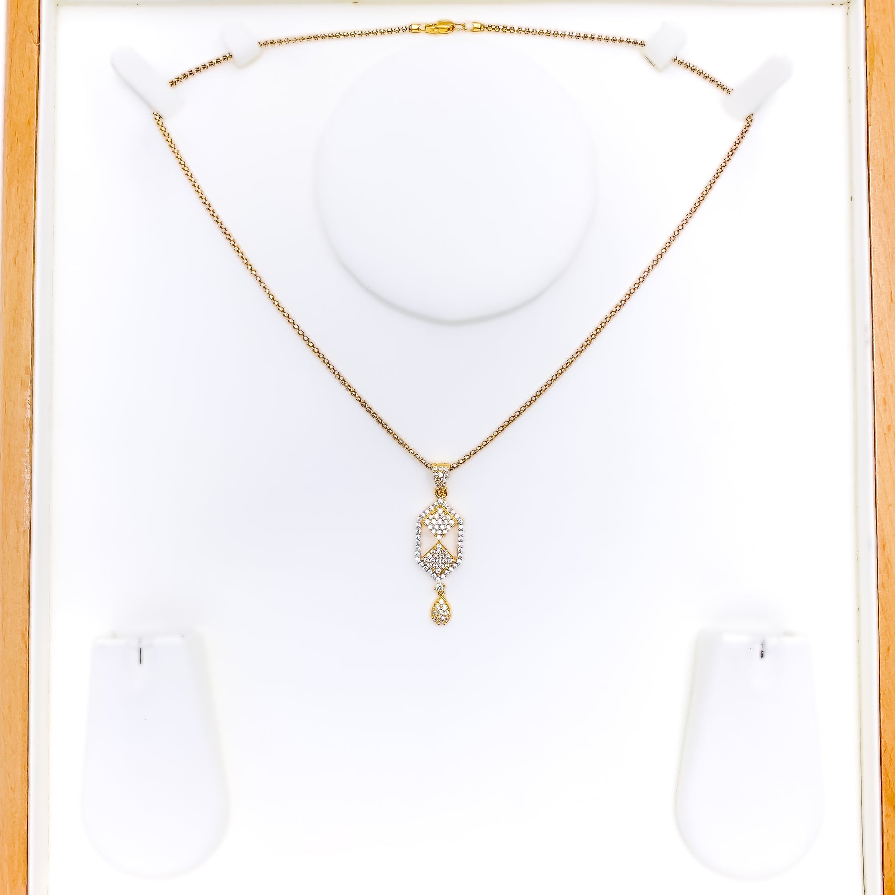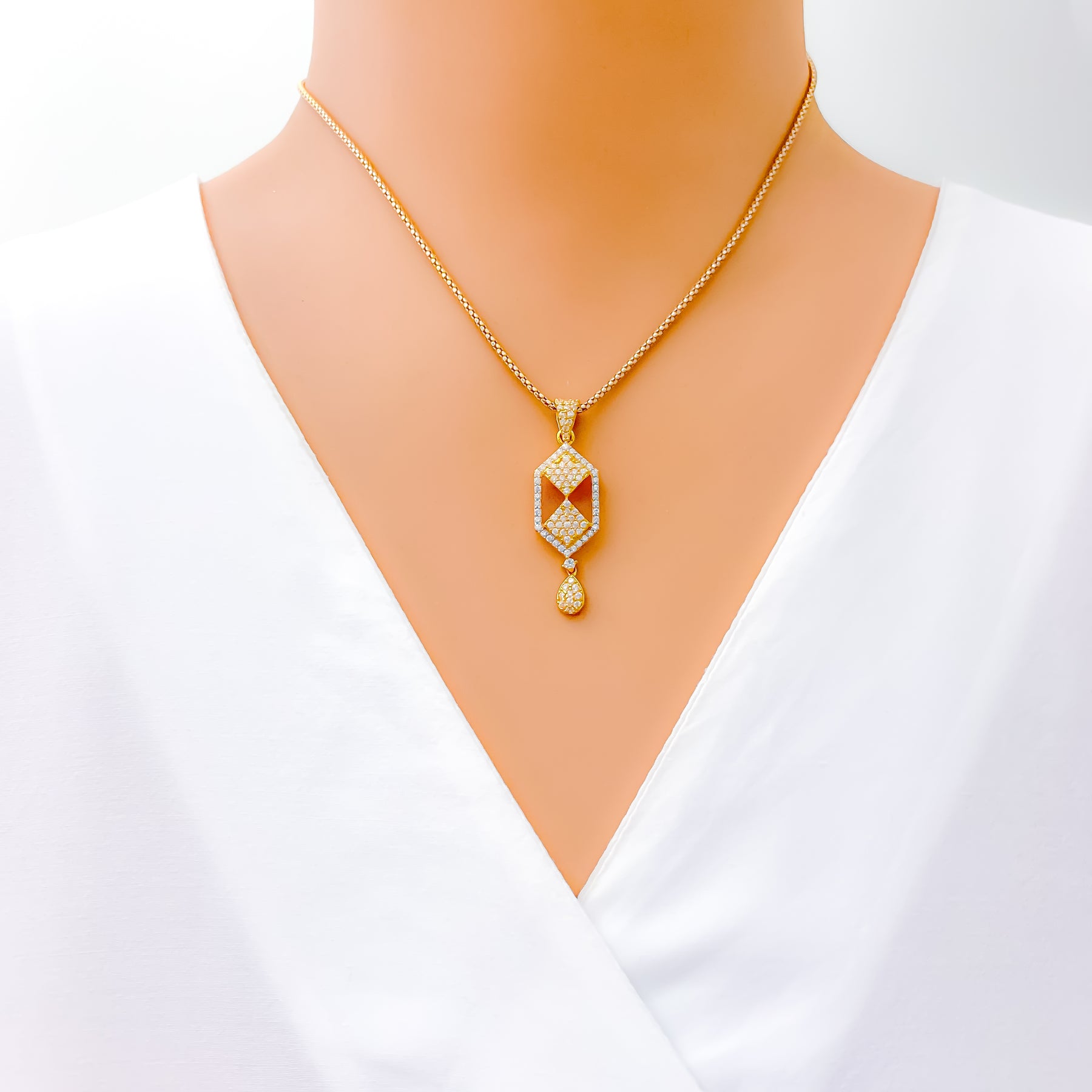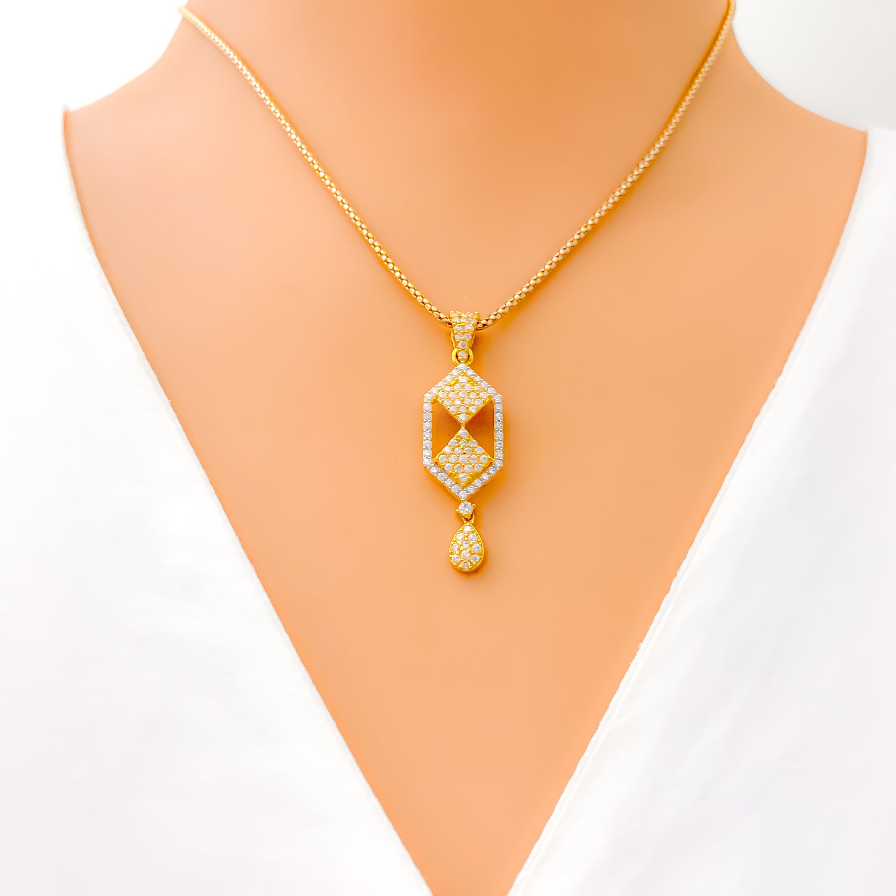 Crafted with refined geometry, this 22k gold pendant features a polished 3.1-gram profile accented by shimmering CZ stones that elevate its hexagonal shape. Its yellow-gold finish adds warm radiance to the sleek 1.6-inch silhouette. The crisp facets bring modern elegance with a touch of timeless charm. Perfect for pairing with your preferred chain to create a luminous, stylish statement