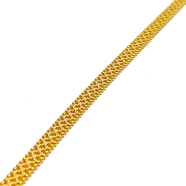 Designed with polished finesse, this 22k gold bracelet features a graceful 4.2-gram profile that lays smoothly along its refined 6.5-inch length. Its warm yellow-gold finish enriches every delicate link with radiant depth and dressy sophistication suited for many elegant looks. The slender silhouette offers effortless versatility while maintaining a distinctly stylish presence. Secured with a reliable lobster lock, it adds a beautifully refined touch of golden charm to any thoughtfully curated collection.