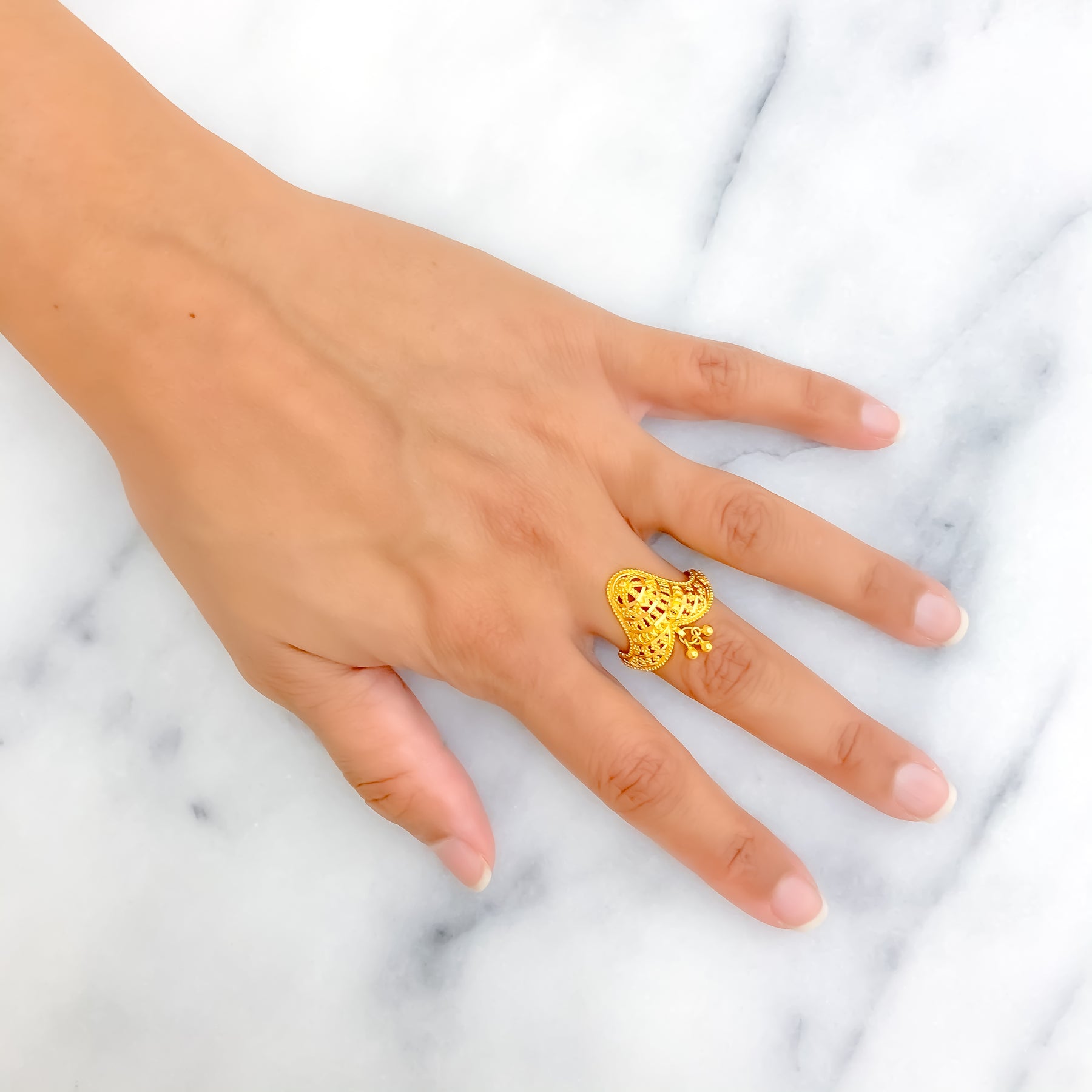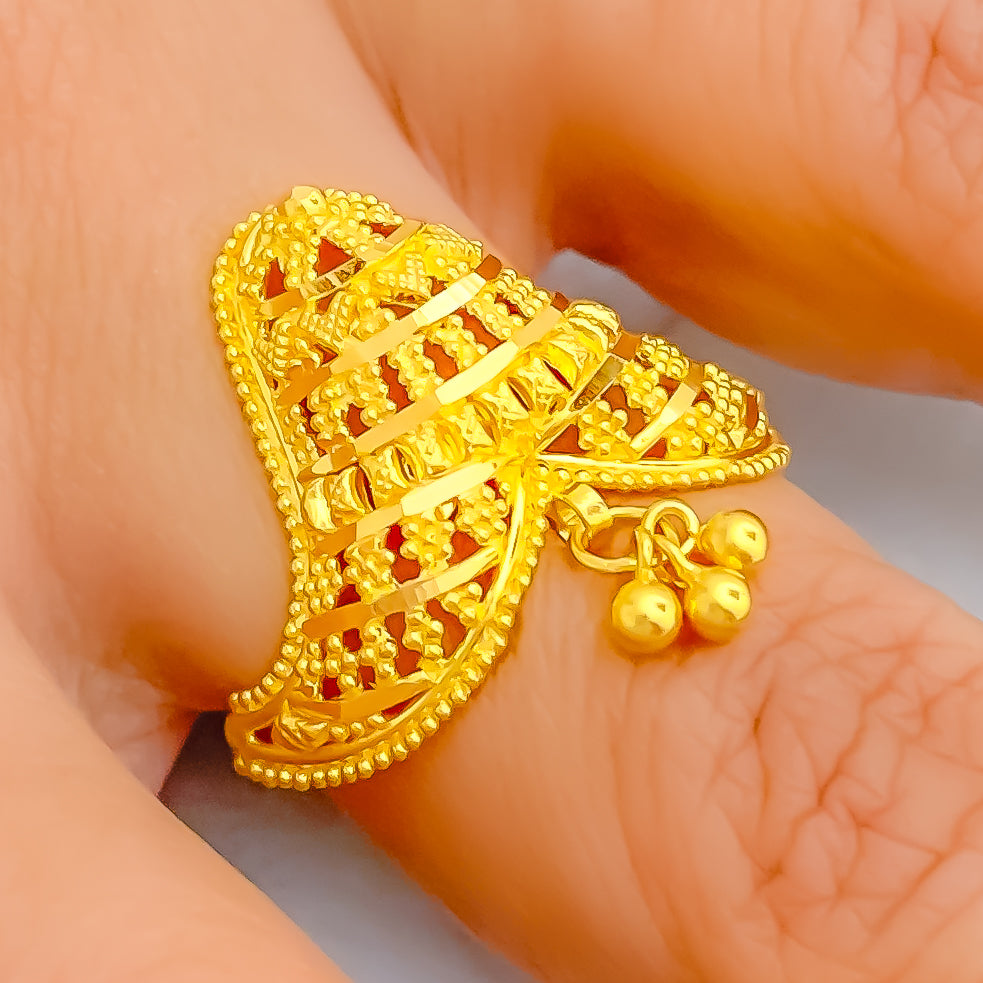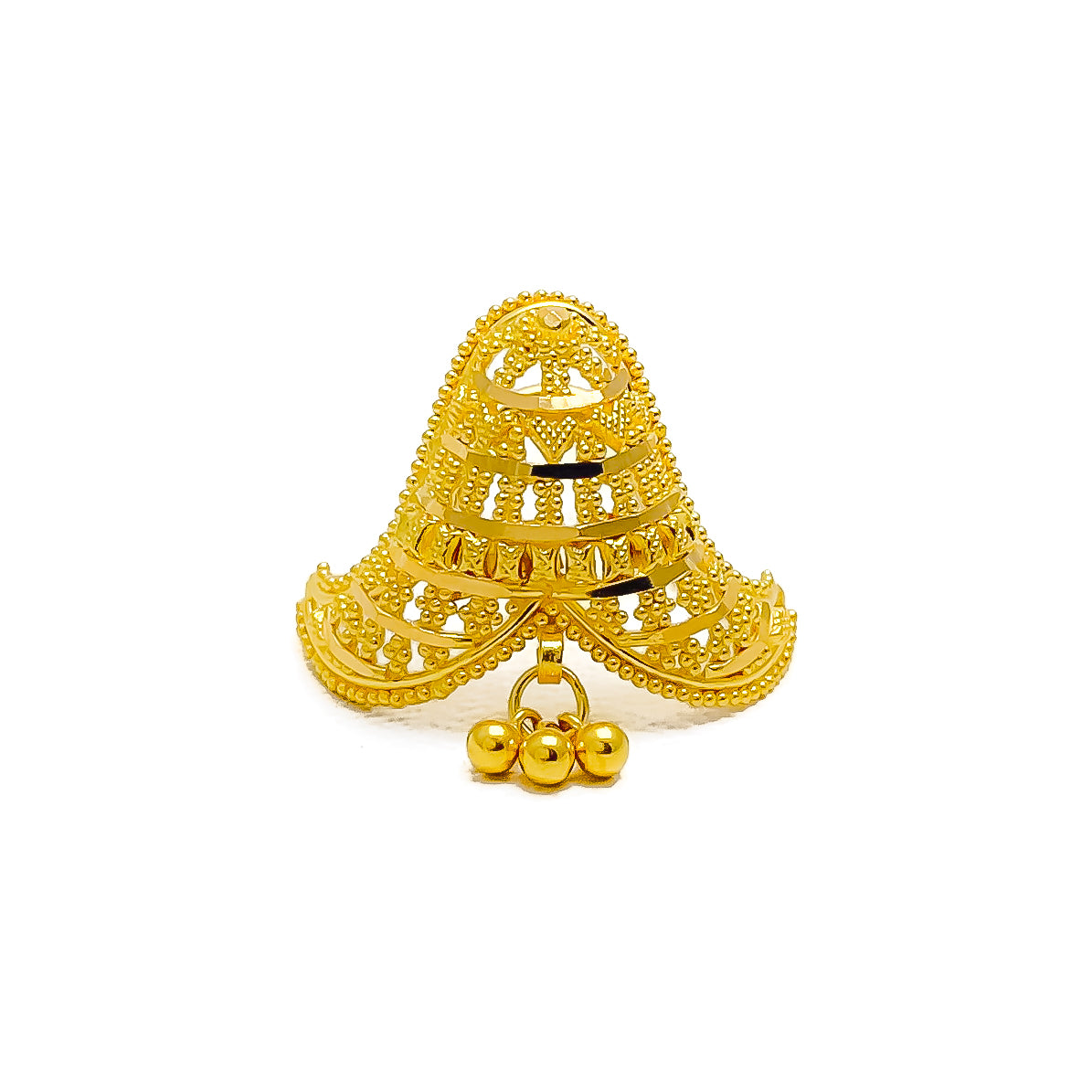 Defined with artistic flair, this 22k gold ring features a refined 4.1-gram profile shaped into a distinctive vanki silhouette accented by graceful tasseled detailing that adds lively charm. Its warm yellow-gold finish enriches every sculpted curve with radiant depth and expressive sophistication. Designed in size 6 with re-sizing available, it offers adaptable comfort suited for many elegant, statement-ready looks. Perfect for adding an eclectic touch of golden uniqueness to any thoughtfully curated collection.