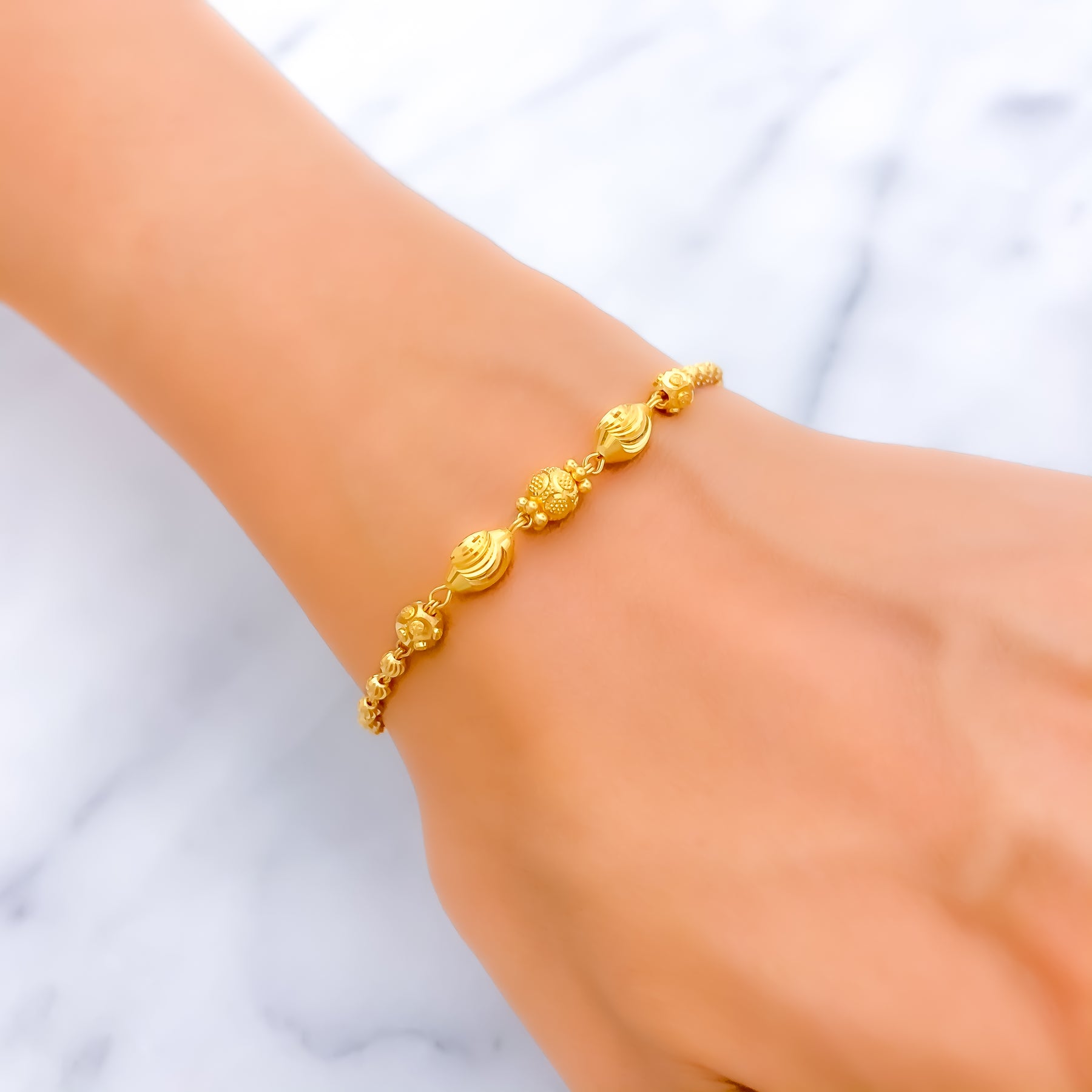 Refined and eye-catching, this 22k yellow gold bracelet weighs 5.6 grams and features a polished orb design with a luxurious upscale flair. With a 7.25-inch length and lobster lock closure, it blends elegance with comfort. Perfect for adding sophistication to both day and evening looks.