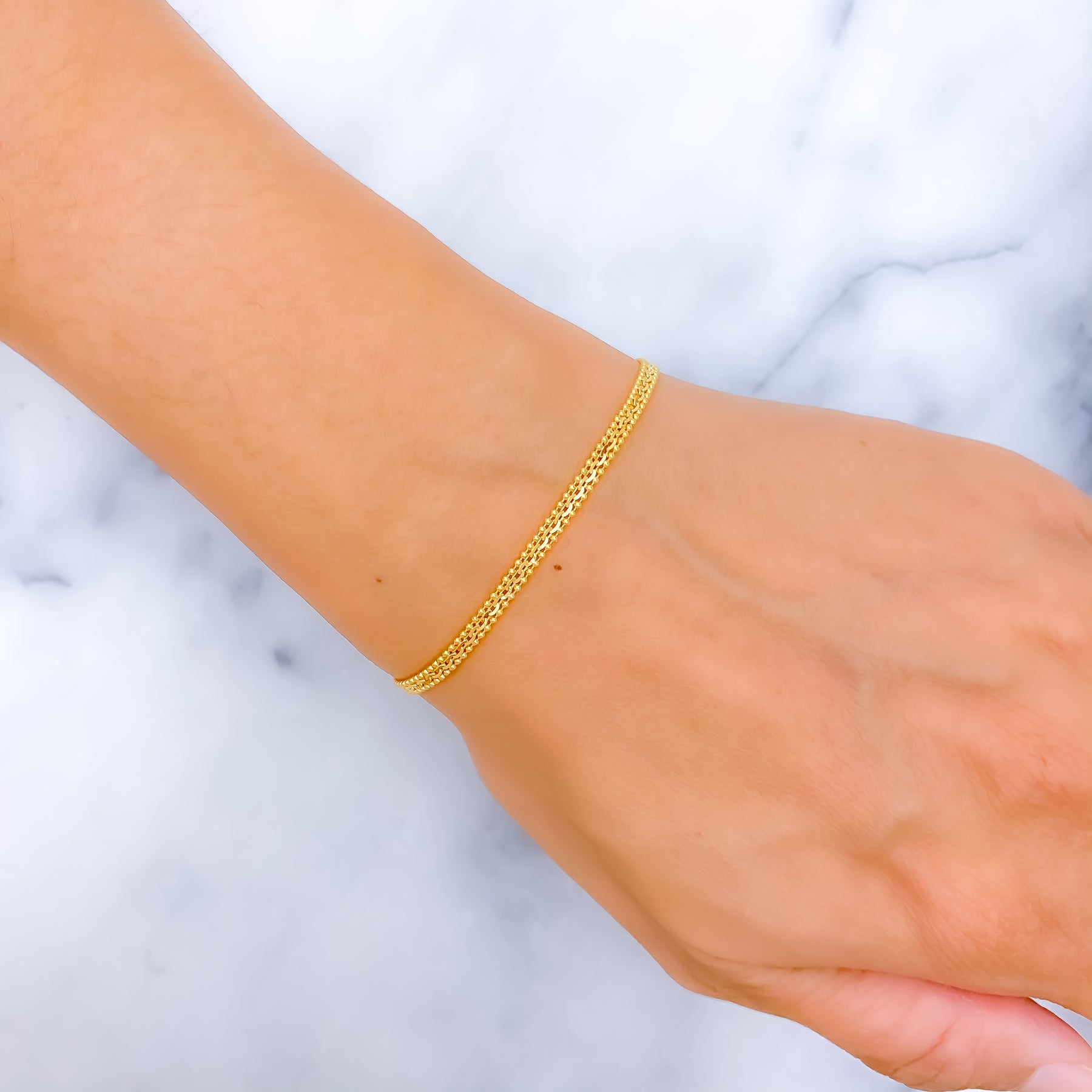 This refined bracelet highlights a polished yellow gold finish that enhances its sleek 7-inch silhouette with understated elegance. Weighing 3.6 grams, the design offers a lightweight yet stylish presence that feels effortlessly comfortable for everyday wear. Its smooth profile adds a touch of graceful sophistication that pairs beautifully with both minimal looks and more elevated ensembles. Completed with a secure lobster lock, it serves as a timeless and versatile addition to any thoughtfully curated jewelry collection.