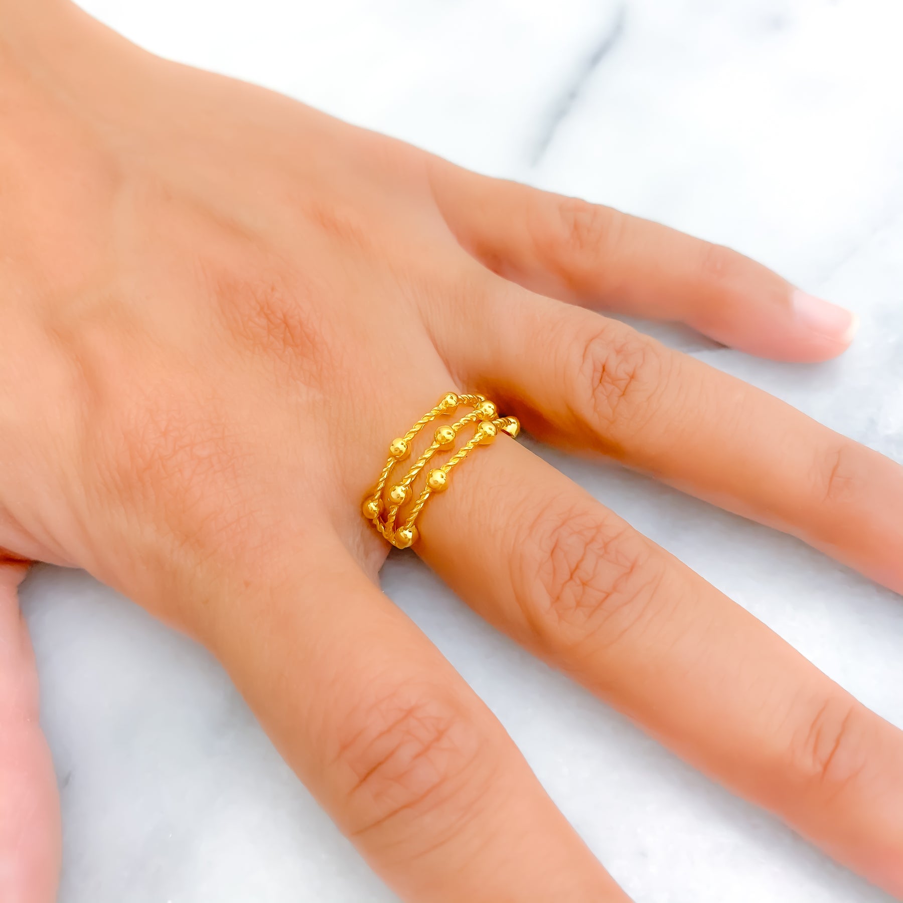 Crafted with detailed elegance, this 21k gold ring features a polished 2.6-gram profile shaped with three refined lines that add depth and modern flair. Its yellow-gold finish brings warm radiance to the smooth, structured band. Designed in size 7.25, it offers comfortable wear with resizing available for an ideal fit. Perfect for those seeking sophisticated texture that enhances everyday style with subtle distinction.