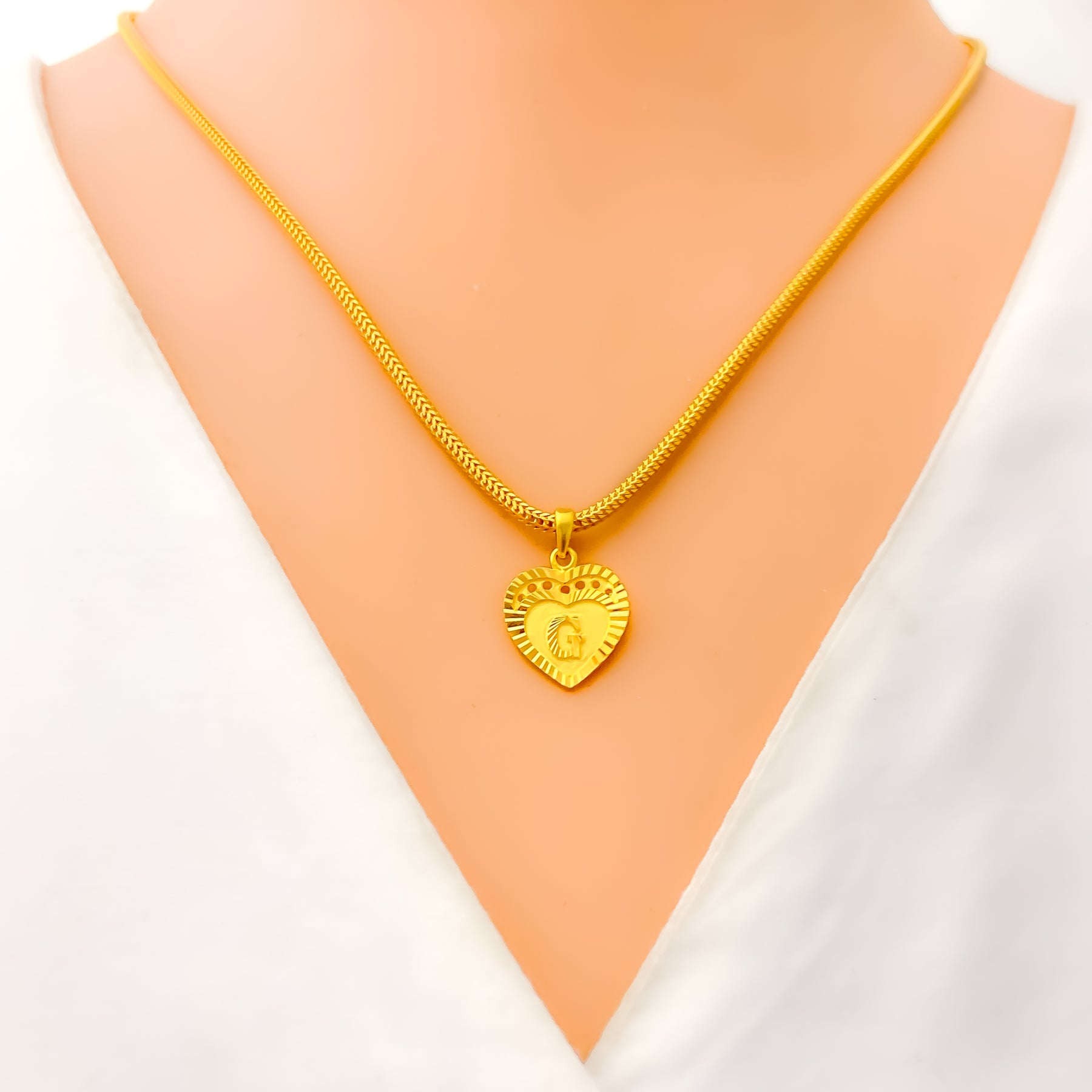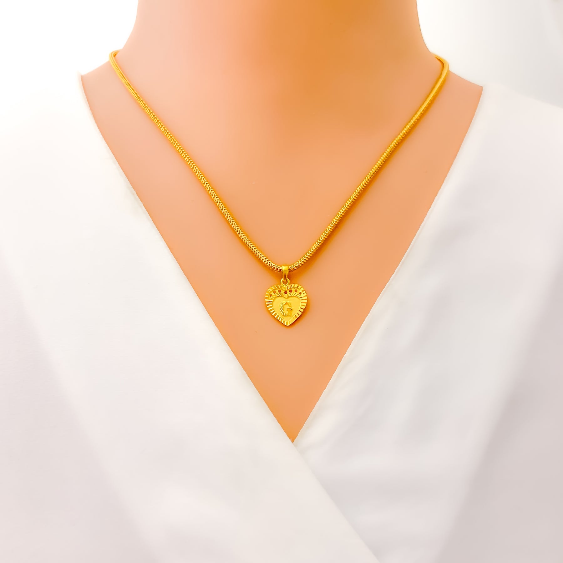 Radiating warmth and sentiment, this 1.1-gram 22k yellow gold letter pendant captures timeless beauty with a heartfelt touch. The 0.75-inch design is delicately crafted to balance elegance and simplicity. Its polished golden sheen enhances its romantic allure, making it a perfect everyday keepsake. Ideal for layering or gifting, it symbolizes love and individuality in pure gold.