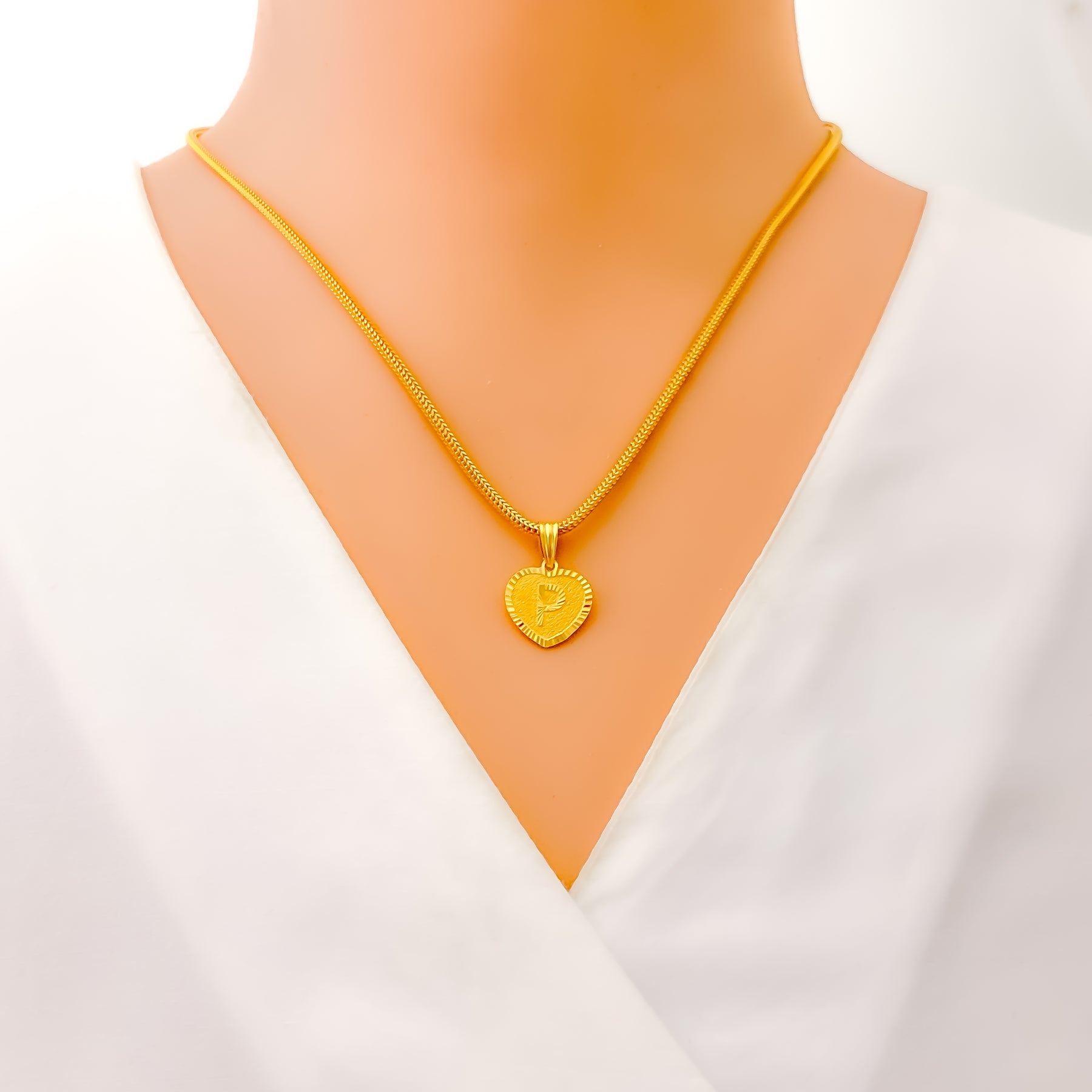 Beautifully polished, this 22k gold pendant captivates with its refined letter design and glowing elegance. Weighing 1.4 grams, it embodies a perfect fusion of luxury and delicacy. The rich yellow gold finish enhances its brilliance, adding timeless allure. Measuring 0.8 inches, it’s an elegant keepsake that complements any style effortlessly.