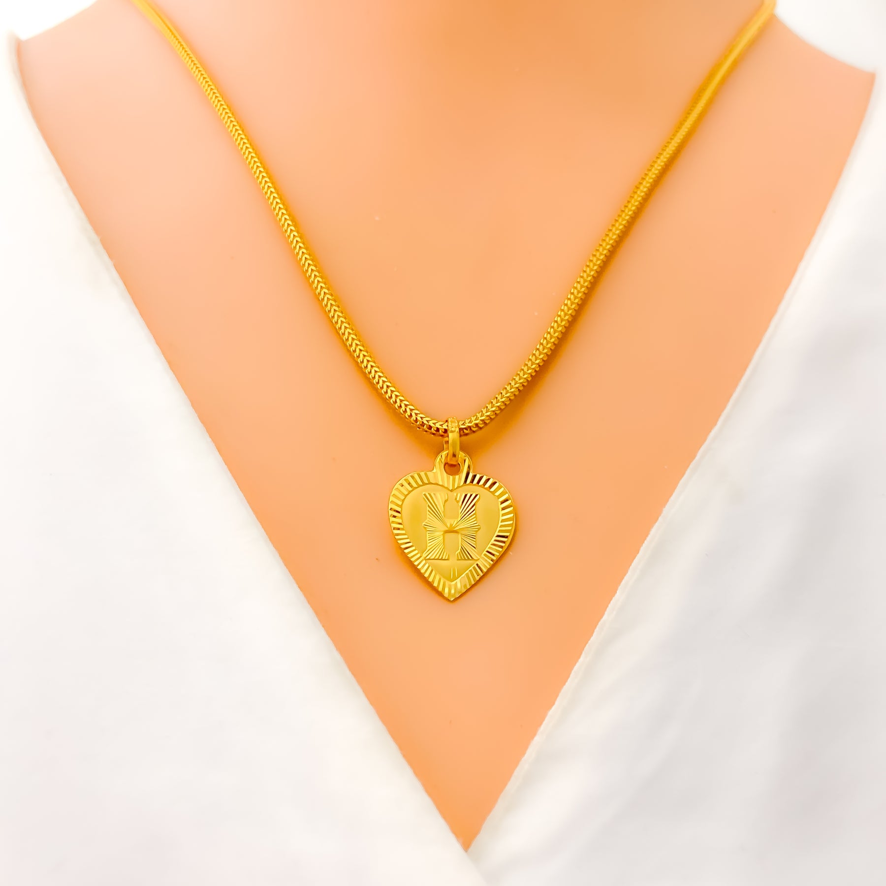 This graceful 22k gold pendant blends delicate charm with refined craftsmanship. Its lustrous yellow gold finish highlights the elegant letter design, creating a piece that feels both personal and timeless. Measuring 0.75 inches in length, it’s perfectly proportioned for everyday elegance. Whether worn alone or layered, it adds a touch of warmth and sophistication to any look.
