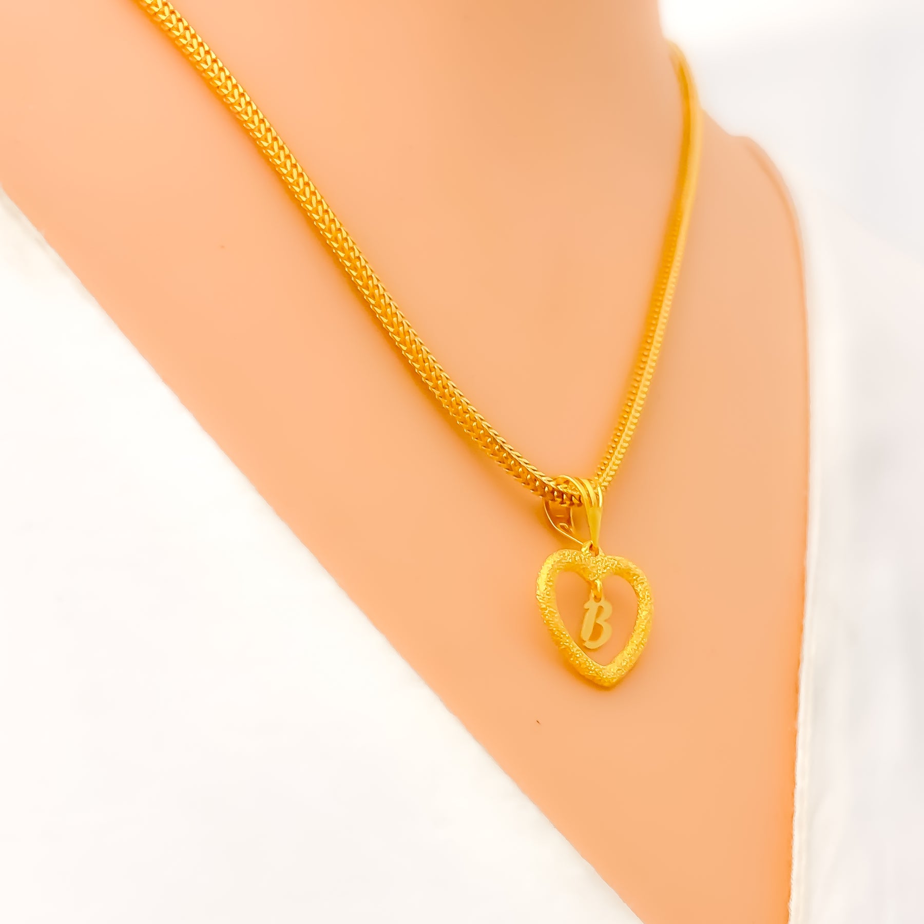 This chic pendant, crafted in radiant 22k yellow gold and weighing 1.2 grams, beautifully balances modern flair with heartfelt charm. Its sleek heart silhouette frames an elegant letter accent, making it both stylish and meaningful. Measuring 0.8 inches in length, it is perfectly sized for layering or solo wear. With no chain included, it offers versatile styling options to complement any personal necklace choice.