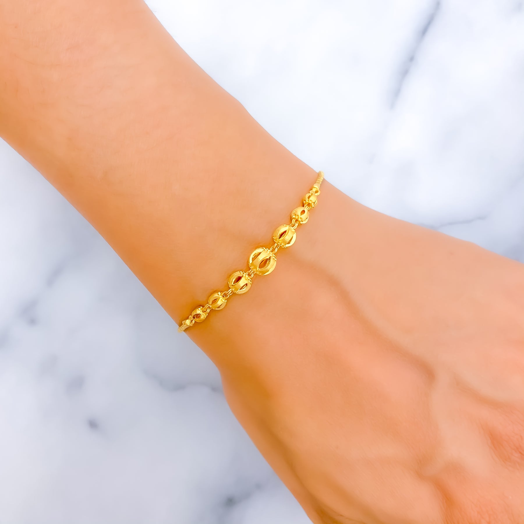 Delicately crafted in 22k yellow gold, this 4.7-gram bracelet showcases a striking cutwork orb design full of intricate detail. Measuring 6.75 inches, it’s finished with a secure lobster lock. Lightweight yet artistic, it brings a distinctive charm to any refined jewelry collection.