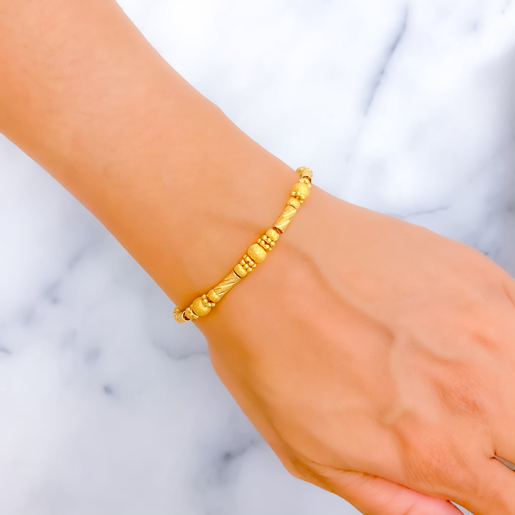 Sleek and refined, this 22k yellow gold bracelet weighs 11.7 grams and showcases a striking long barrel pattern. Measuring 7.5 inches, it closes securely with a lobster lock for comfortable wear. Its structured elegance and bold presence make it a standout piece in any gold collection.