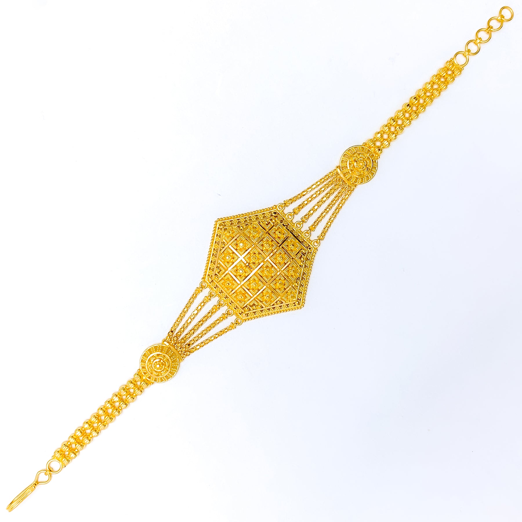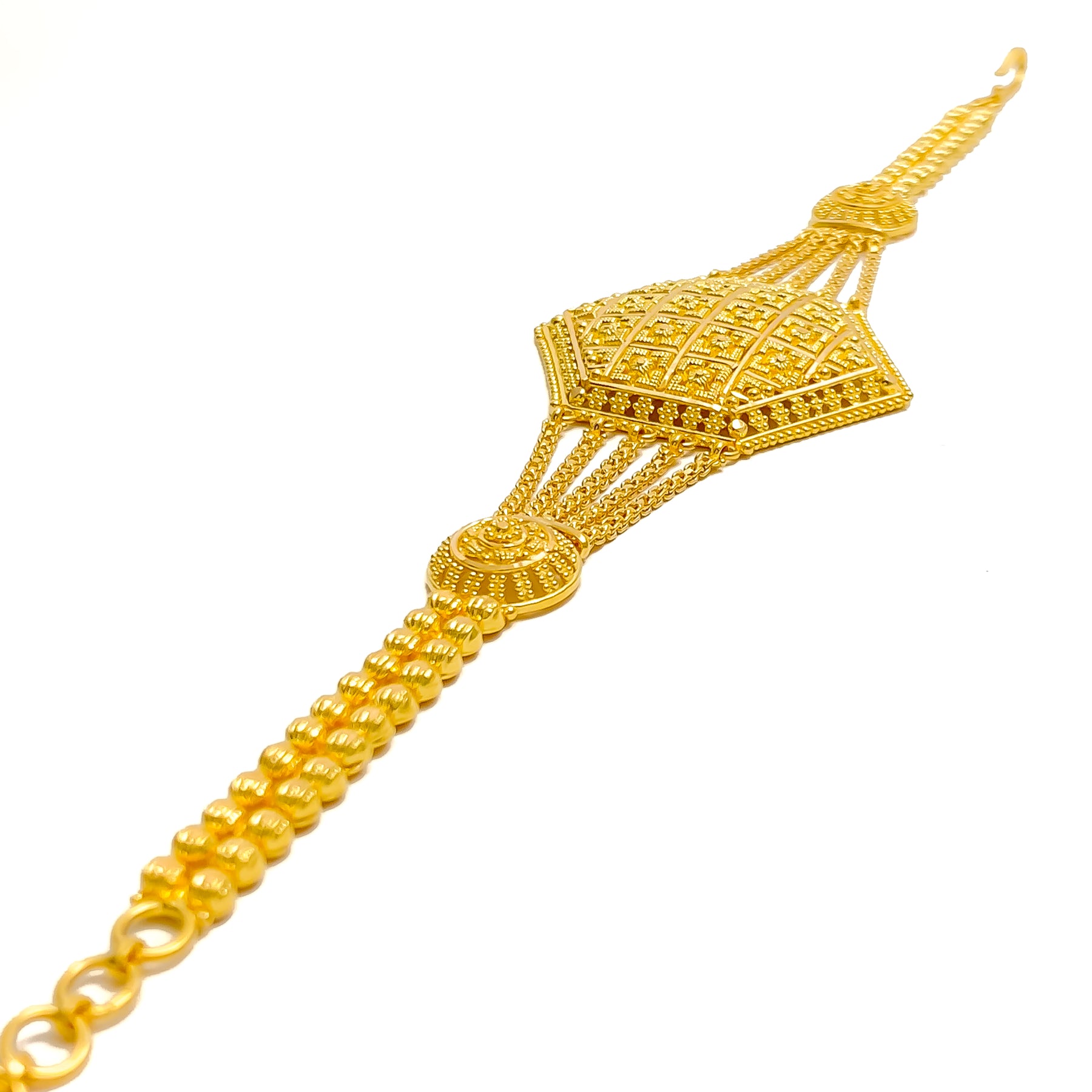 Timelessly refined, this 22k yellow gold bracelet weighs 19.1 grams and exudes classic elegance with its detailed traditional craftsmanship. Measuring 8 inches long with 0.9-inch adjustable links, it closes securely with a hook lock. A regal piece that blends heritage design with enduring sophistication.