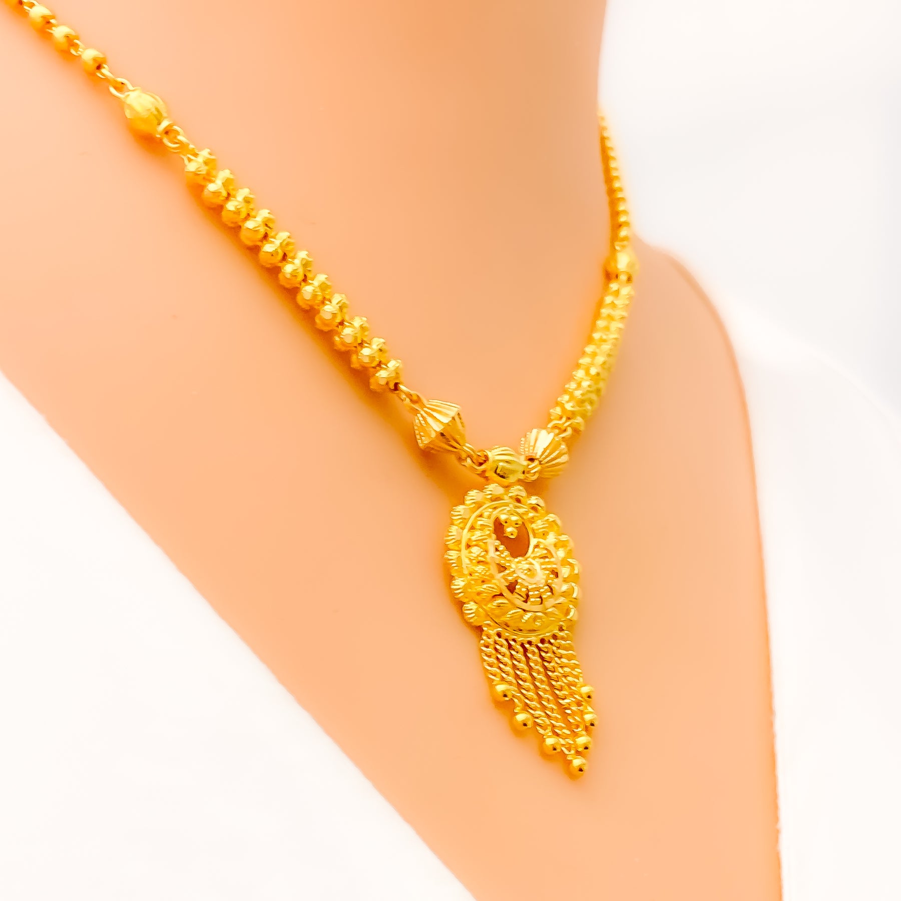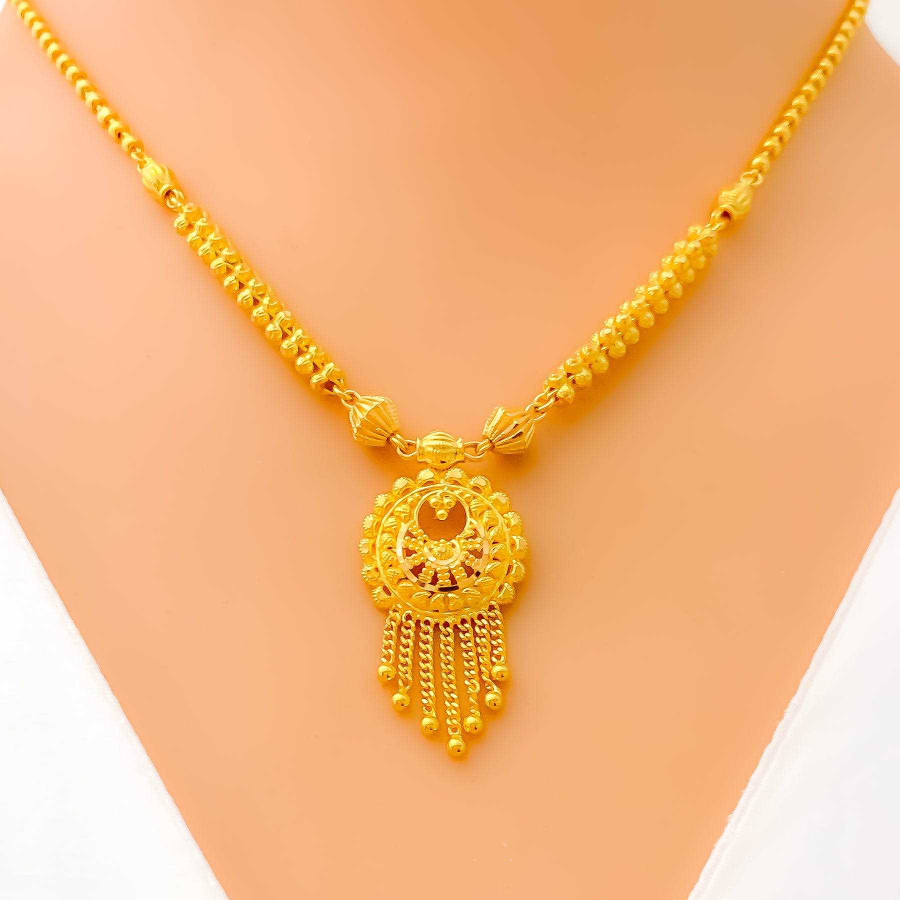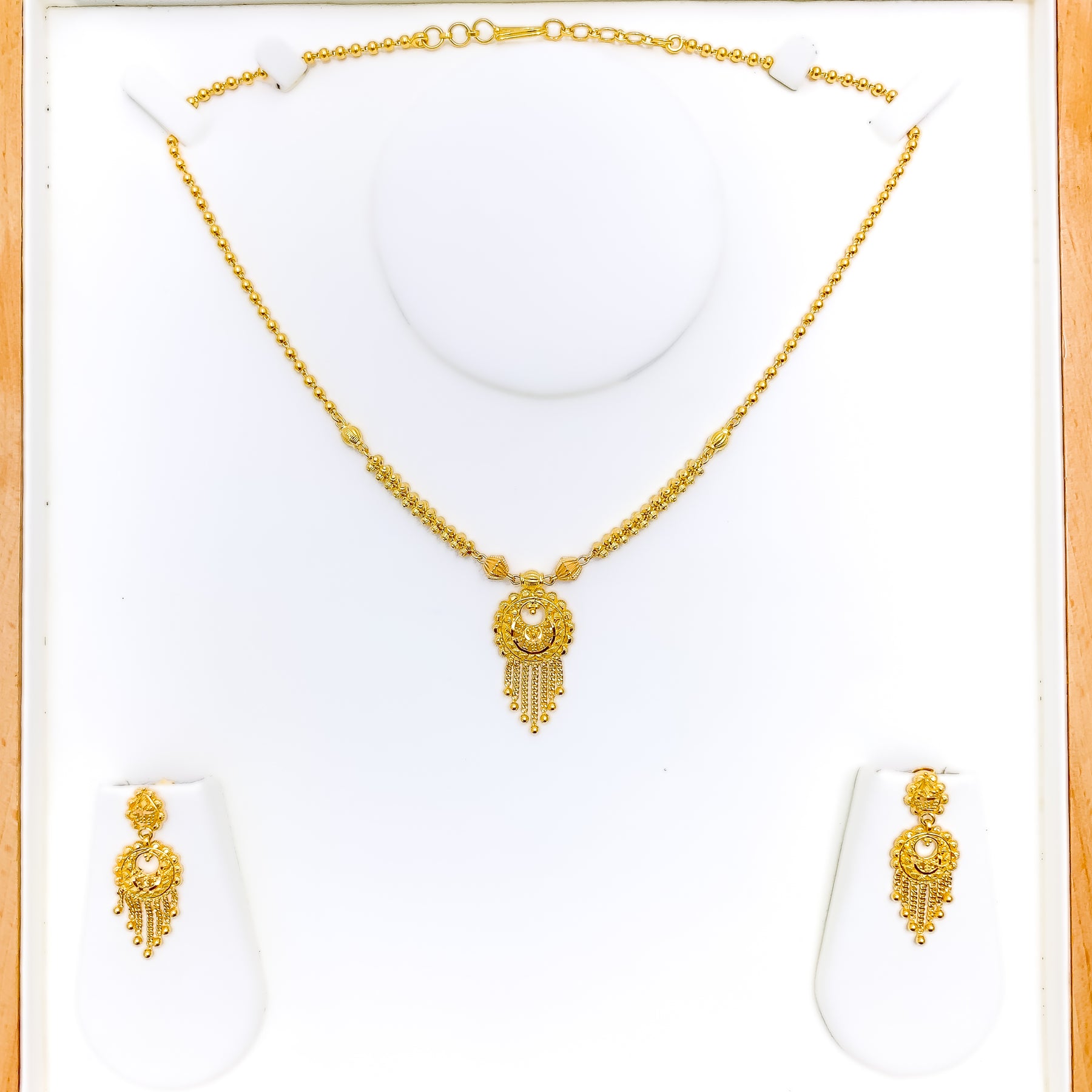 Exquisitely designed, this 22k gold necklace set showcases timeless allure with its elegant dangling motif. Weighing 19.3 grams, it offers a luxurious balance of craftsmanship and sophistication. The radiant yellow gold finish enhances its warm, captivating glow. Measuring 16 inches with matching earrings, it’s a graceful statement of classic refinement.