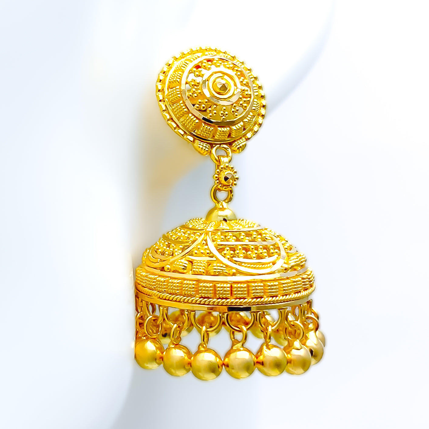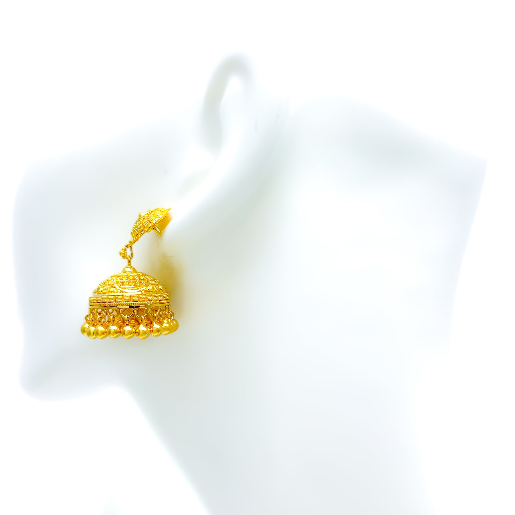 Blending floral artistry with traditional form, these 22k yellow gold Jhumki earrings offer a refined and graceful silhouette. Weighing 20.1 grams and measuring 1.7 inches in length, they showcase delicate petal-inspired accents that enhance their timeless charm. The hanging design sways beautifully, adding subtle movement and elegance. Secured with a screw back, they make a perfect statement for festive and formal occasions.
