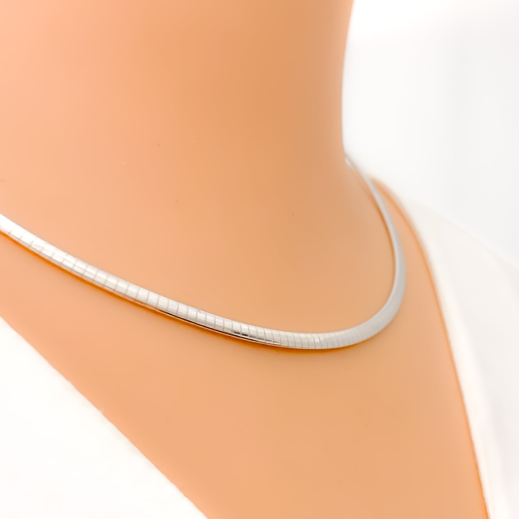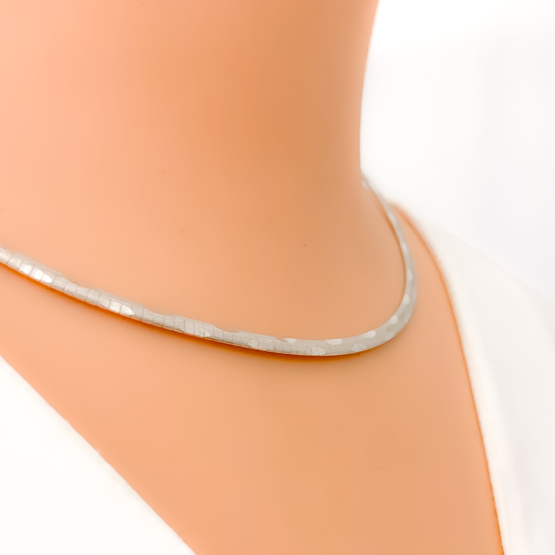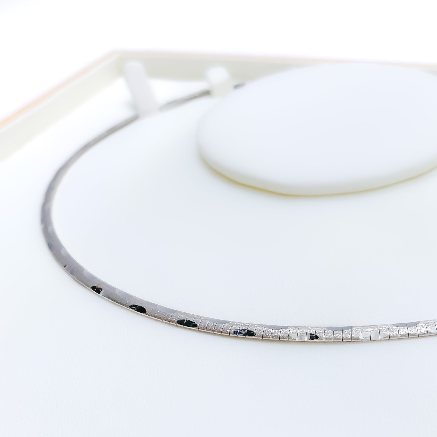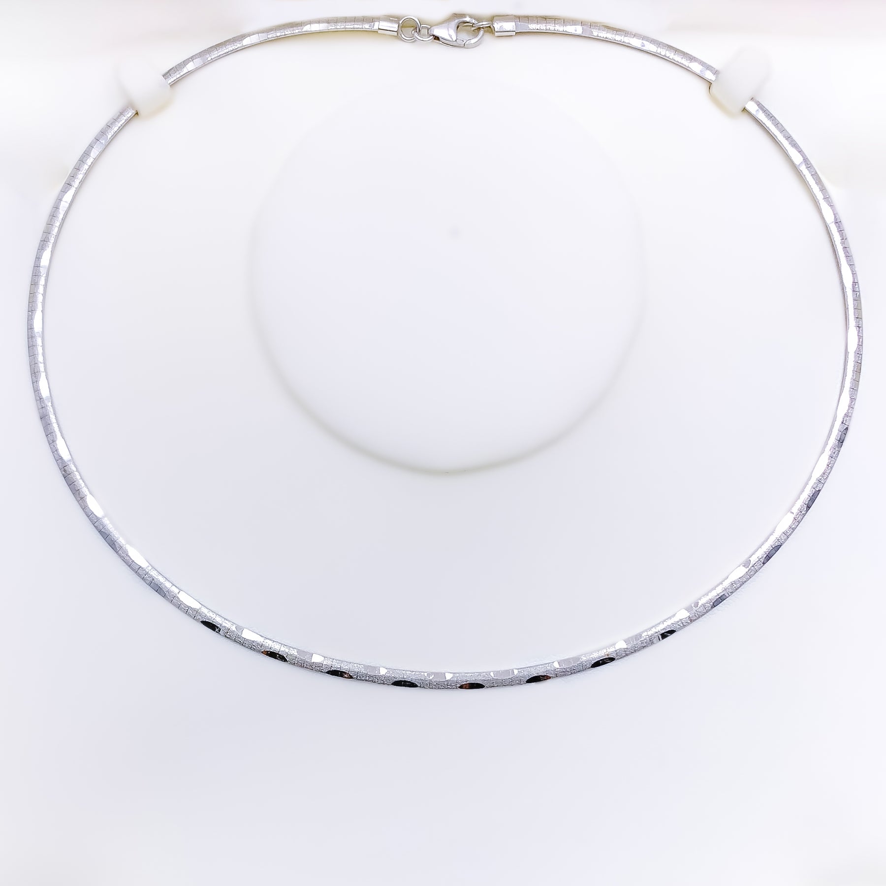 Crafted with dynamic appeal, this 22k white gold reversible necklace weighs 19.0 grams and measures 16" in length, secured by a lobster lock. Its finely textured surface catches the light beautifully, offering a striking finish on both sides. A glimmering statement piece designed for versatility and radiance.
