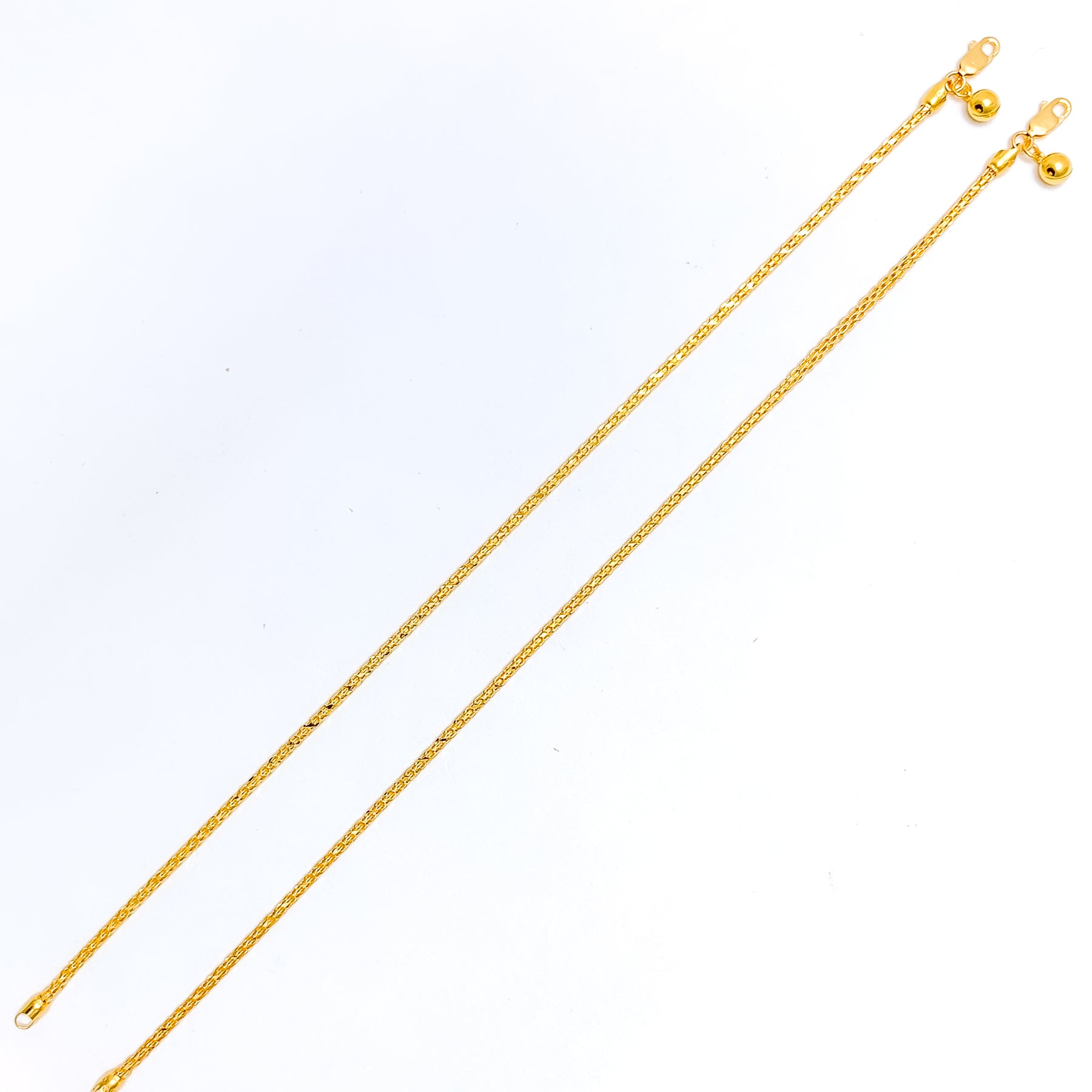 Expressed with striking brilliance, this 22k gold anklet pair presents a substantial 16.4-gram combined profile that drapes gracefully along each polished 10-inch length. Their warm yellow-gold finish enriches every link with luminous depth and a soft twinkling glow. The paired structure offers a refined blend of statement elegance and everyday sophistication suited for many styles. Secured with reliable lobster locks, these anklets deliver an impressive touch of golden sparkle to any thoughtfully styled ensemble.