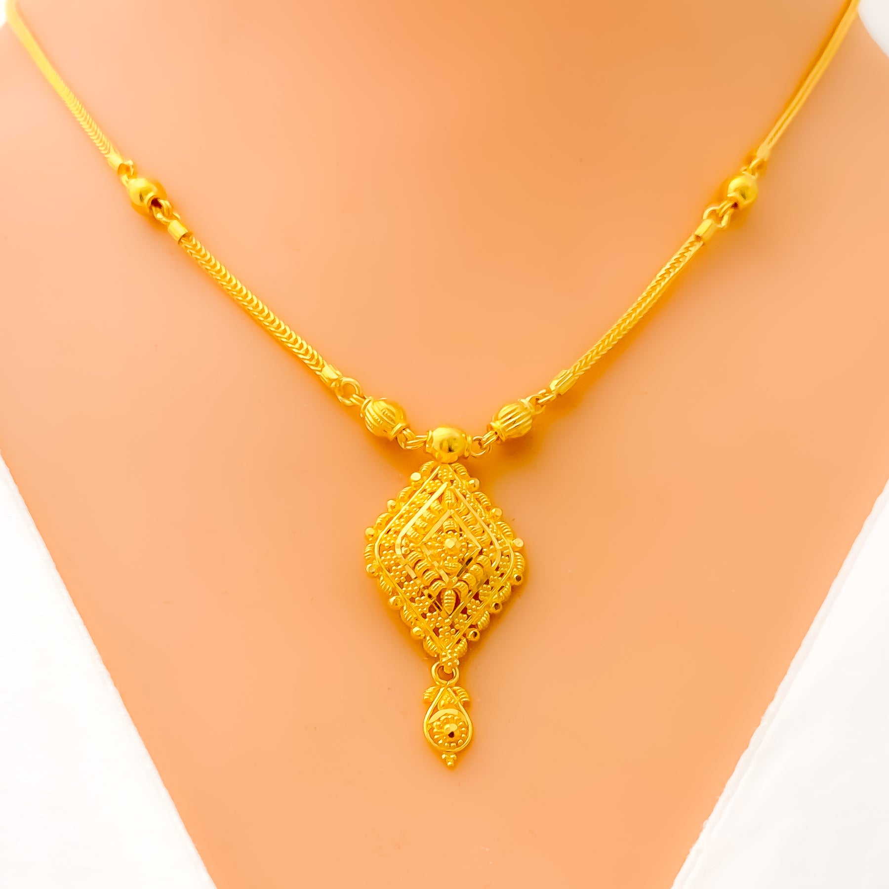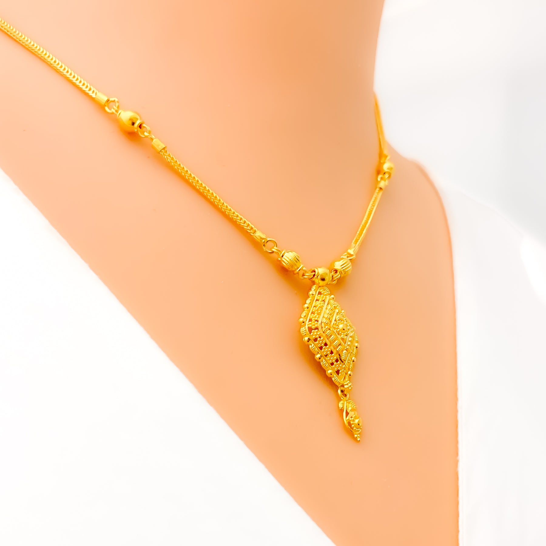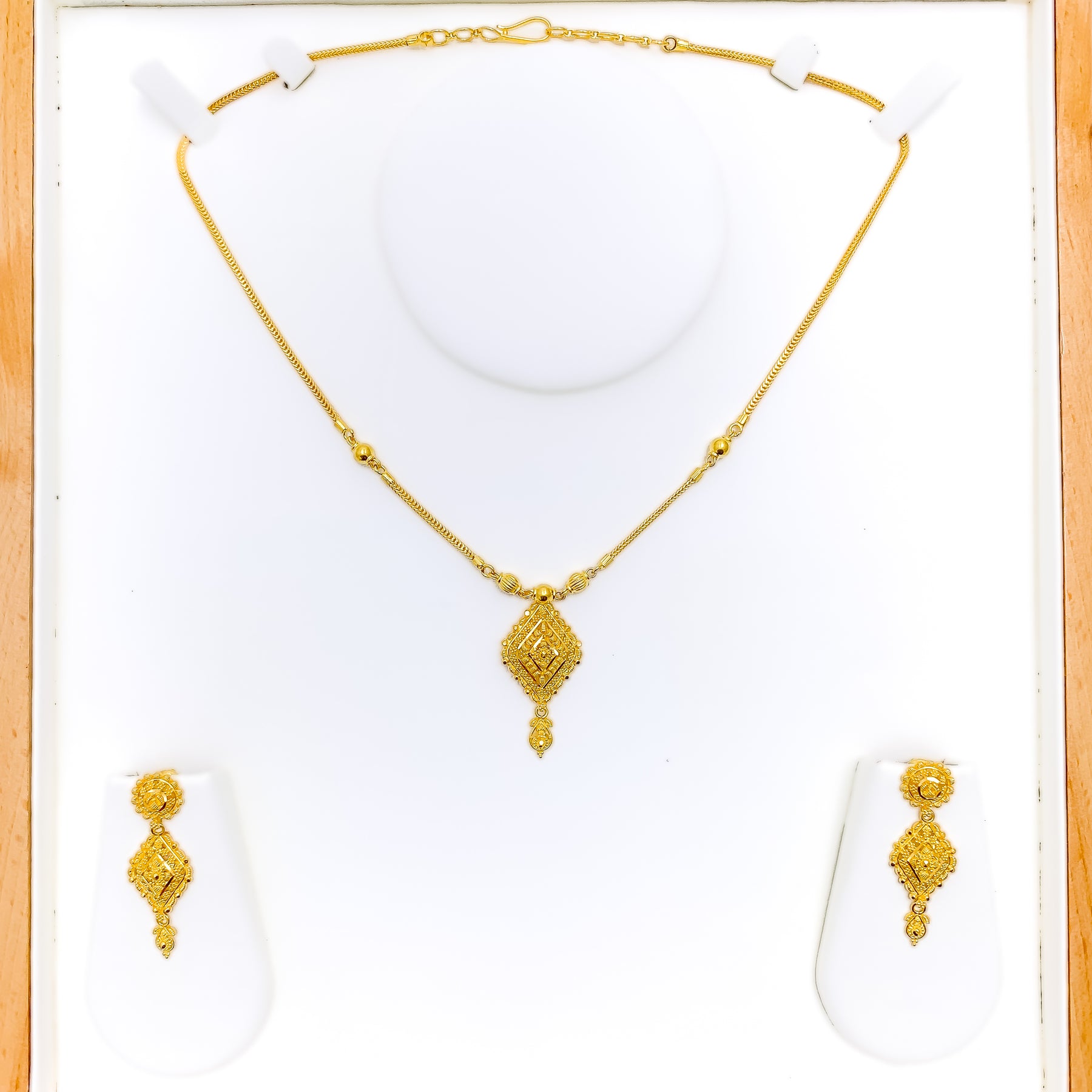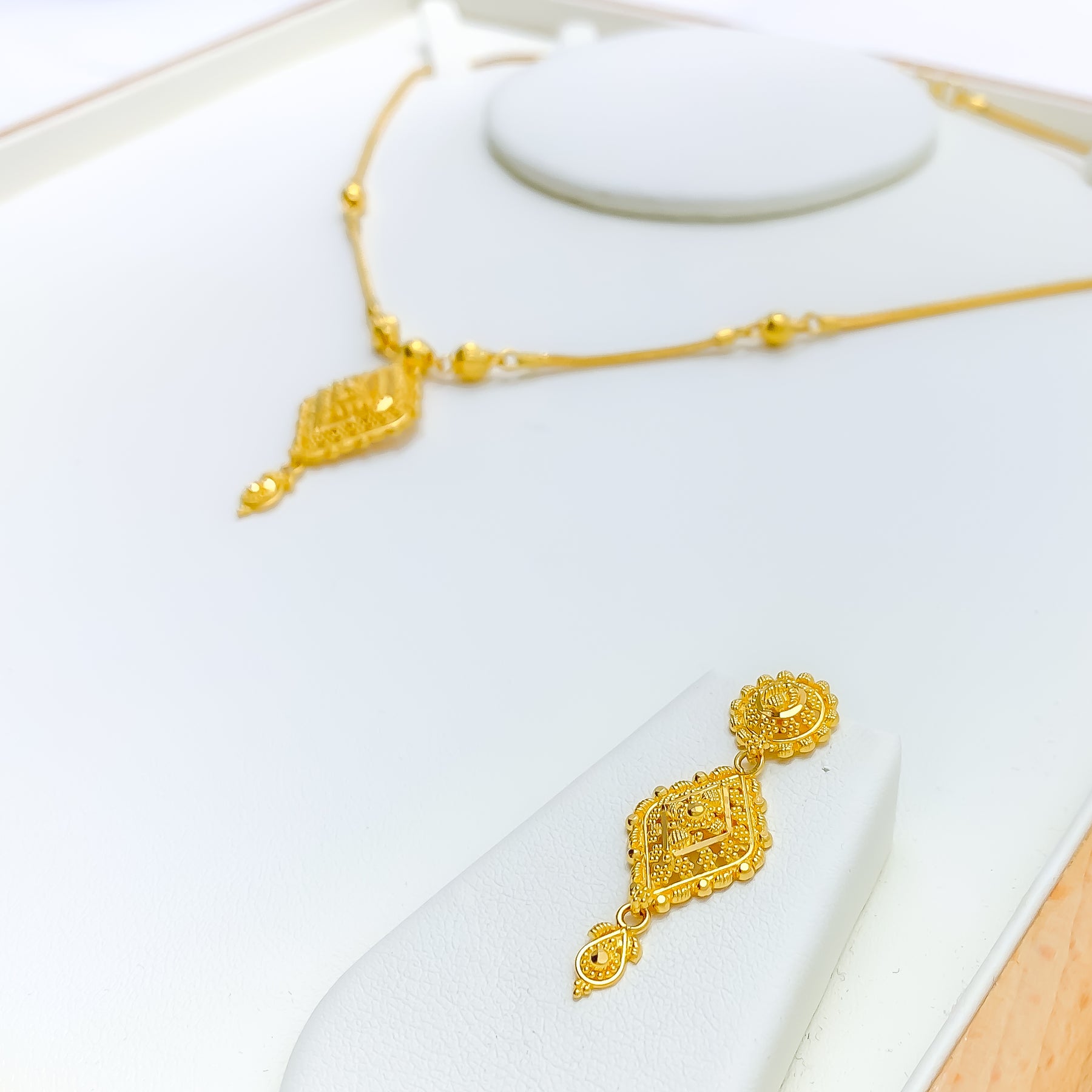 Beautifully designed, this 22k gold necklace set exudes timeless sophistication with its graceful form and radiant finish. Weighing 16.0 grams, it offers an elegant balance of refinement and luxury. The polished yellow gold surface enhances its warm, captivating glow. Measuring 16 inches with 1.5-inch earrings, it’s a stunning piece of enduring beauty.