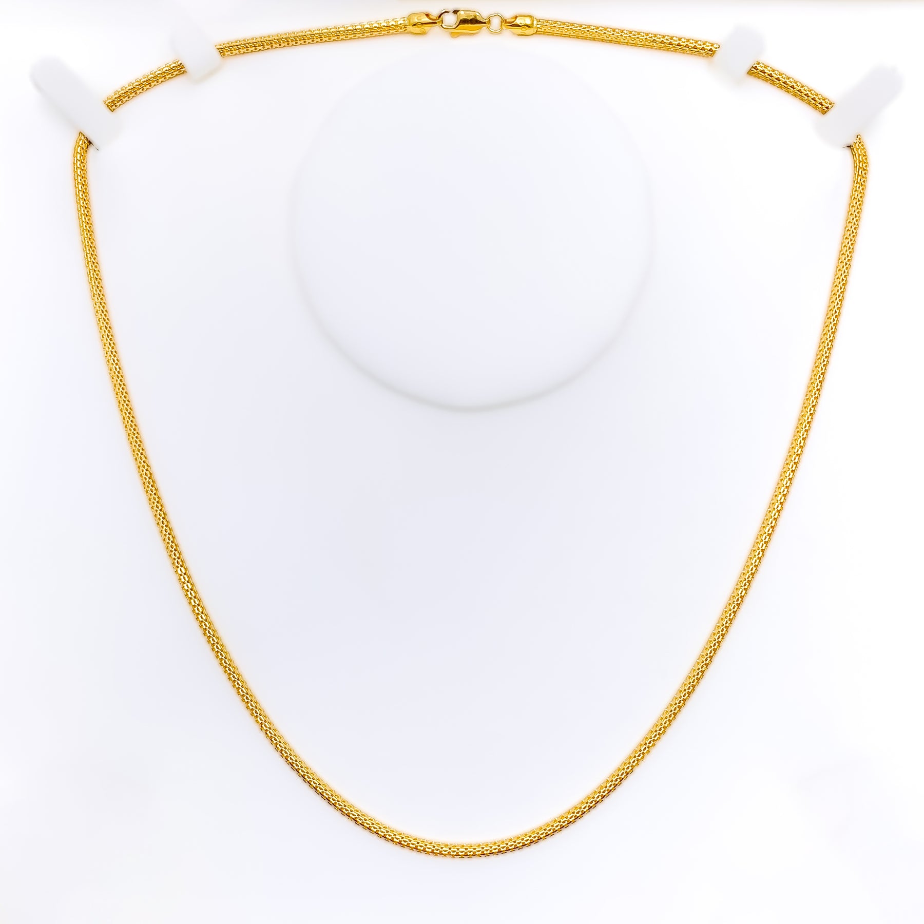 This 22k gold chain features a substantial 2.5mm rounded profile in a lightweight hollow design, offering impressive volume without added weight. Its smooth yellow gold finish radiates a polished, timeless elegance. Secured with a lobster lock, it's ideal for both layering and solo wear. A refined piece that balances boldness and everyday comfort.