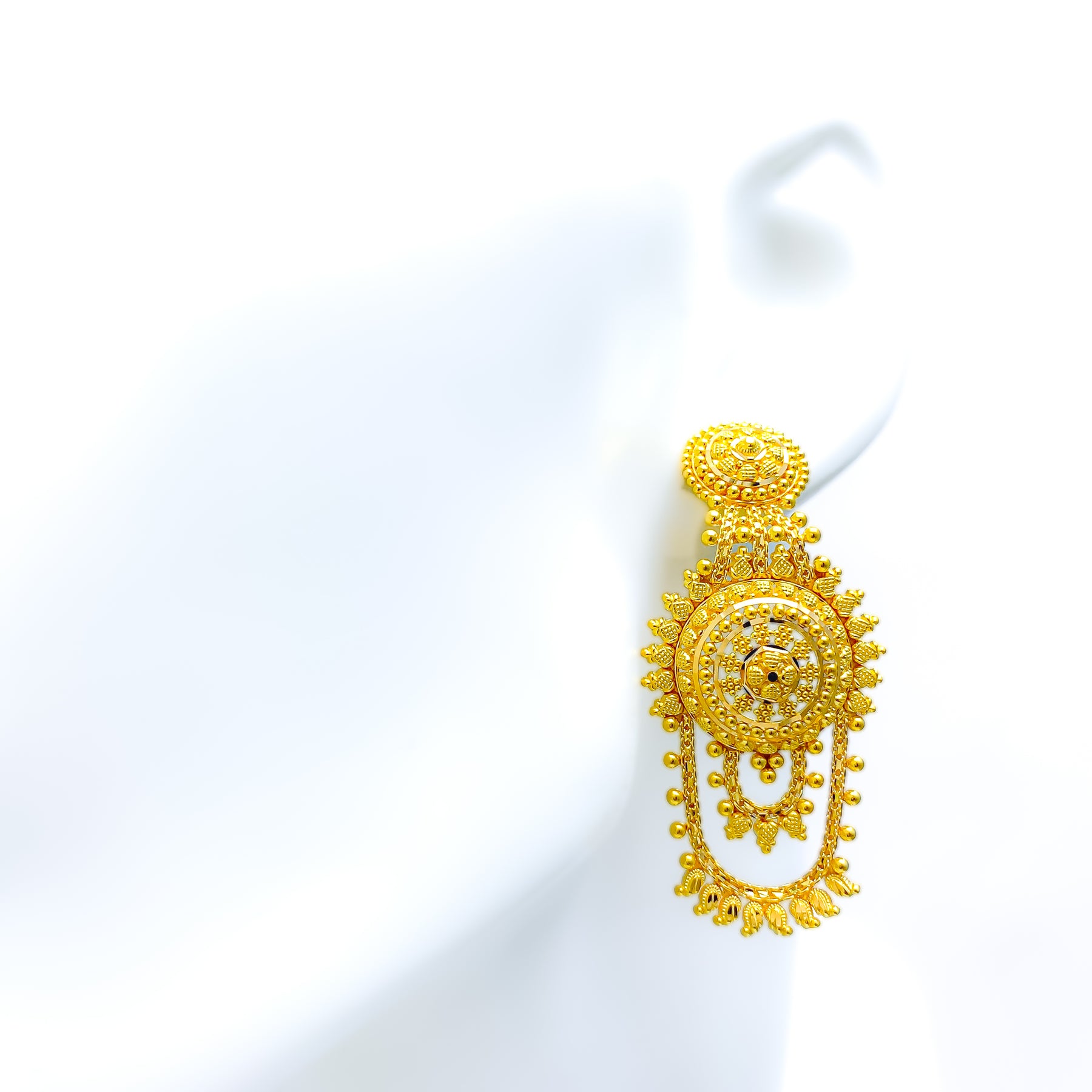 Heritage-inspired in design, these 22k yellow gold hanging earrings weigh a substantial 13.5 grams and feature a radiant polished finish that enhances their traditional gleaming appeal. Crafted in an elegant hanging style, they measure 2.2 inches in length, offering graceful movement and a striking visual presence. Designed for secure and comfortable wear, the earrings are fitted with dependable screw-back posts for added confidence. Rich in character yet timeless, these earrings deliver classic sophistication ideal for festive occasions and ceremonial elegance.
