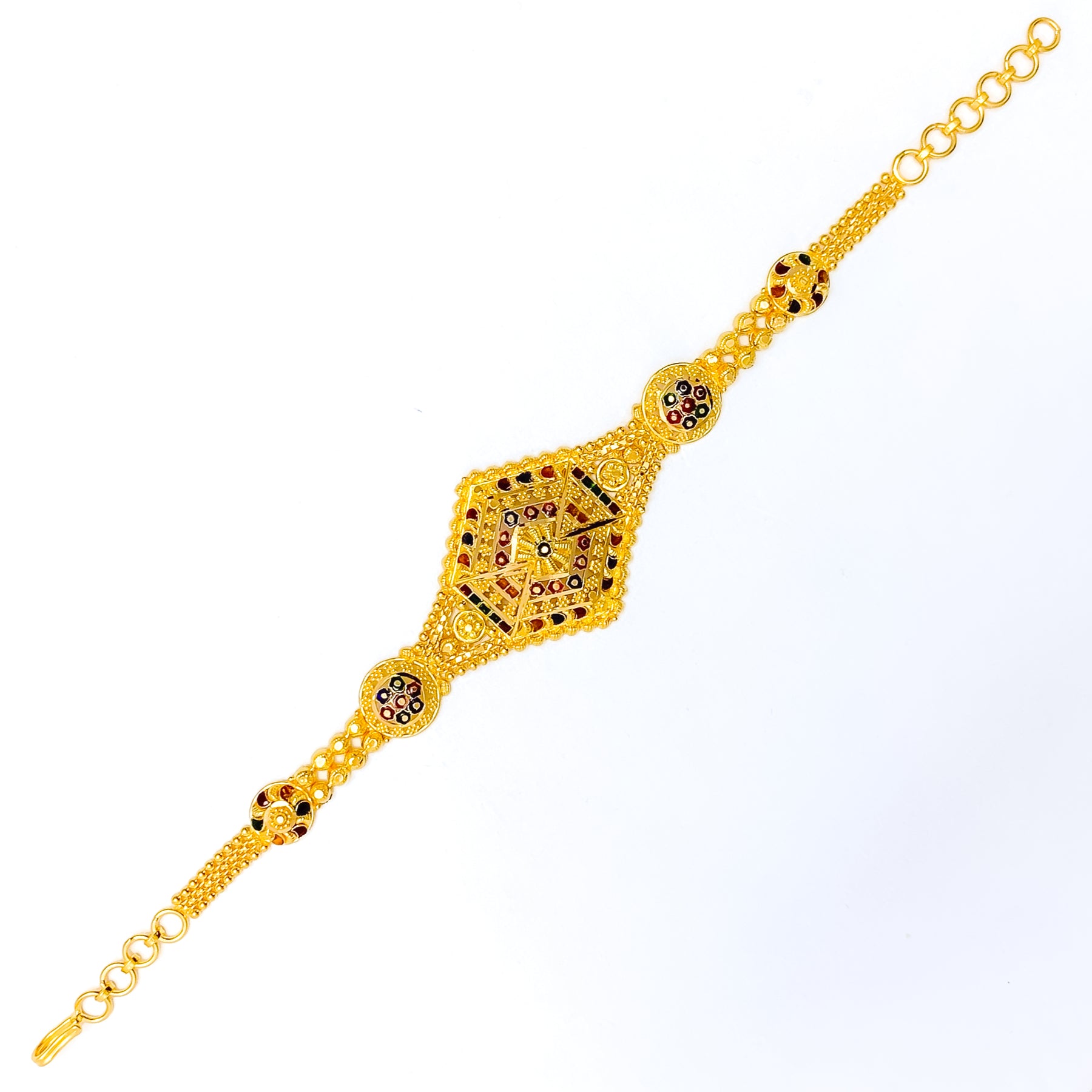 Radiating timeless beauty, this 22k yellow gold bracelet weighs 13.3 grams and features an intricate yet graceful design. Its 7.25" length includes 1.1" adjustable links for a perfect fit and finishes with a secure hook lock. A striking accessory that adds refined charm to any collection.