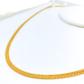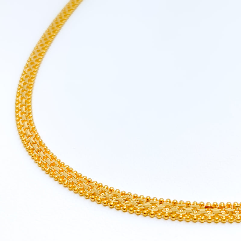 This sleek 22k yellow gold chain features a bold flat design with a broad 4mm width for noticeable elegance. At 20 inches in length, it rests comfortably at the collarbone, ideal for layering or standalone wear. The polished surface offers a high-shine, mirror-like finish. Secured with a lobster lock, it's both refined and reliable for daily luxury.