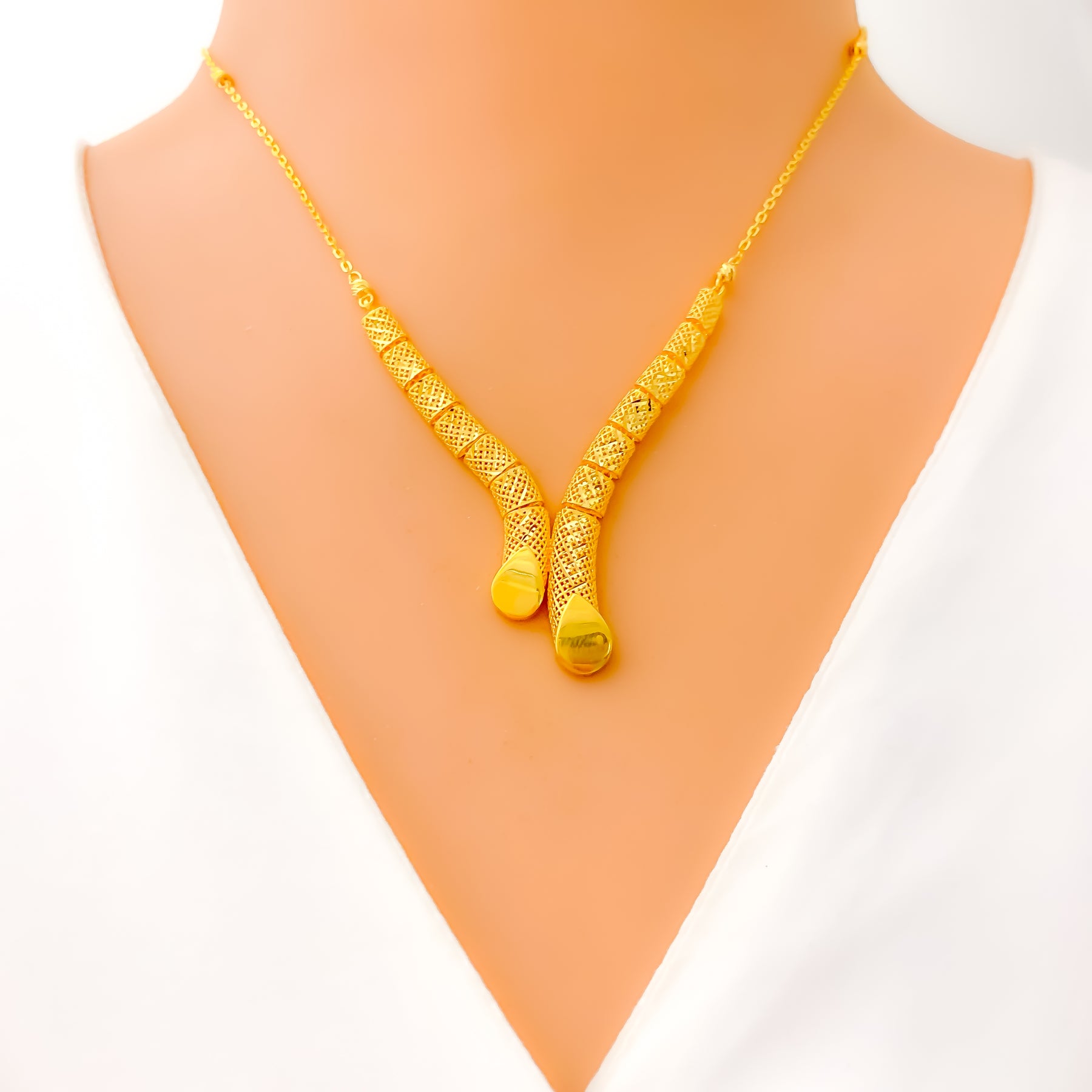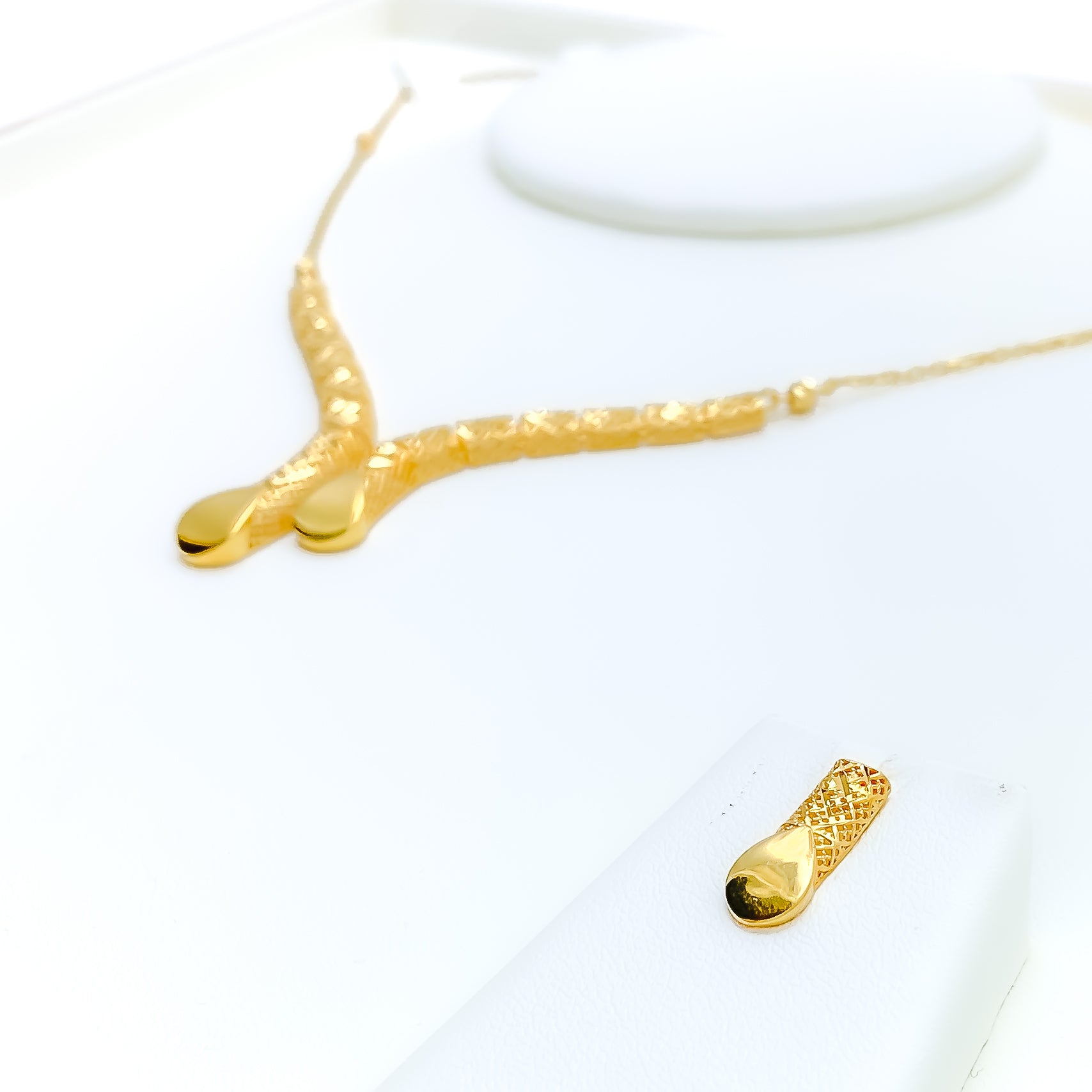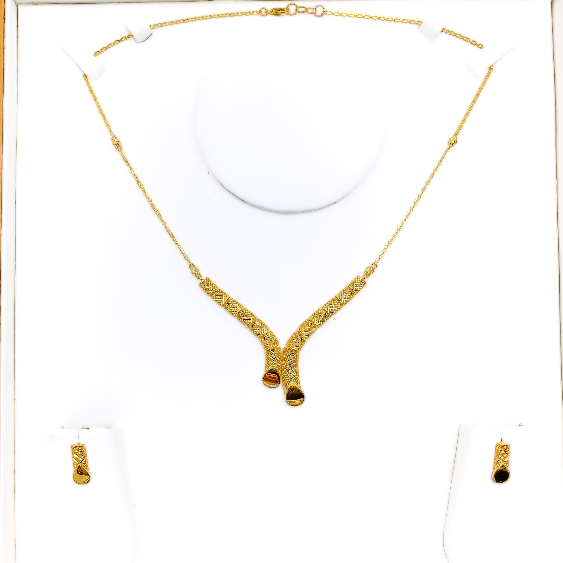 Modern 22k yellow gold set weighs 9.0 grams, presenting a contemporary lightweight design with warm radiant charm. The 16 inch length with 0.75 inch drop includes 0.6 inch adjustable links and lobster lock. Matching earrings included measure 0.6 inches for a balanced coordinated look. Push back posts ensure secure comfortable wear with polished elegant appeal.