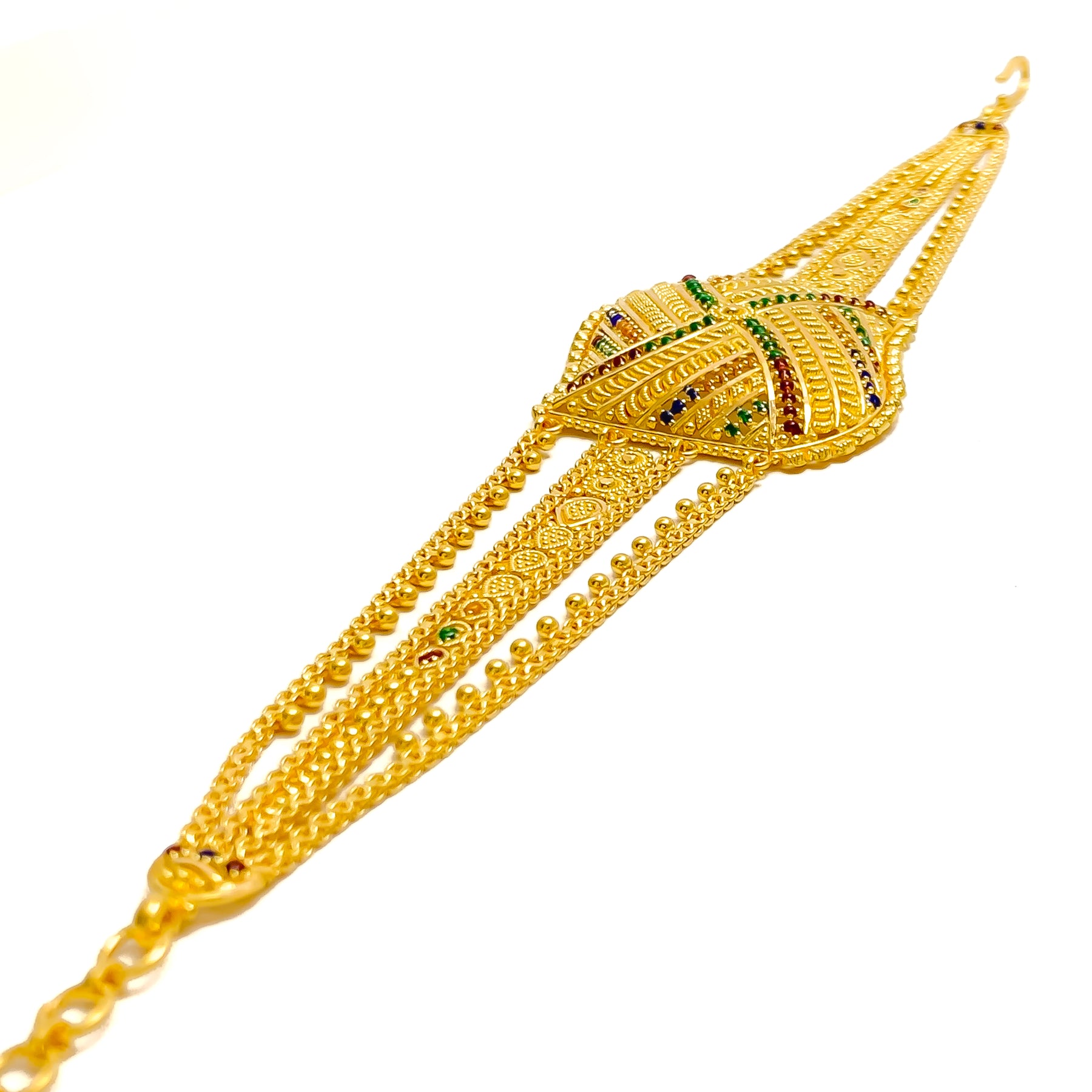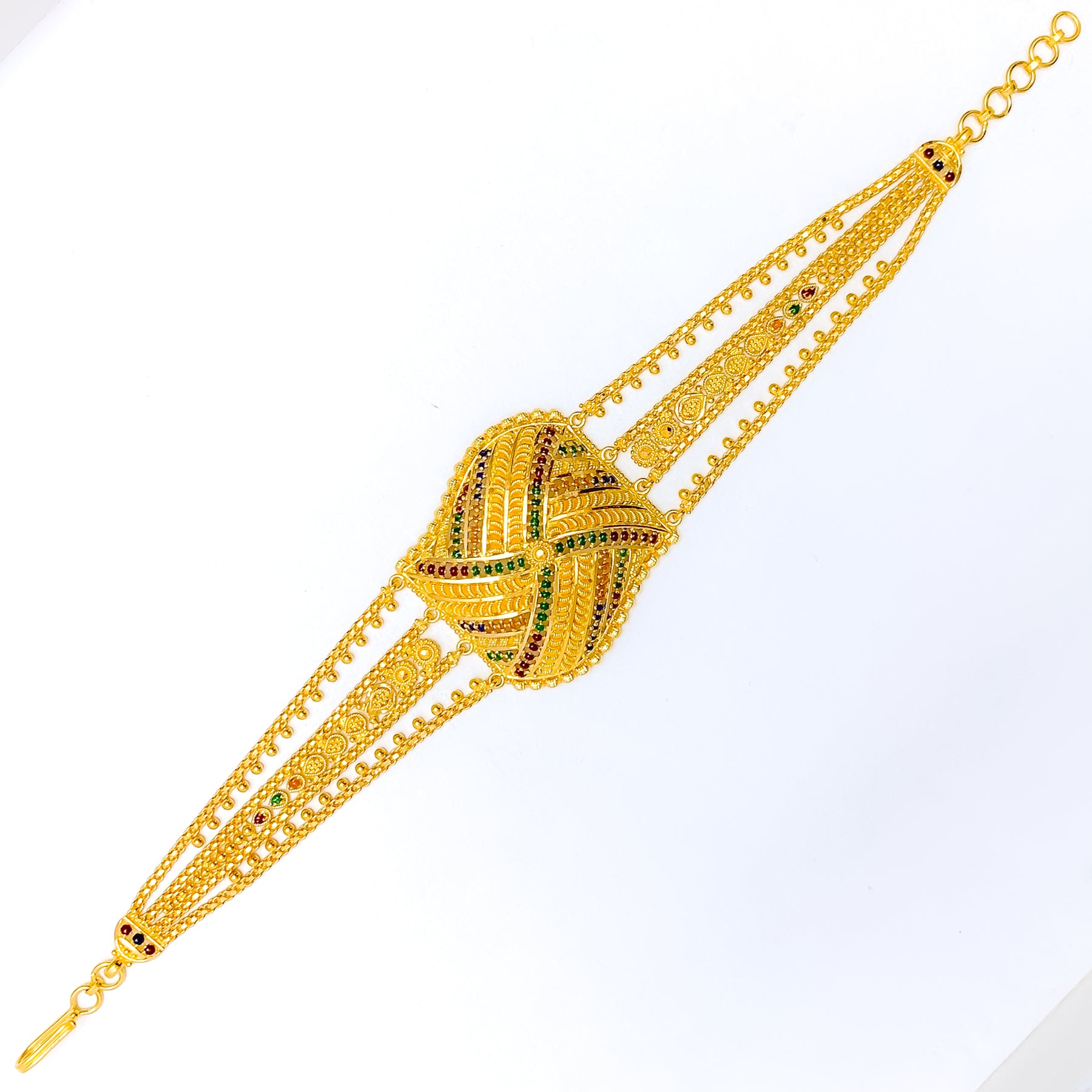 Expertly crafted in 22k yellow gold, this 22.8-gram statement bracelet features bespoke detailing that showcases rich texture and bold design. Measuring 8.25 inches with 0.9-inch adjustable links, it secures with a classic hook lock. A commanding piece that blends custom artistry with timeless elegance.