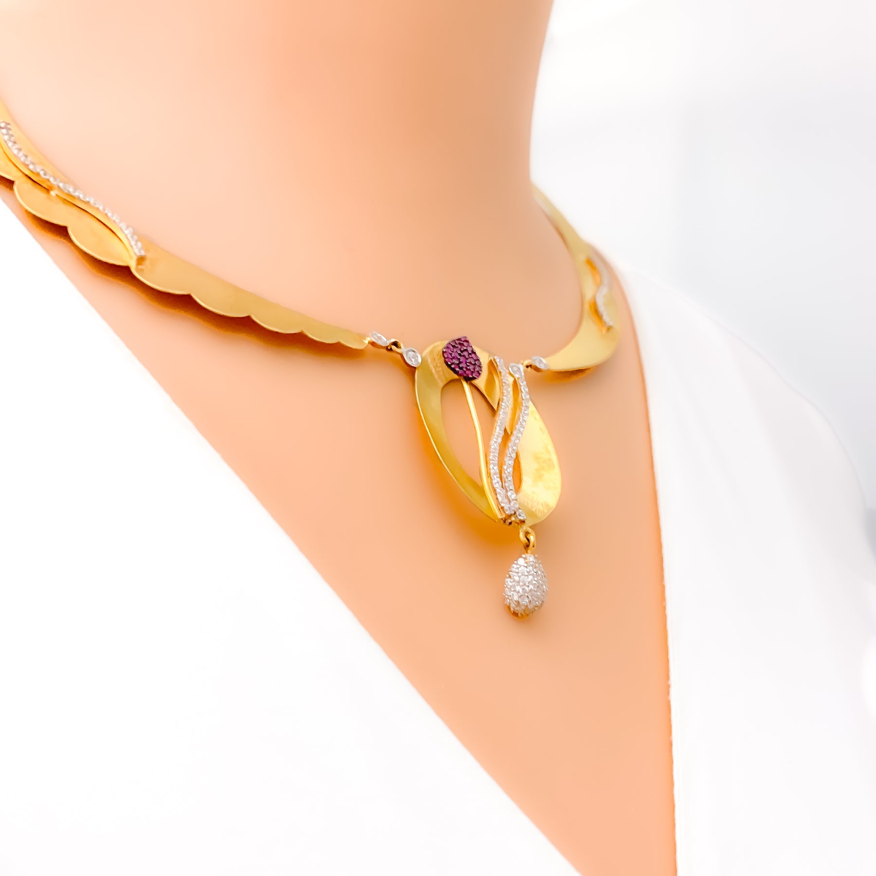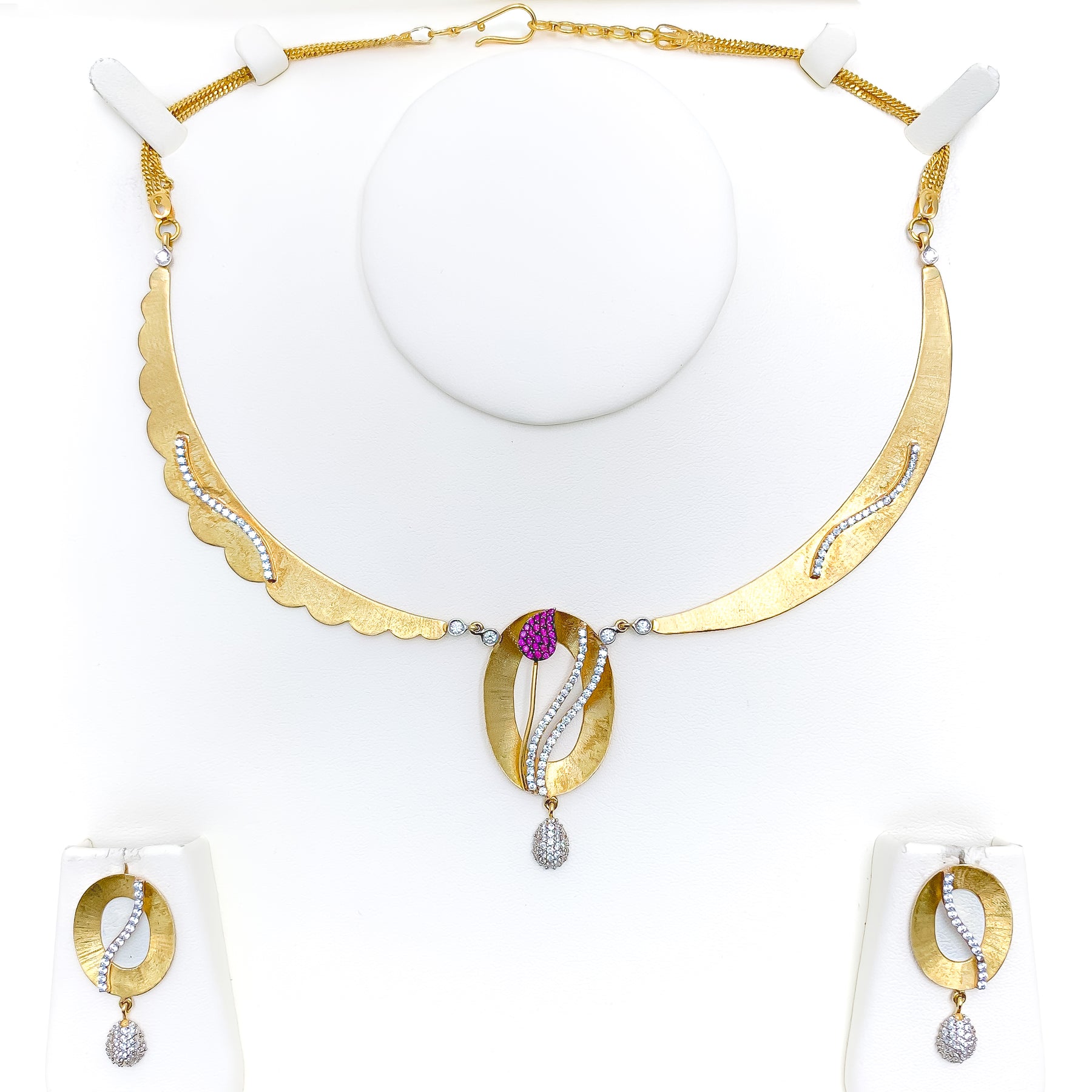Crafted in 18k yellow gold with a weight of 28.0 grams, this elegant set radiates refined brilliance. Sparkling cubic zirconia stones accentuate the oval-inspired design, enriched by a polished finish for luminous appeal. The 16-inch necklace with a 1.9-inch drop embodies graceful sophistication, paired with 1.5-inch matching earrings. Completed with a hook lock and secure screw-back posts, it is a captivating choice for festive and formal occasions.