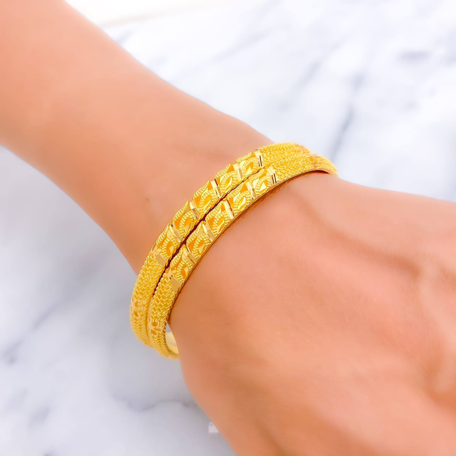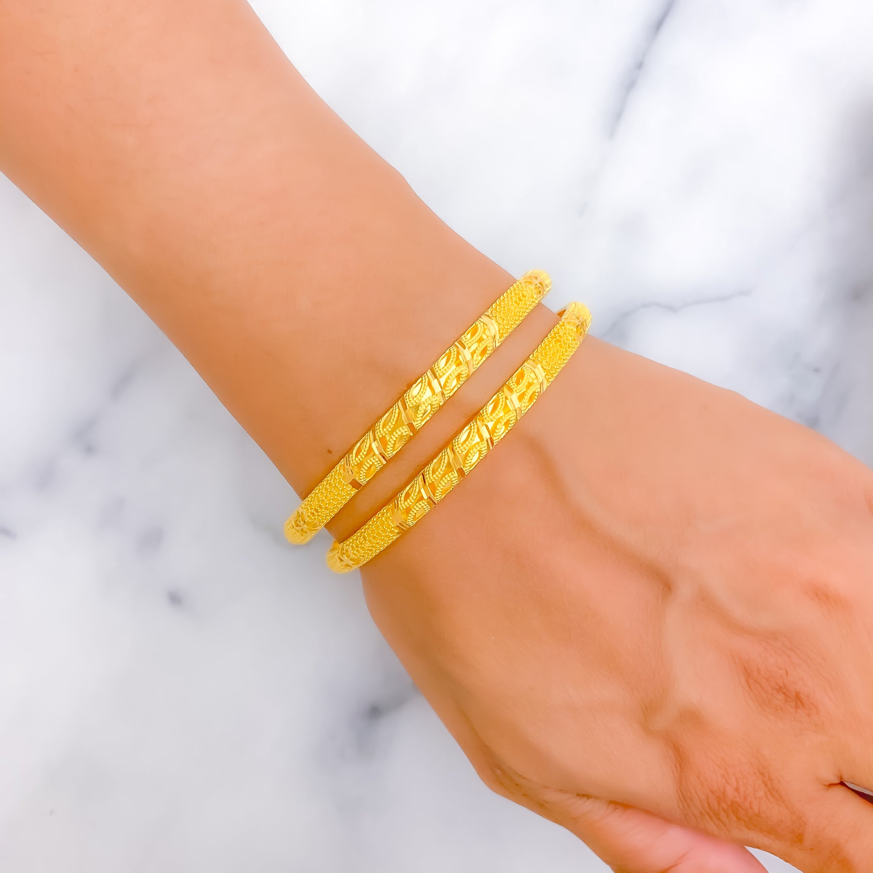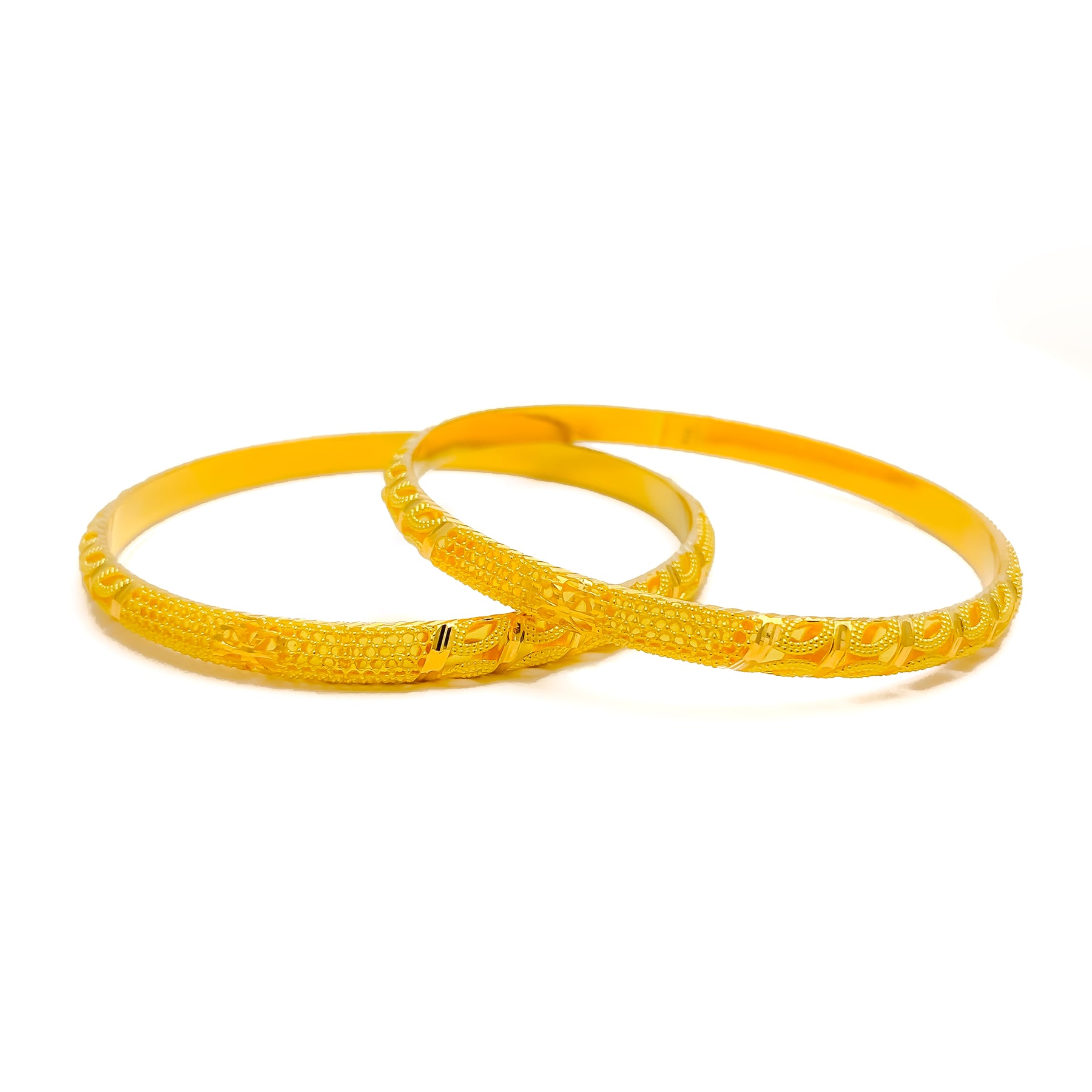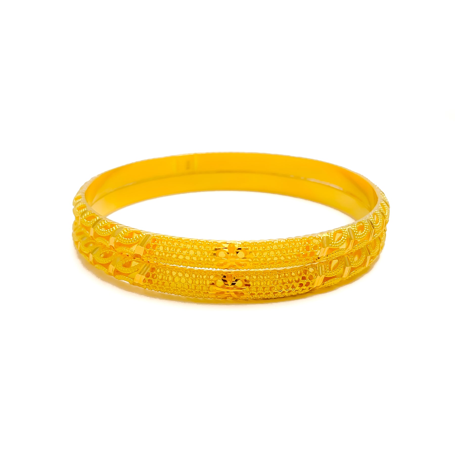 Intricately crafted with graceful leaf-inspired patterns, this 22k gold bangle pair radiates refined charm and natural elegance. Weighing 24.2 grams with a 2.45" opening, the non-openable bangles make a lasting impression with their timeless beauty and delicate sophistication.