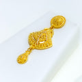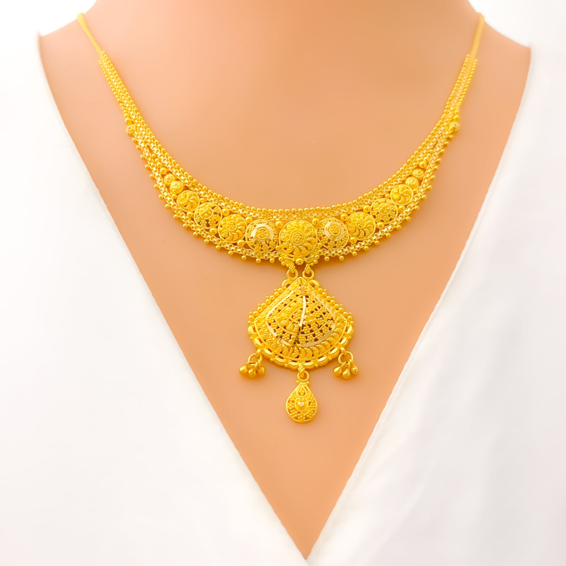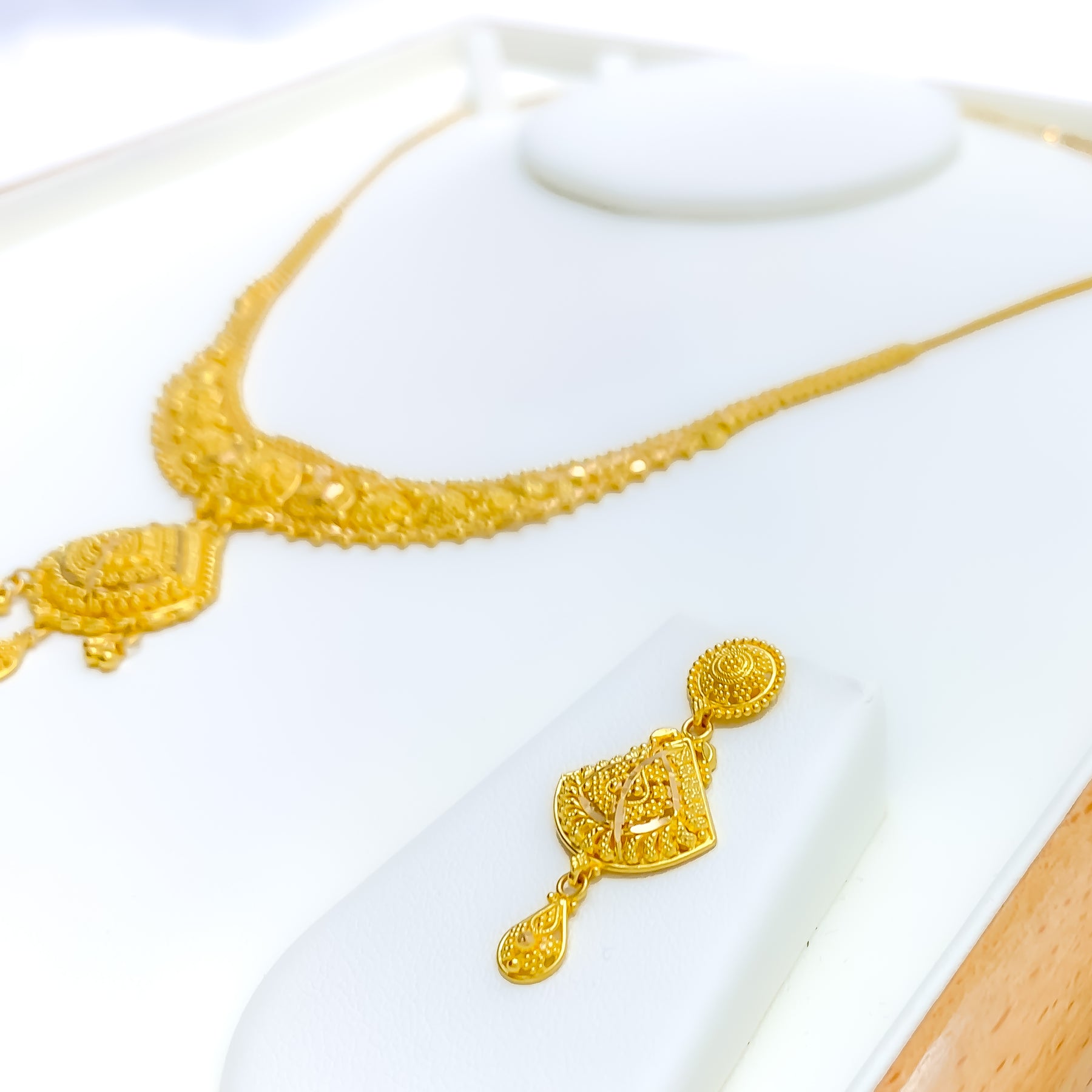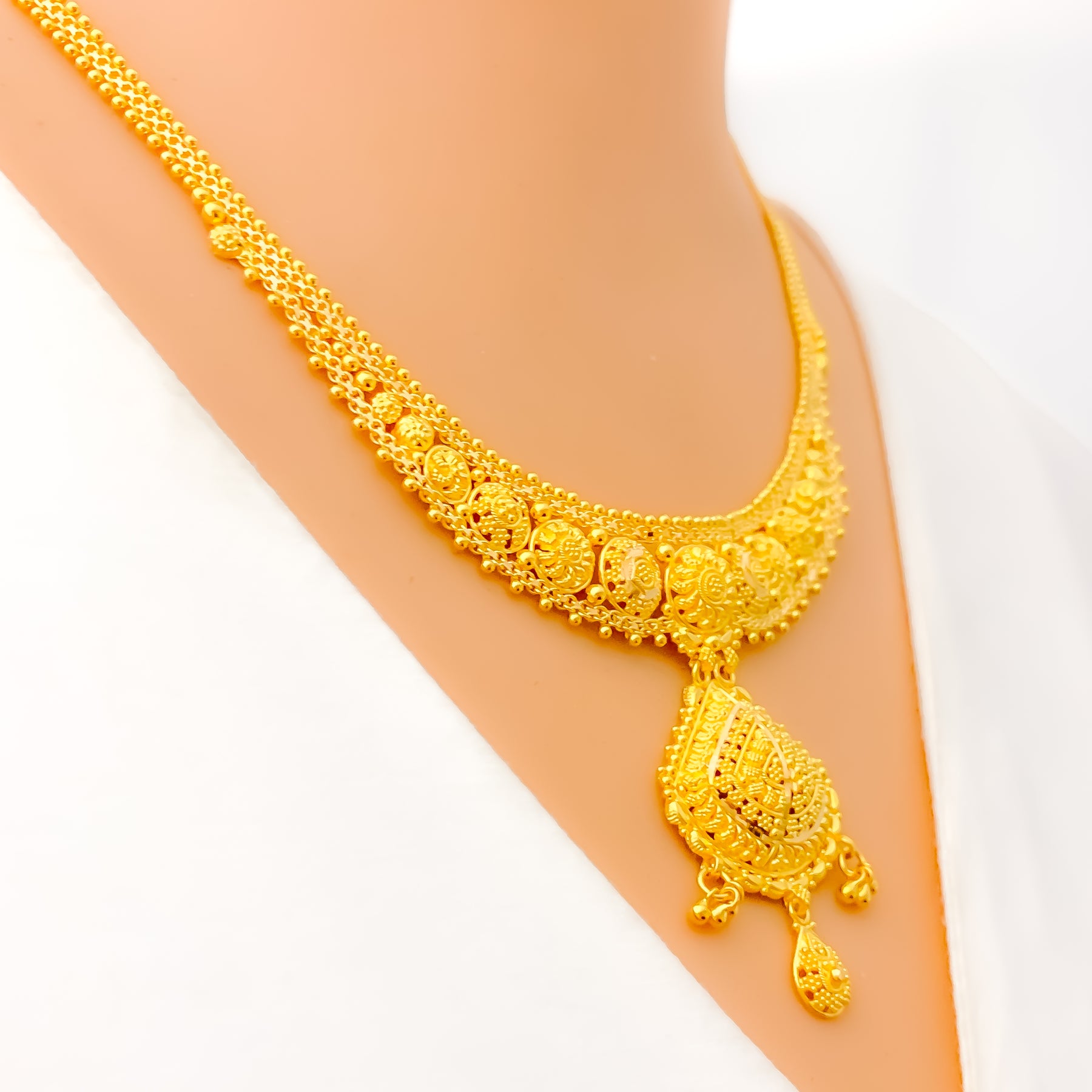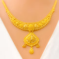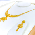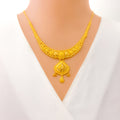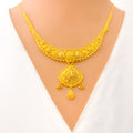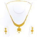 Elegant and fluid, this 22k yellow gold necklace set weighs 23.1 grams and features a beautifully draped design with a 1.5" drop that adds graceful movement to the neckline. The 16" set includes 0.5" adjustable links and secures comfortably with a classic hook lock. Complemented by matching 1.5" earrings with screw-back posts, this radiant ensemble is ideal for weddings, traditional celebrations, or refined evening wear.
