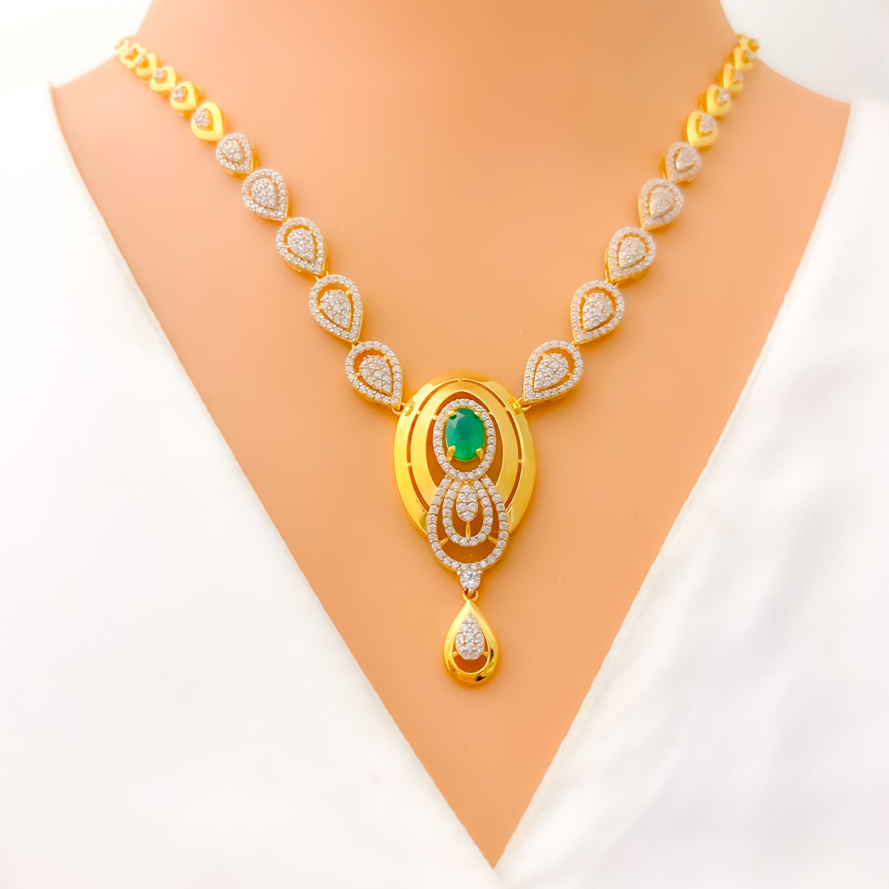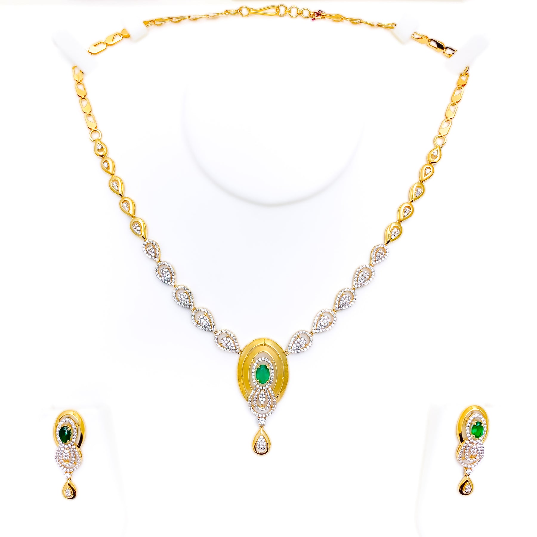 This striking 22k yellow gold necklace set, weighing 26.6 grams, highlights an elegant oval motif adorned with sparkling cubic zirconia. The 17" necklace with a 1.75" drop is complemented by 1.4" screw-back earrings for perfect harmony. A polished finish enhances its radiant brilliance, making it a refined statement. A sophisticated three-piece ensemble designed to elevate both formal and festive occasions.