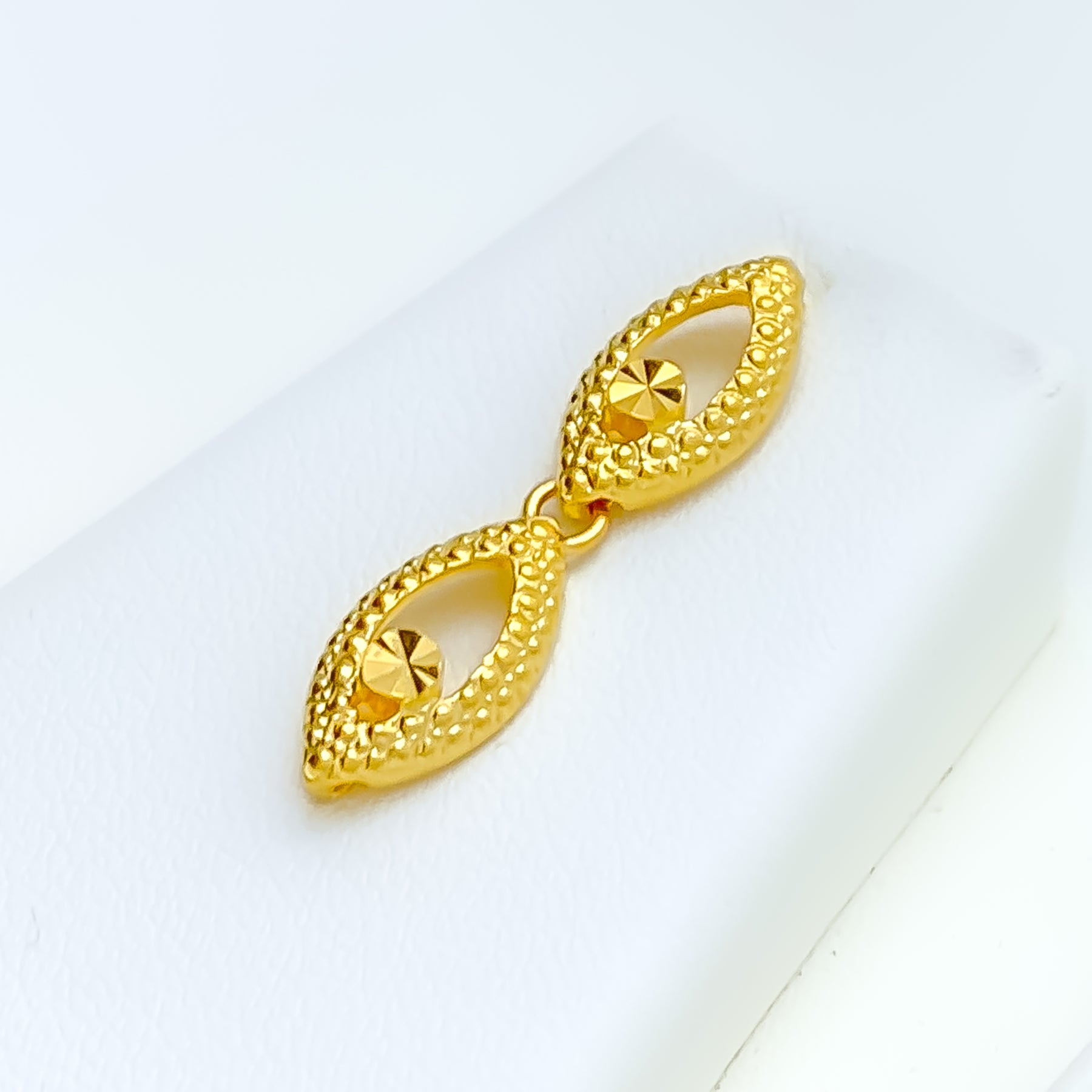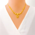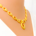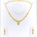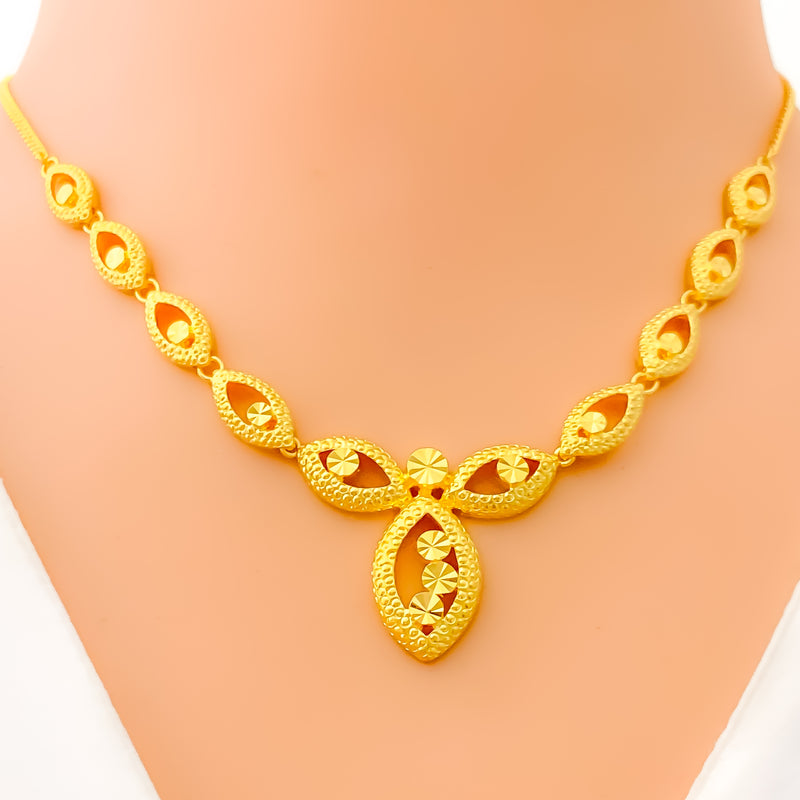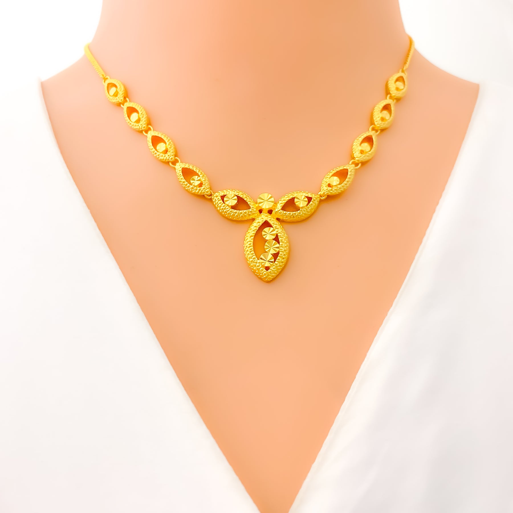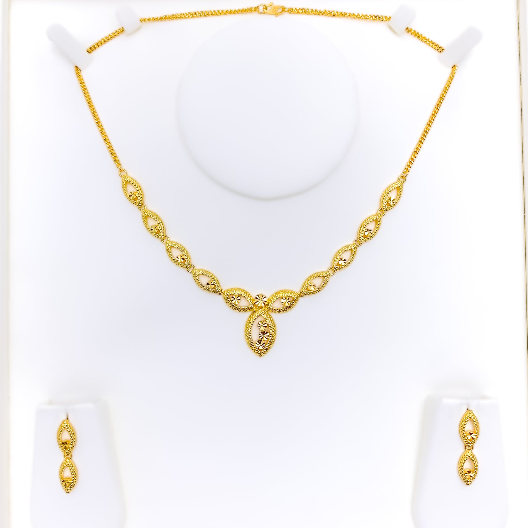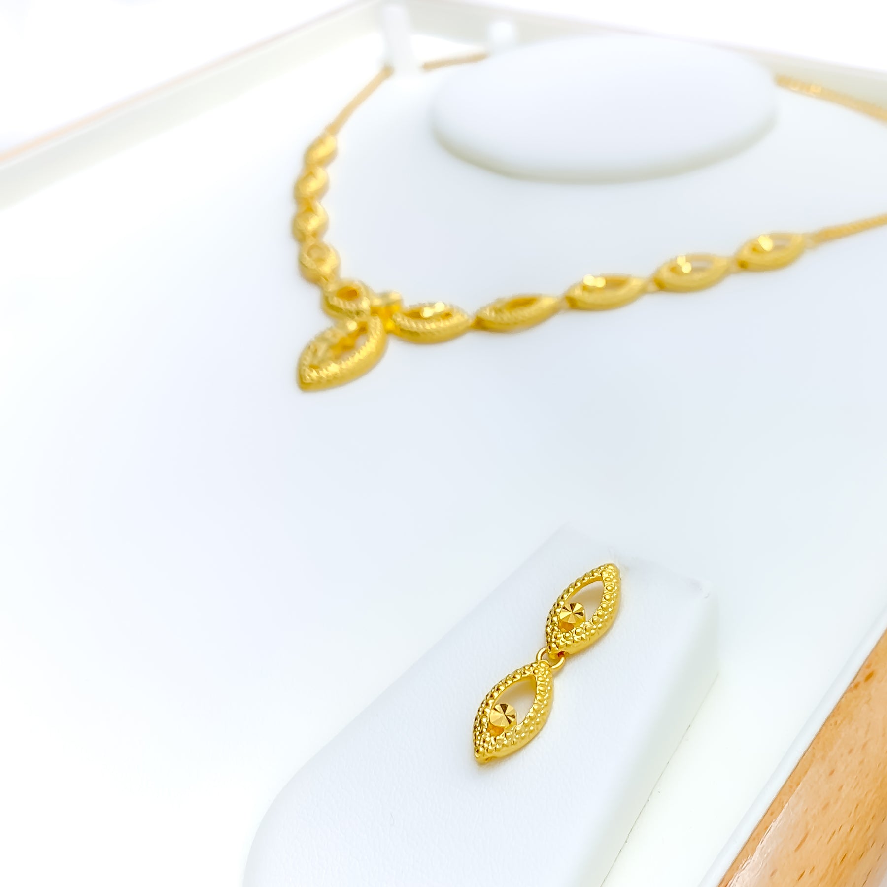 Crafted in luxurious 22k yellow gold and weighing 23.7 grams, this stunning necklace set features elegant marquise-shaped elements that exude regal charm and refined sophistication. The 16-inch necklace drapes gracefully along the neckline and secures with a classic S lock for reliable and comfortable wear. Accompanied by 1.2-inch matching earrings with push-back posts, the set delivers harmonious design and radiant presence. A perfect choice for grand celebrations, this piece blends opulence and artistry in every golden detail.