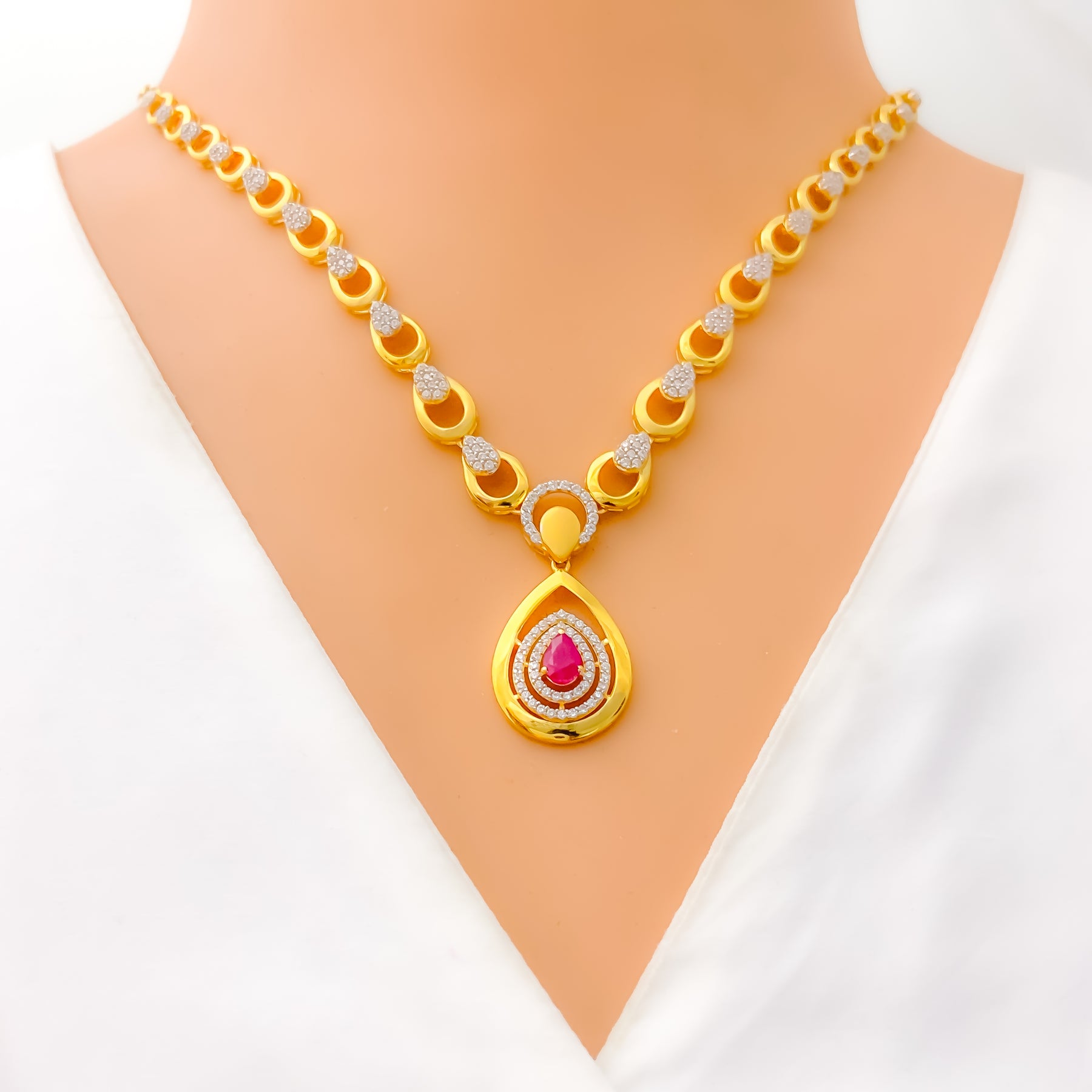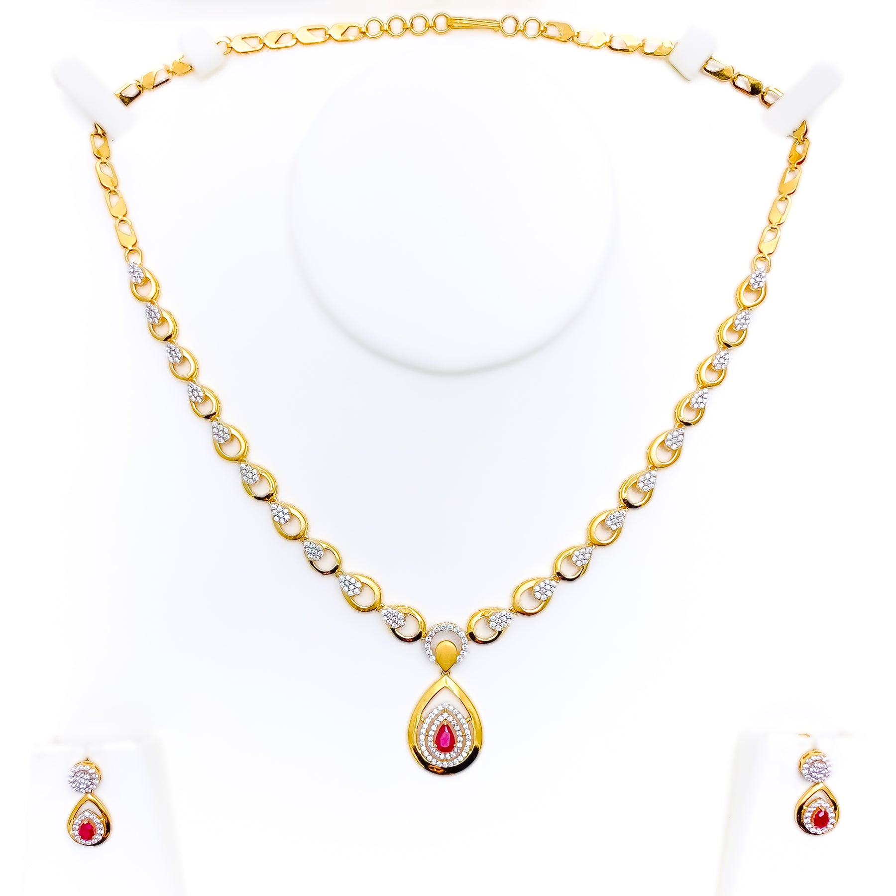 This exquisite 22k yellow gold necklace set, weighing 21.1 grams, showcases a graceful drop design highlighted with radiant cubic zirconia. The 18" necklace with a 1.25" drop is paired with 0.75" screw-back earrings for a refined finish. Its polished surface enhances the luminous brilliance, offering timeless charm. A sophisticated three-piece ensemble perfect for elevating both formal and festive attire.