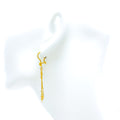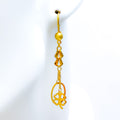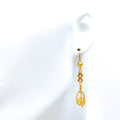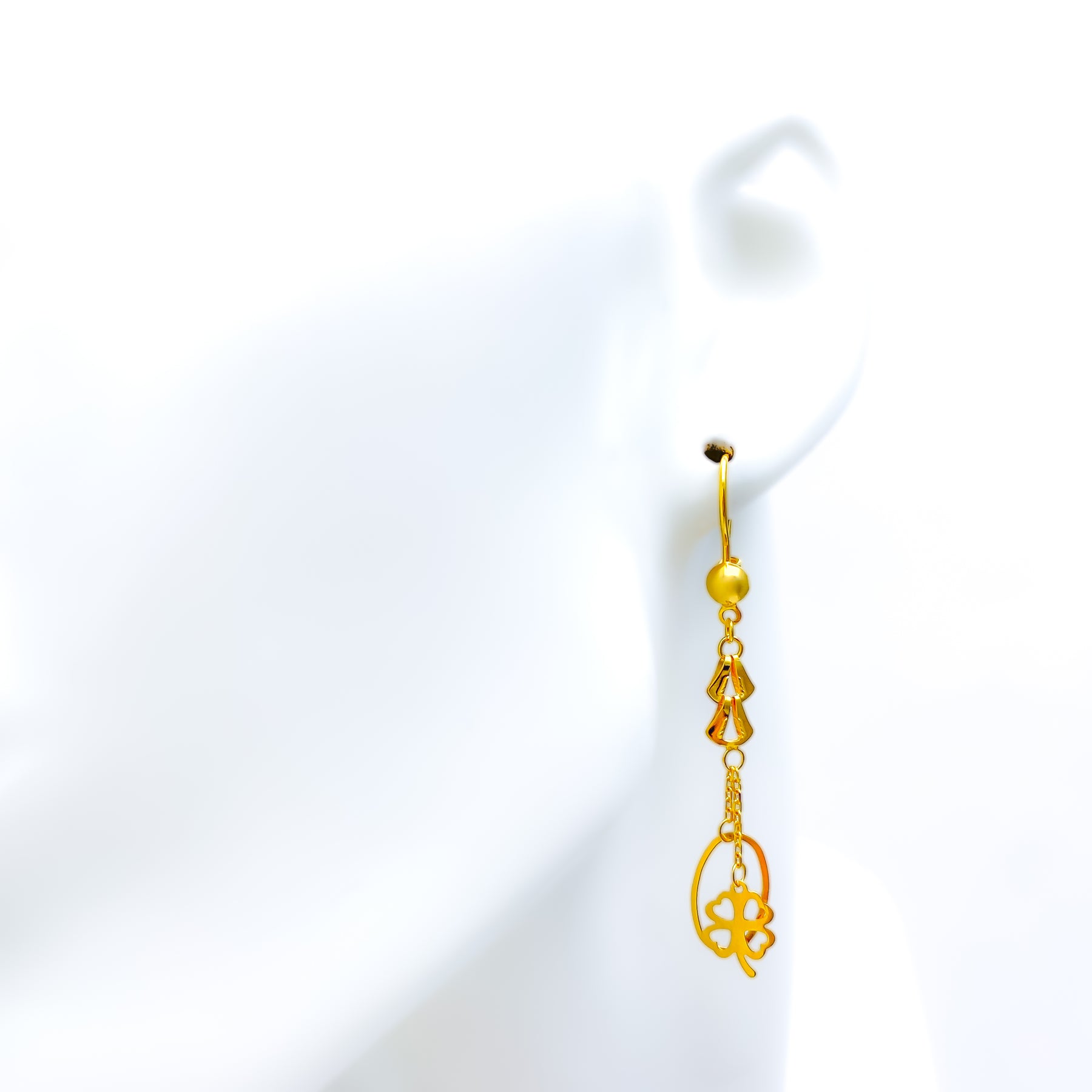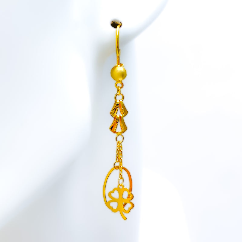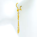 Shimmering with refined brilliance, these 2.6-gram earrings in 21k yellow gold feature a graceful 2.5-inch hanging form. Their polished finish and classic hook backs offer both comfort and charm. Designed for those who favor subtle sparkle, they add an elegant touch to any look.