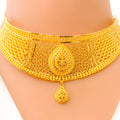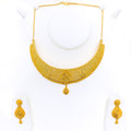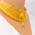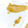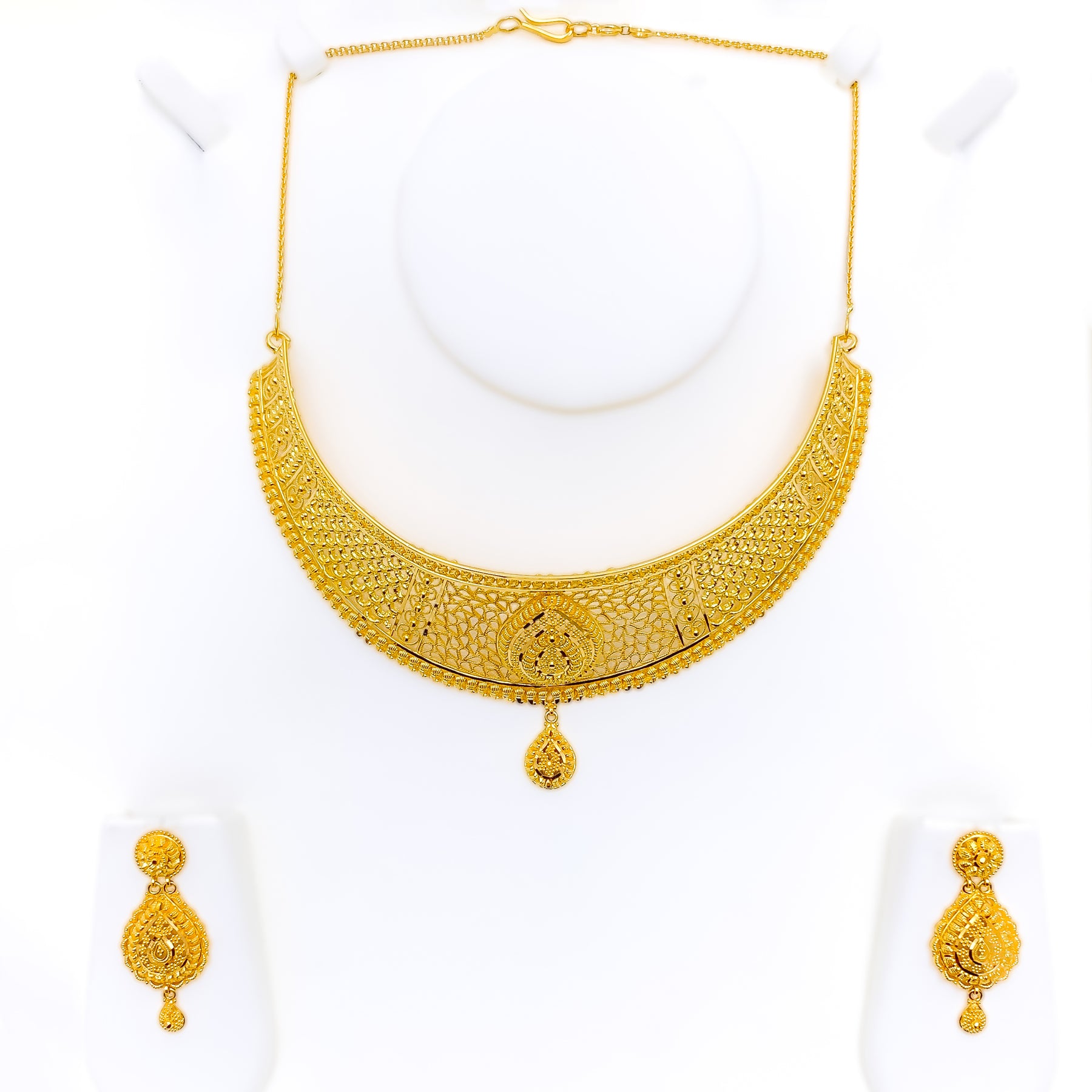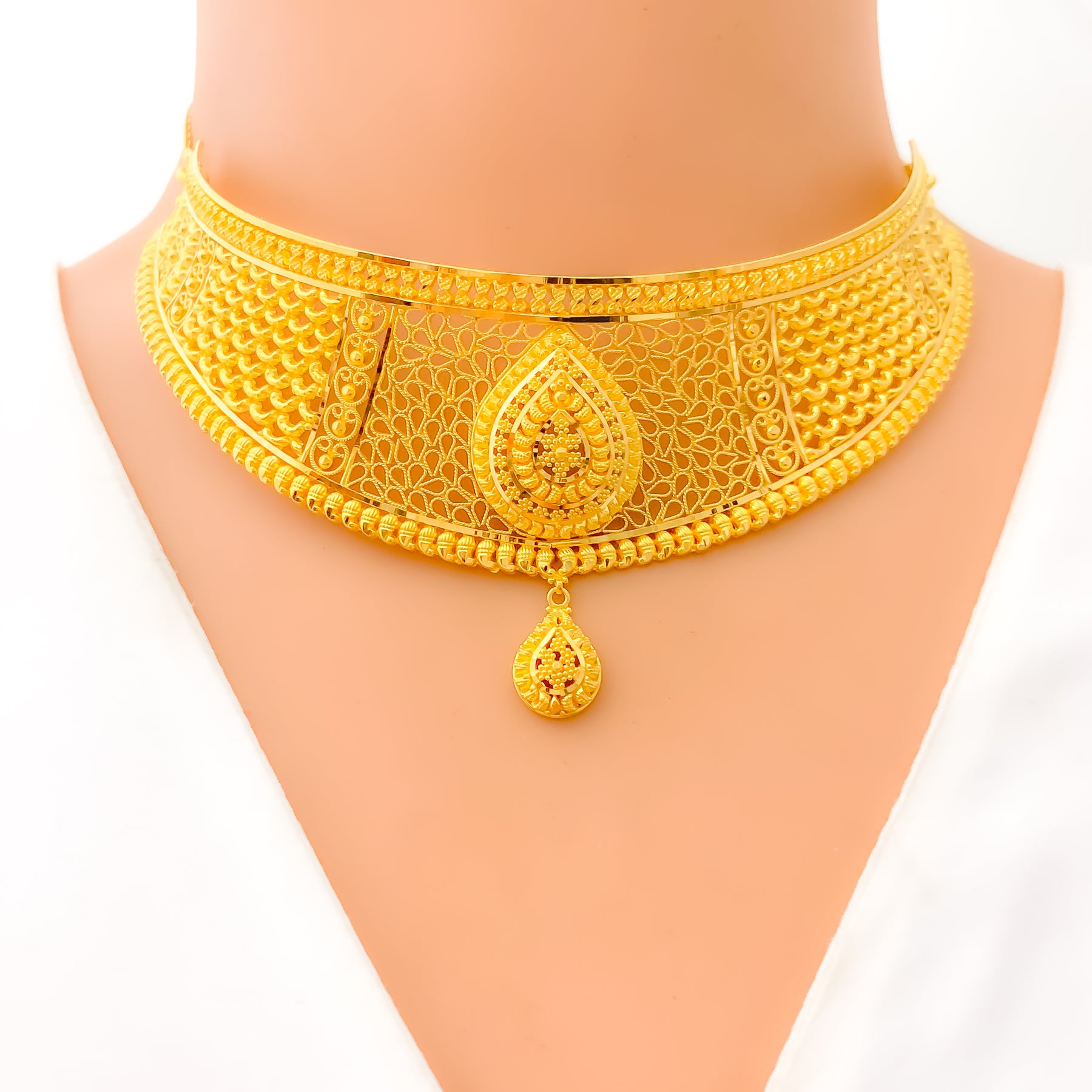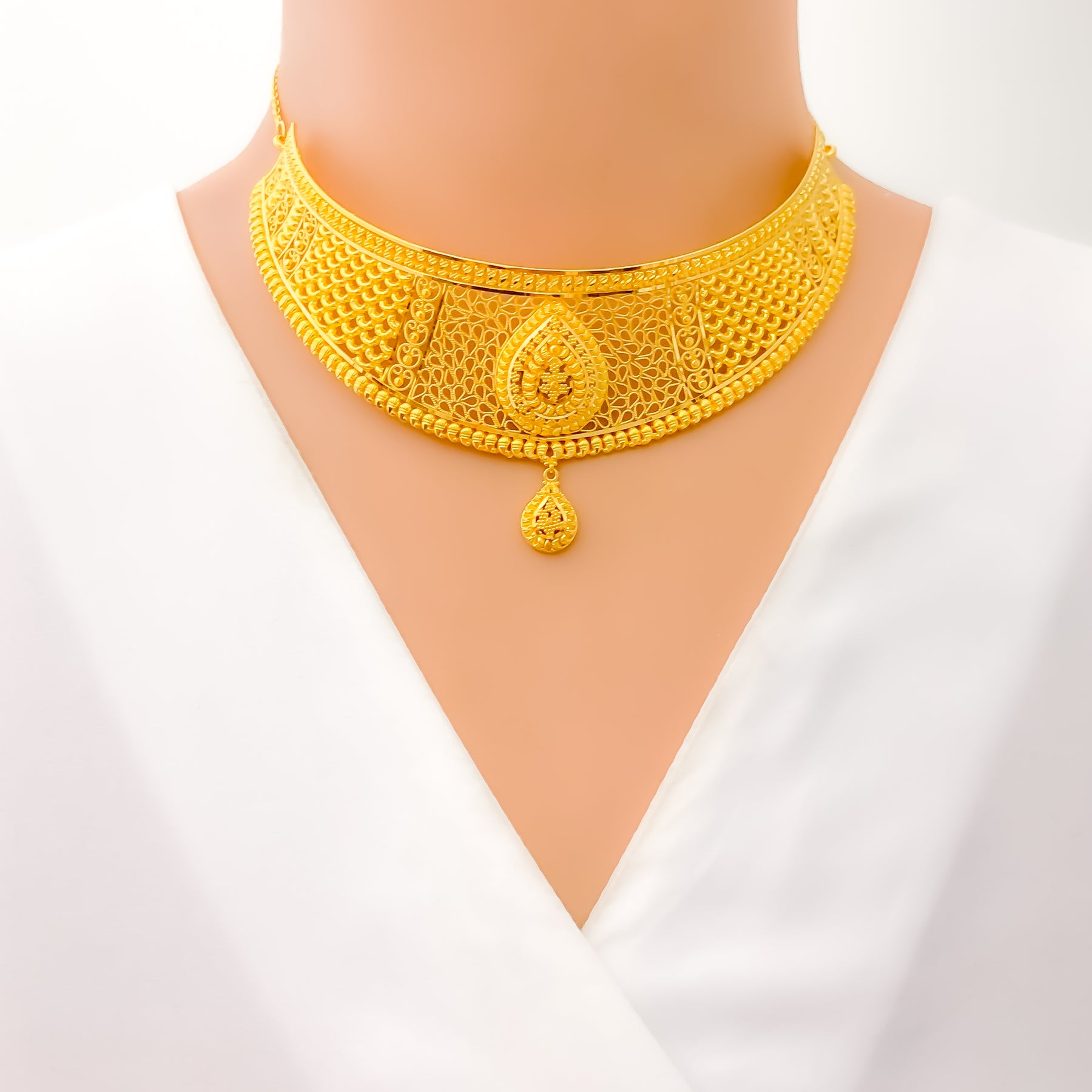 Opulent and detailed, this 42.2-gram choker set in 22k yellow gold showcases intricate filigree work with a graceful 0.6-inch drop. The 15-inch necklace includes 0.5-inch adjustable links and secures with a classic hook lock. Complete with 1.5-inch screw-back earrings, it exudes timeless decadence and artistry.