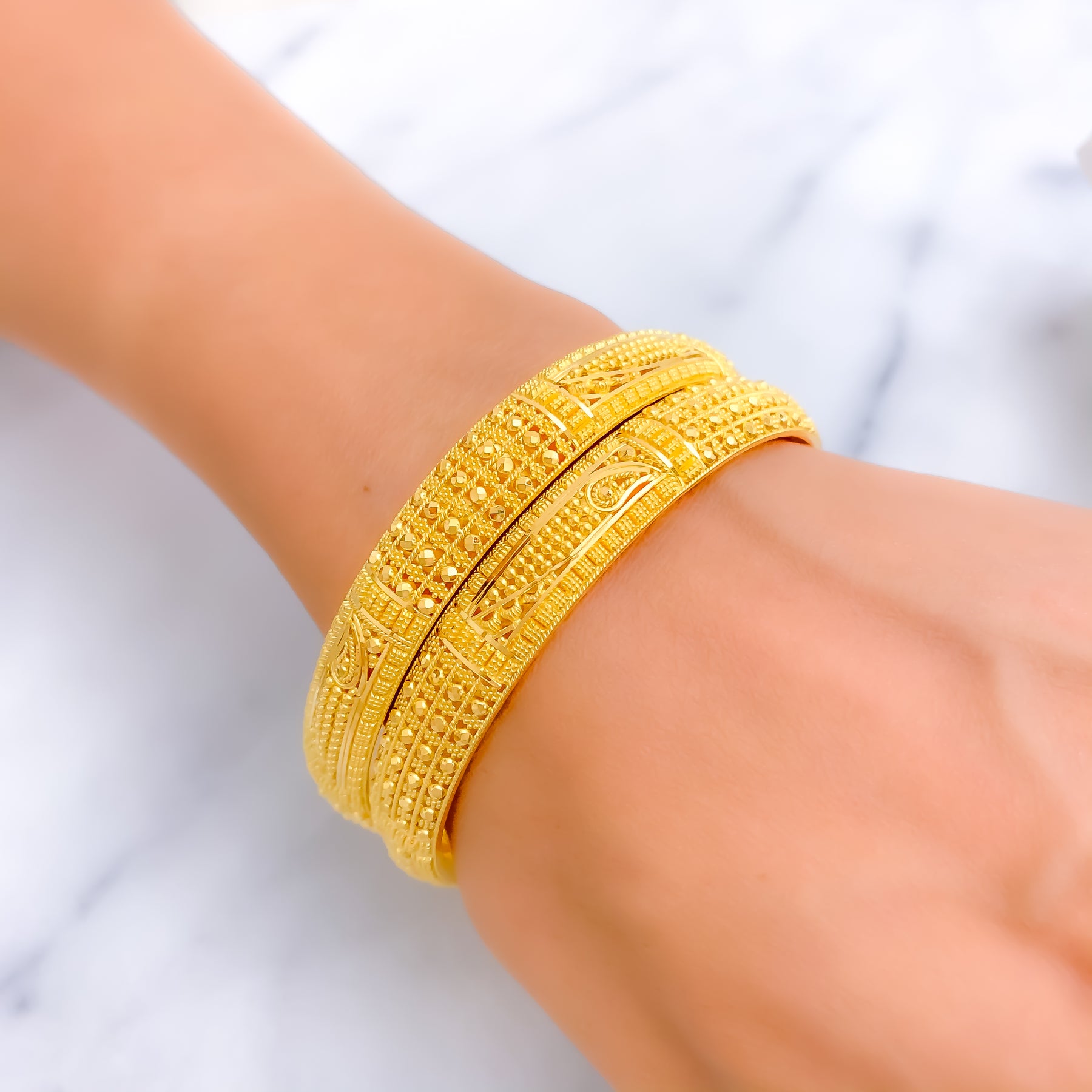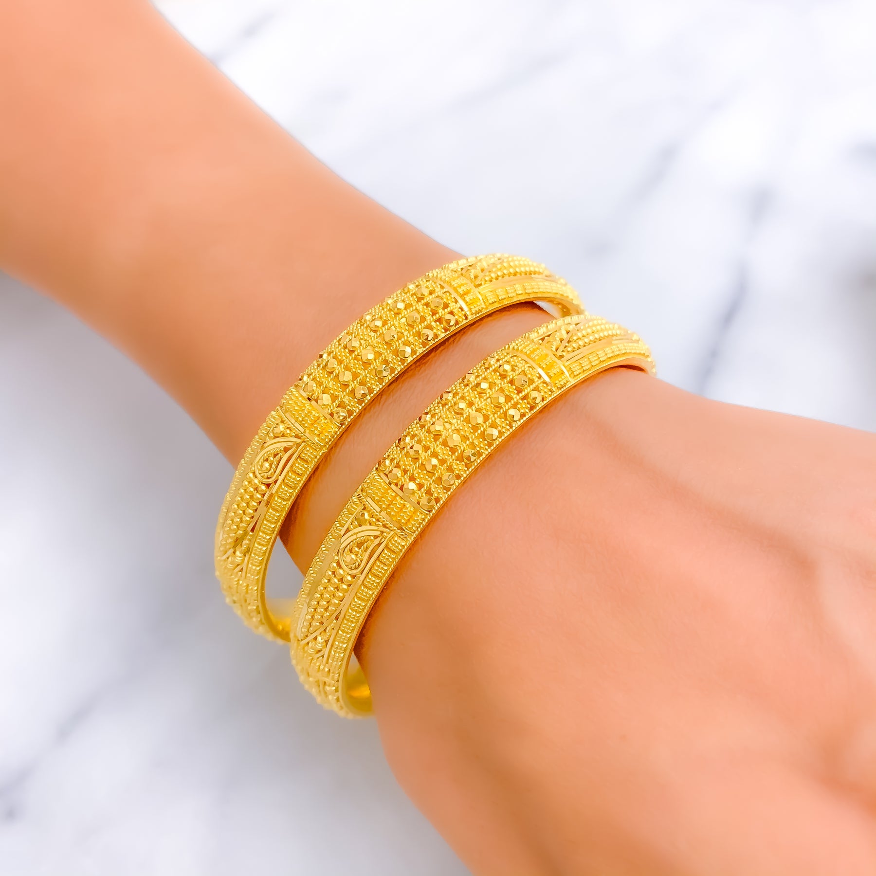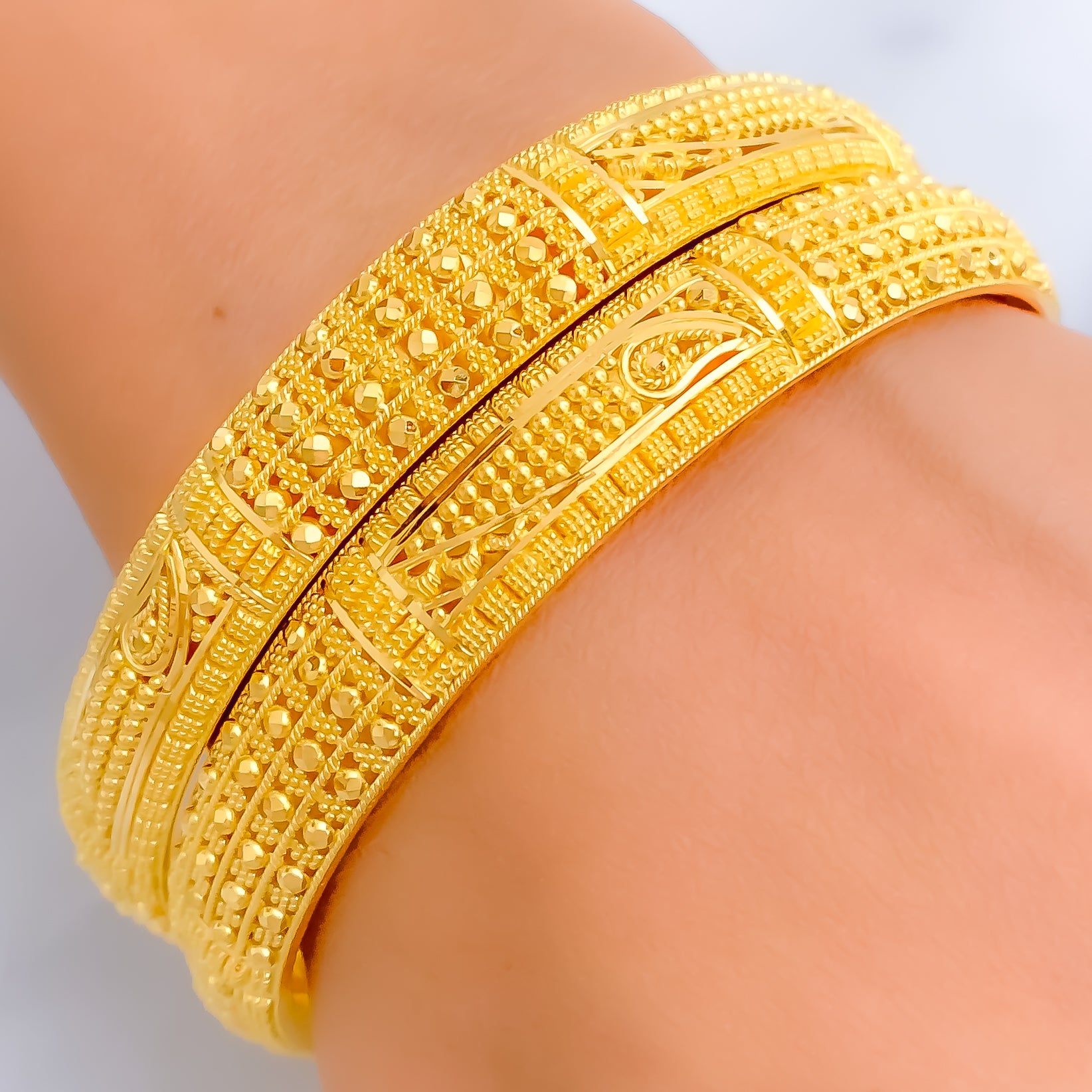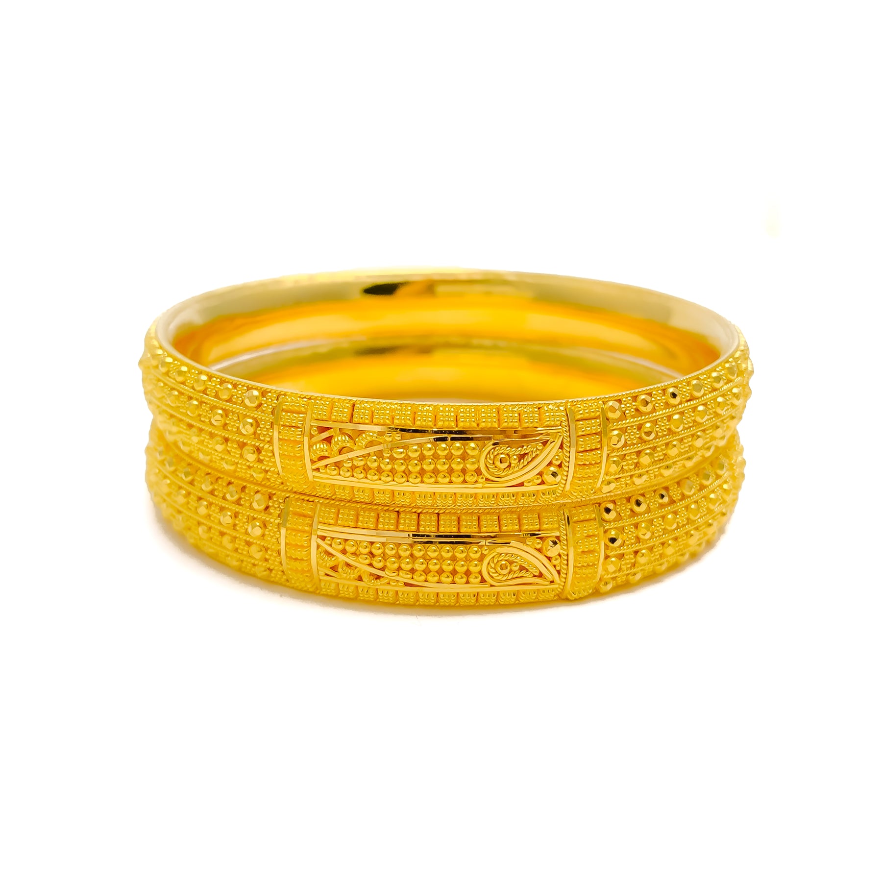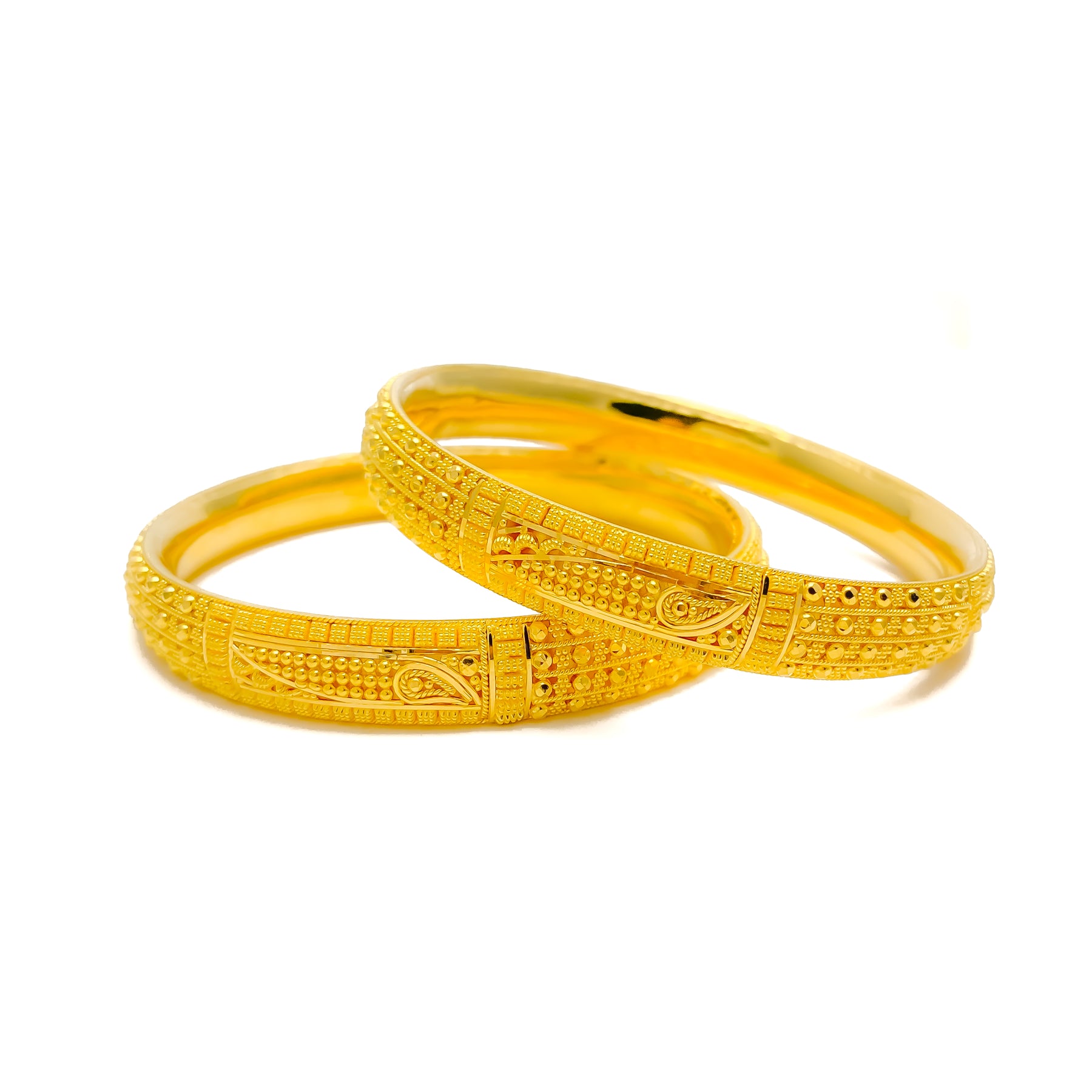 This exquisite 22k yellow gold bangle pair, weighing 44.4 grams, showcases intricate fine beaded detailing that radiates decorative elegance. Designed in a 2.6 size with a 2.35" diameter, these non-openable bangles offer a refined and timeless appeal. The polished finish enhances their golden brilliance, adding a touch of sophistication. A luxurious two-piece set that beautifully blends traditional craftsmanship with enduring style, perfect for both daily elegance and celebratory occasions.