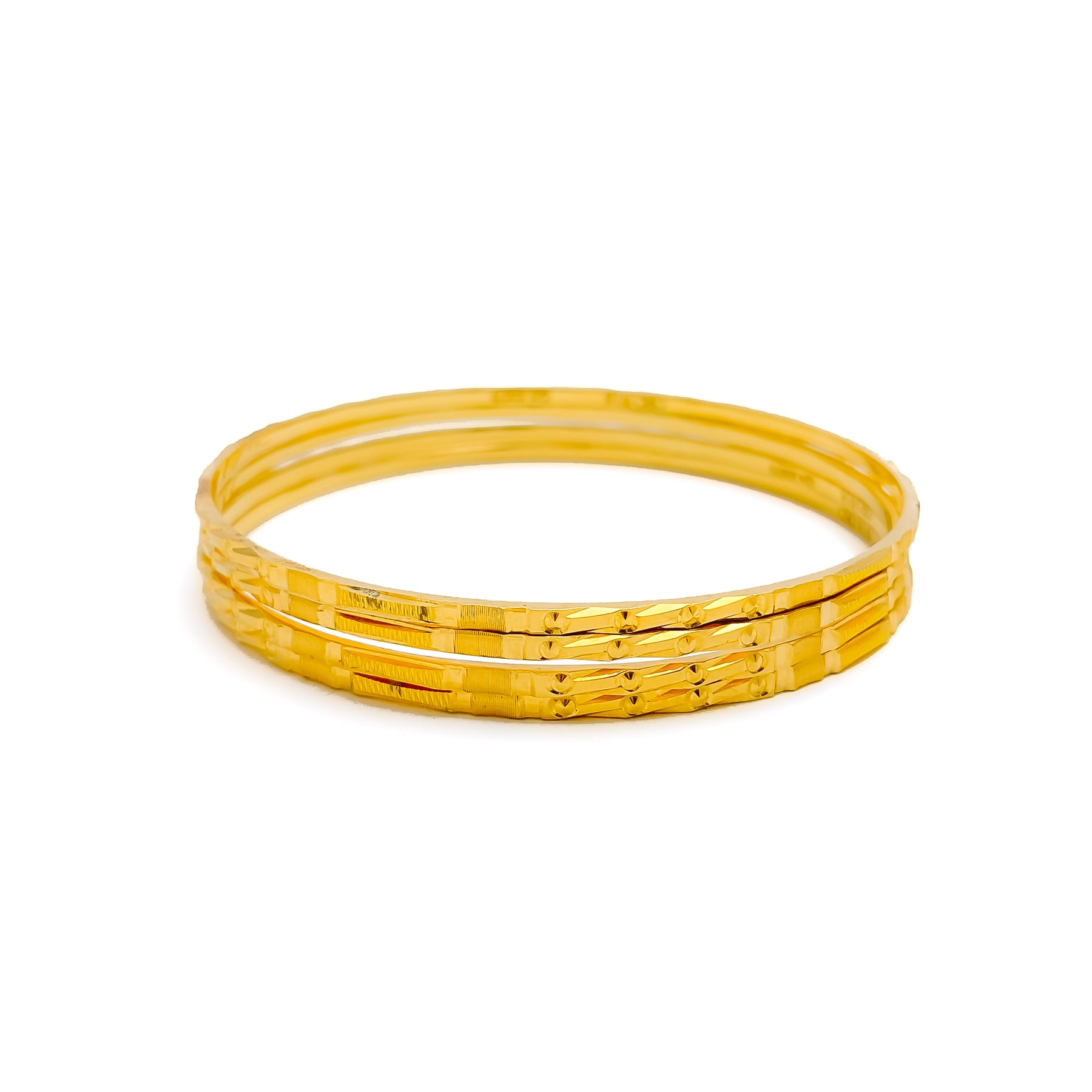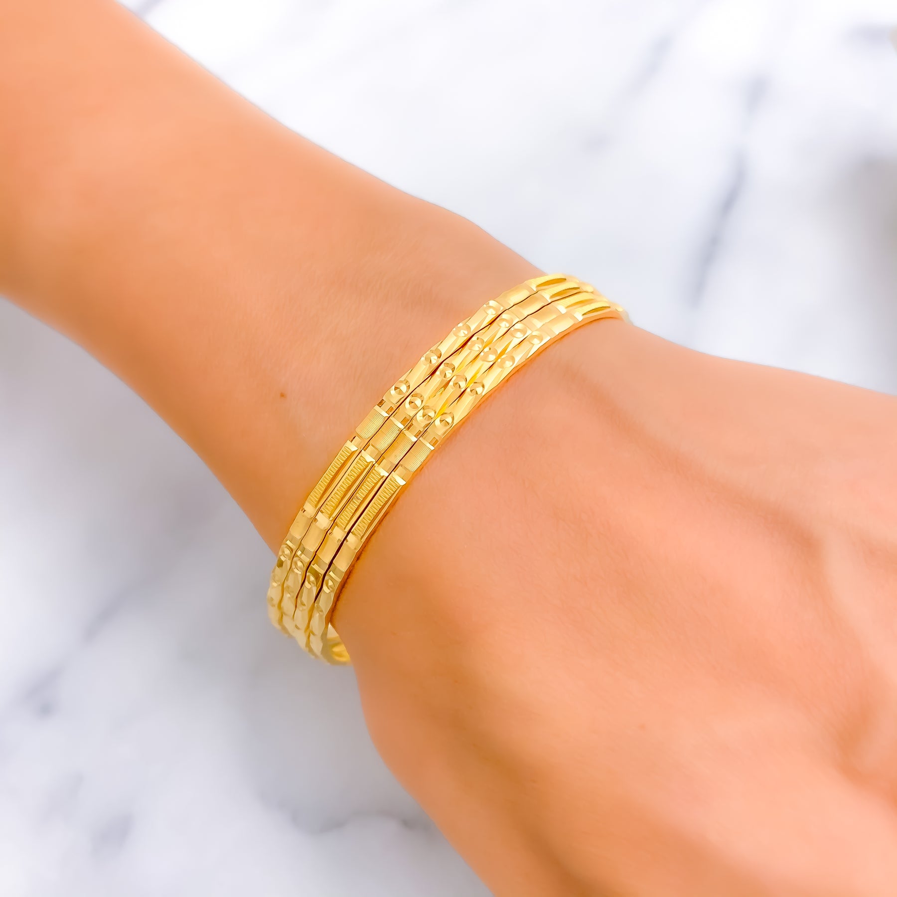 This exquisite 22k yellow gold set, weighing 36.3 grams, features four intricately engraved bangles that radiate evergreen elegance. Crafted in a 2.6 size with a 2.35" opening, these bangles embody timeless sophistication. The polished finish enhances their radiant brilliance, offering refined allure. A luxurious four-piece collection that beautifully blends traditional craftsmanship with enduring style, perfect for both daily elegance and festive occasions.
