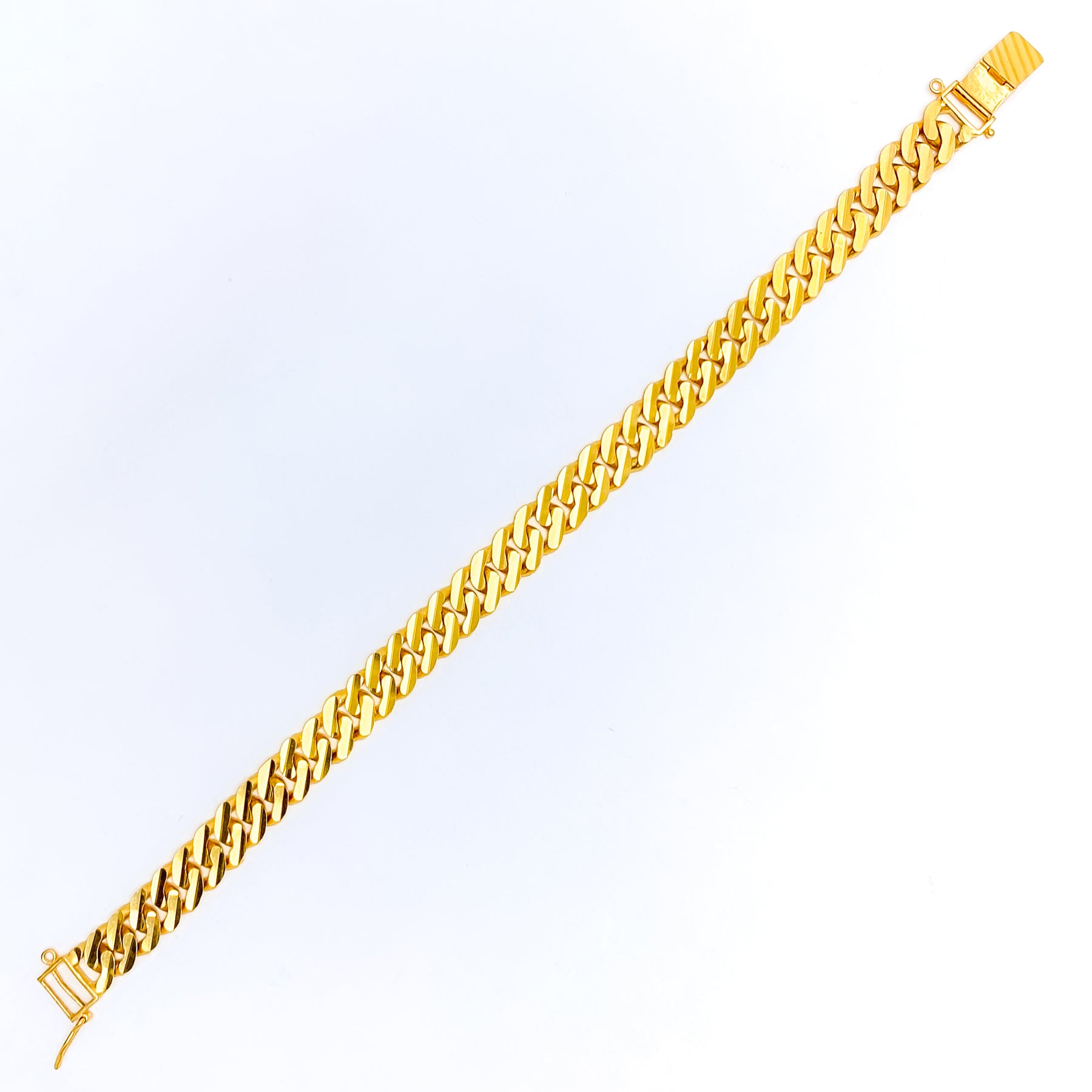 Striking in both form and finish, this 22K gold bracelet features a rich 31.7g weight and an impeccable yellow gold polish. Its upscale design and dual clasp lock ensure both elegance and security. Ideal for those who favor bold yet refined styling. A powerful expression of masculine luxury.
