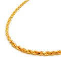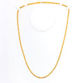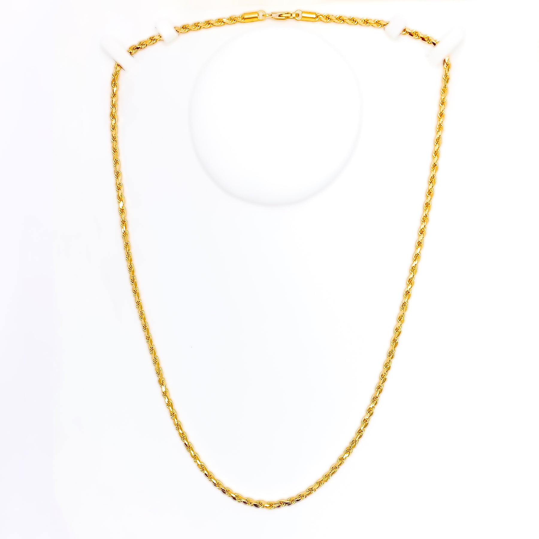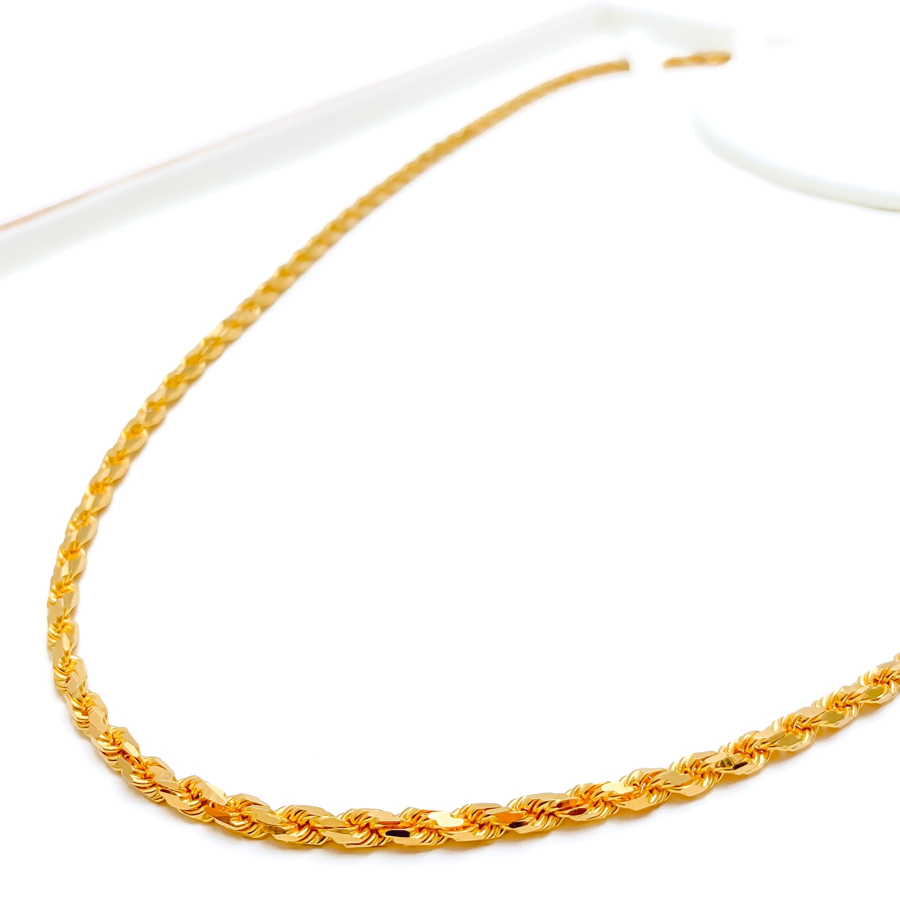 A commanding rope design crafted in 22k yellow gold, this chain stands out with its thick 3.5mm width and vivid, light-catching texture. Its 24-inch length offers a regal drape, perfect for making a strong statement. The intricate rope pattern adds movement and depth with every twist. Completed with a secure lobster lock, it blends luxury and strength effortlessly.