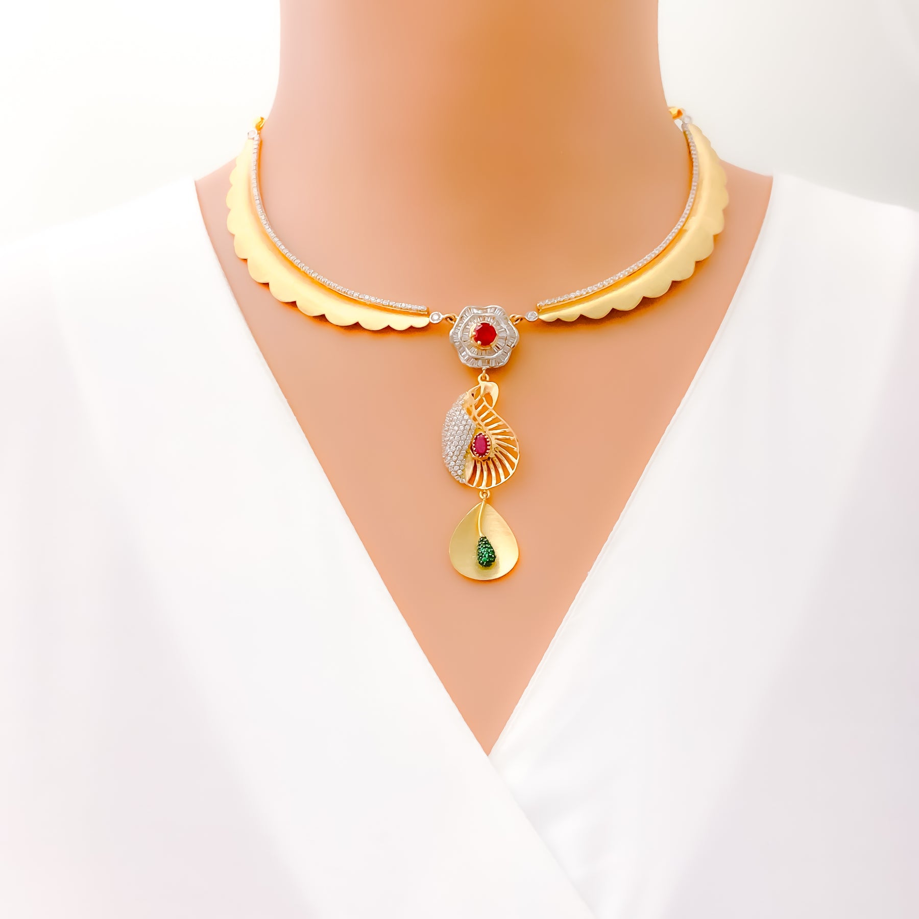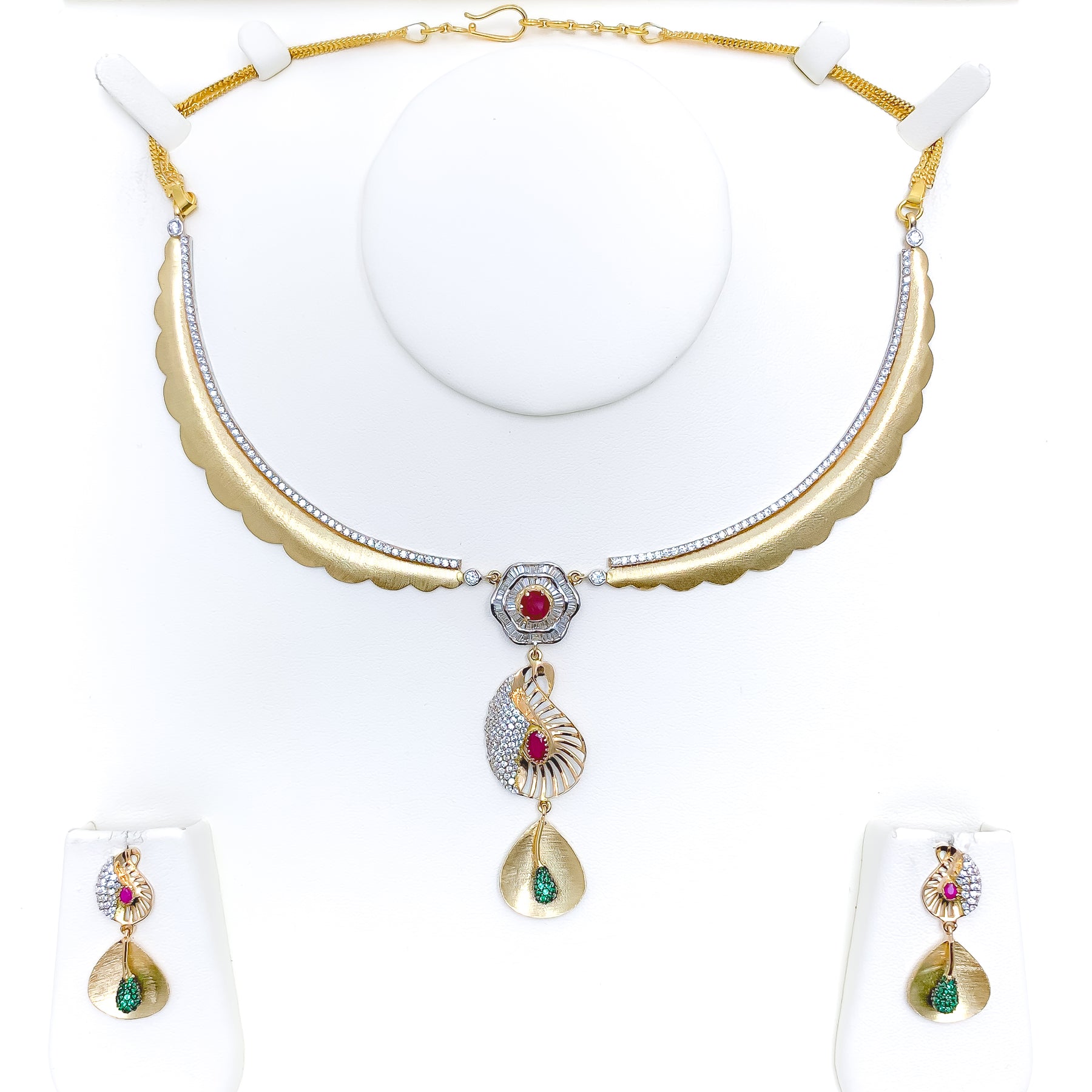 Expertly crafted in 18k yellow gold with a weight of 32.1 grams, this striking set radiates refined artistry. Sparkling cubic zirconia stones illuminate the striped paisley design, highlighted by a polished finish for luminous brilliance. The 15-inch necklace with a 2.75-inch drop exudes bold elegance, perfectly complemented by 1.3-inch matching earrings. Secured with a hook lock and push screw-back posts, it is a captivating ensemble for festive occasions.