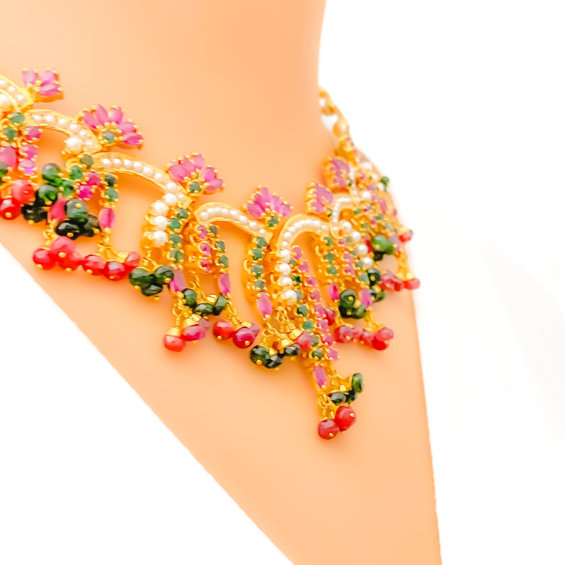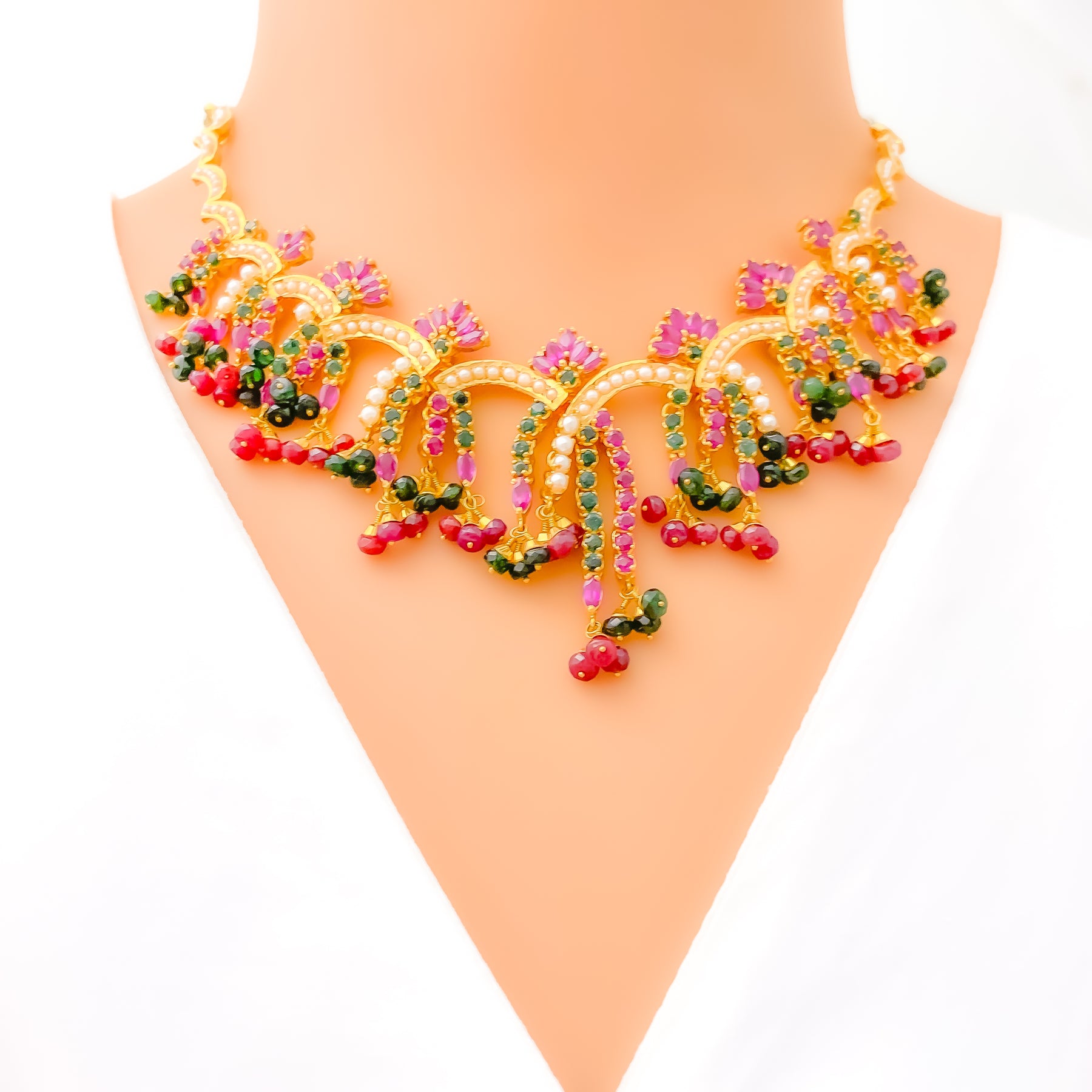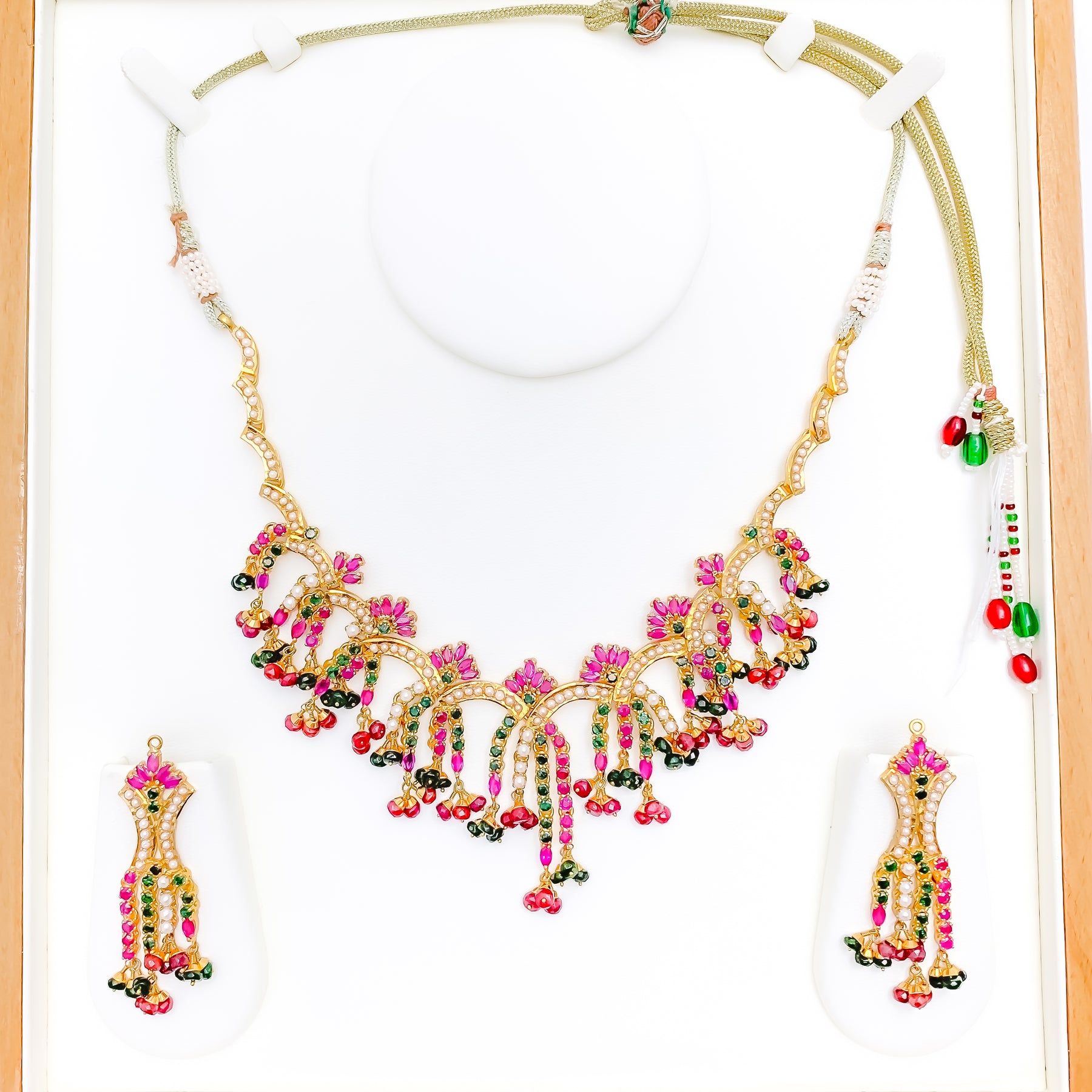 Enriched with cultural elegance, this 22k gold set features a substantial 68.0-gram profile adorned with ruby, emerald, and pearl accents that illuminate its ornate silhouette with vibrant richness. The warm yellow-gold finish enhances the 1.5-inch width with radiant depth and dressy sophistication, while the adjustable dori provides versatile comfort suited for many ceremonial looks. Intricately placed beaded tassels add graceful movement and traditional charm that elevate the entire design. Paired with matching 2.25-inch screw-back earrings, it delivers a timeless touch of golden grandeur to any thoughtfully curated ensemble.