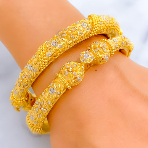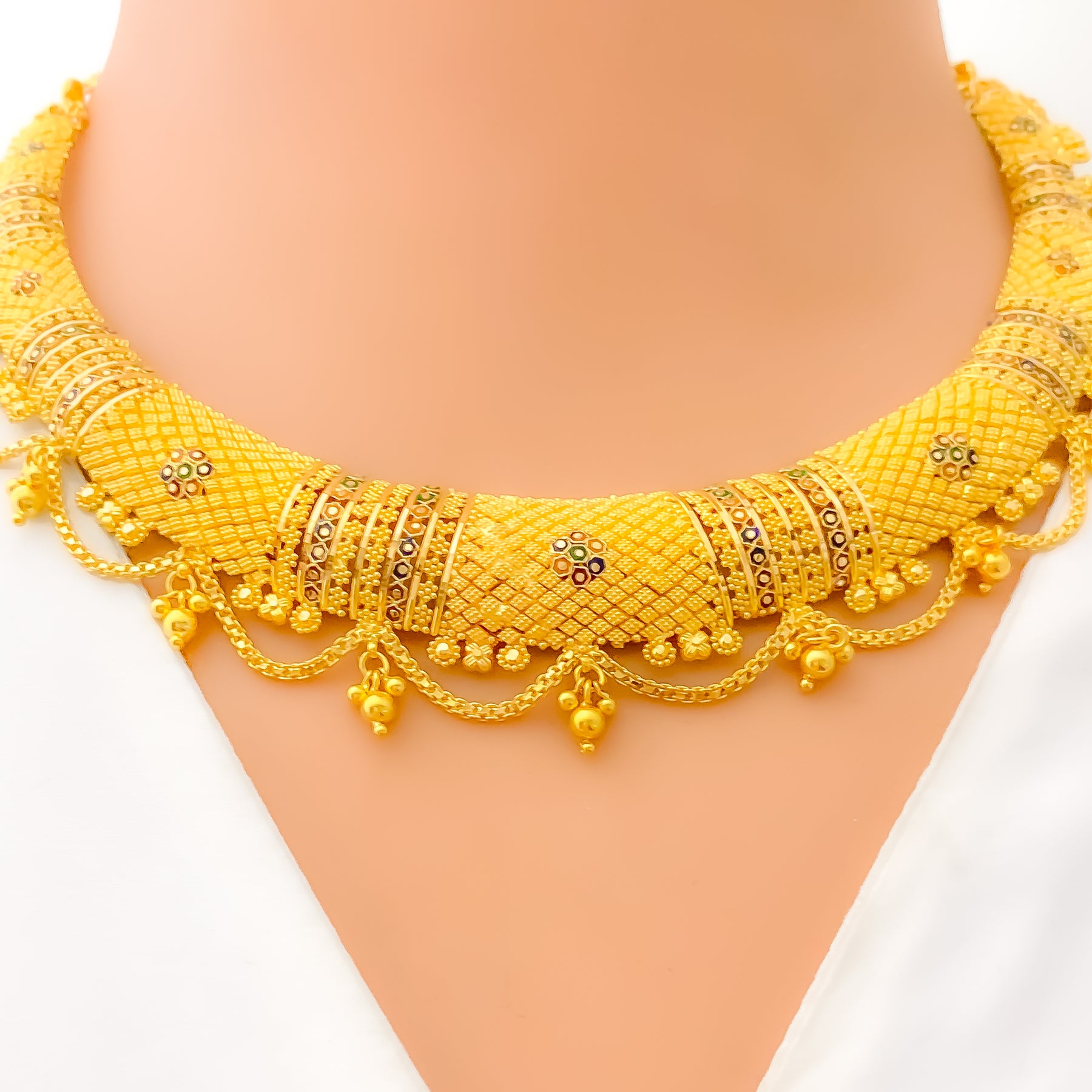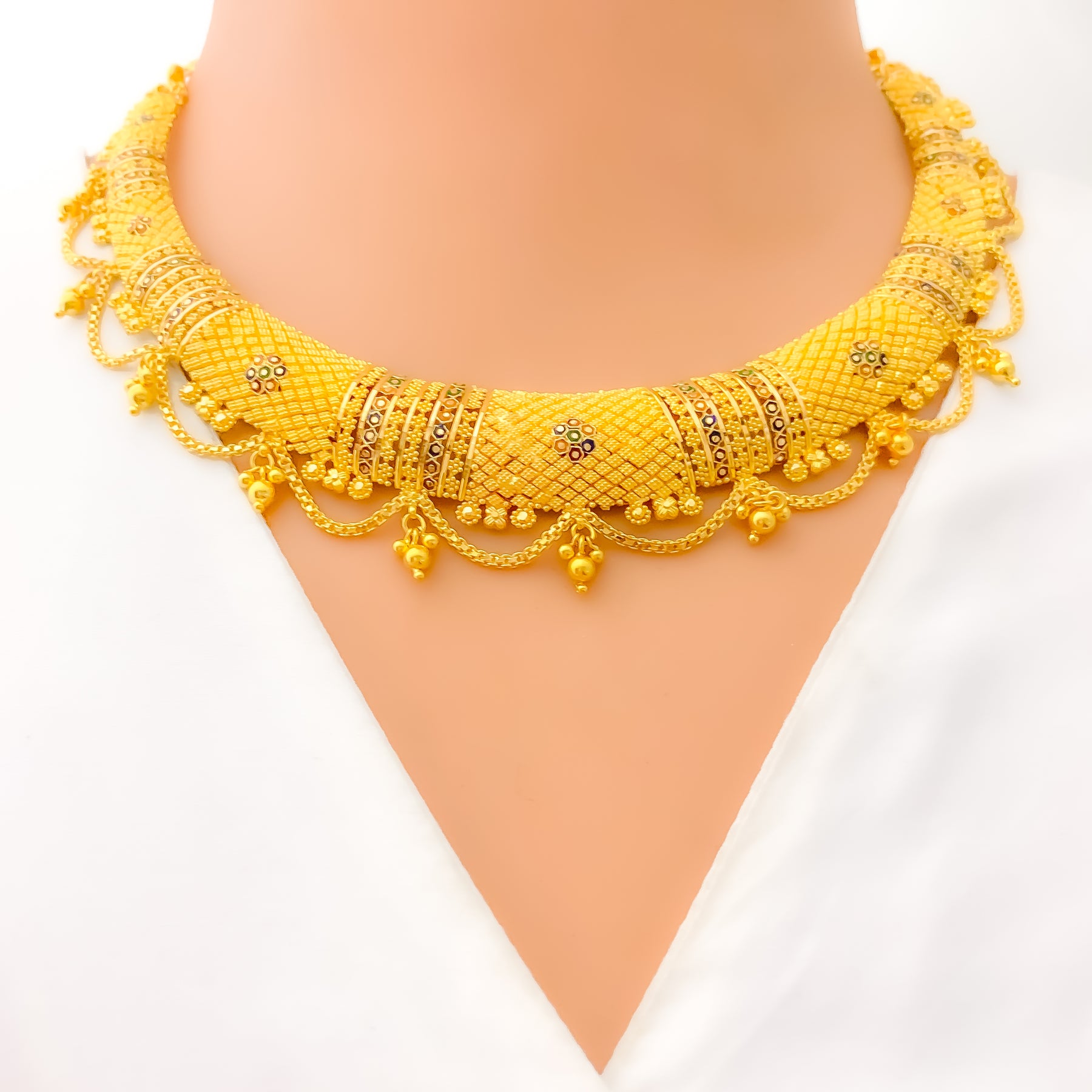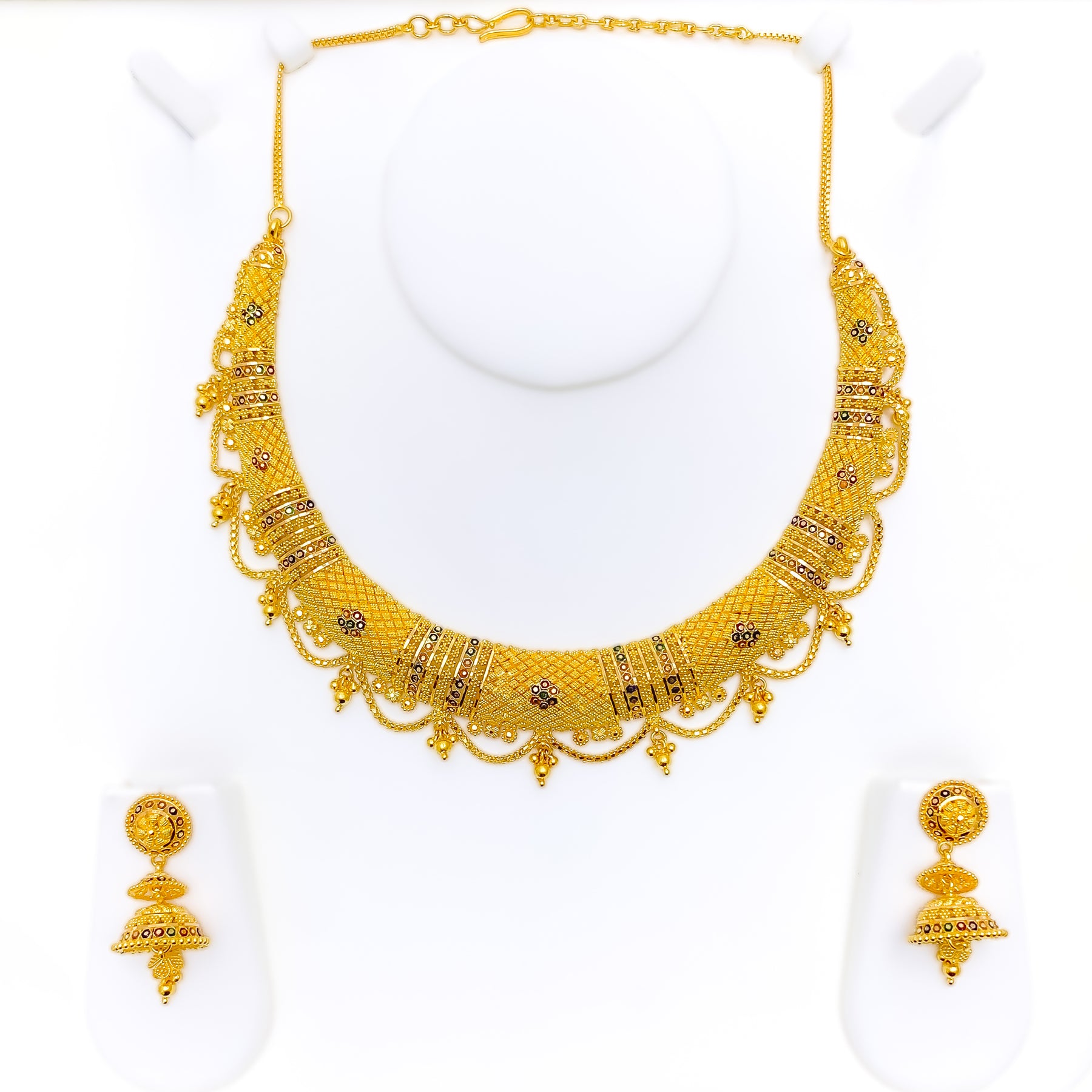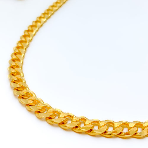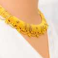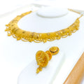 Commanding and detailed, this 68.8-gram set in 22k yellow gold features a striking checkered pattern in a bold round silhouette. The 16-inch necklace includes 1.5-inch adjustable links and secures with a hook lock. Paired with 1.75-inch screw-back earrings, it delivers a balanced blend of tradition and grandeur.