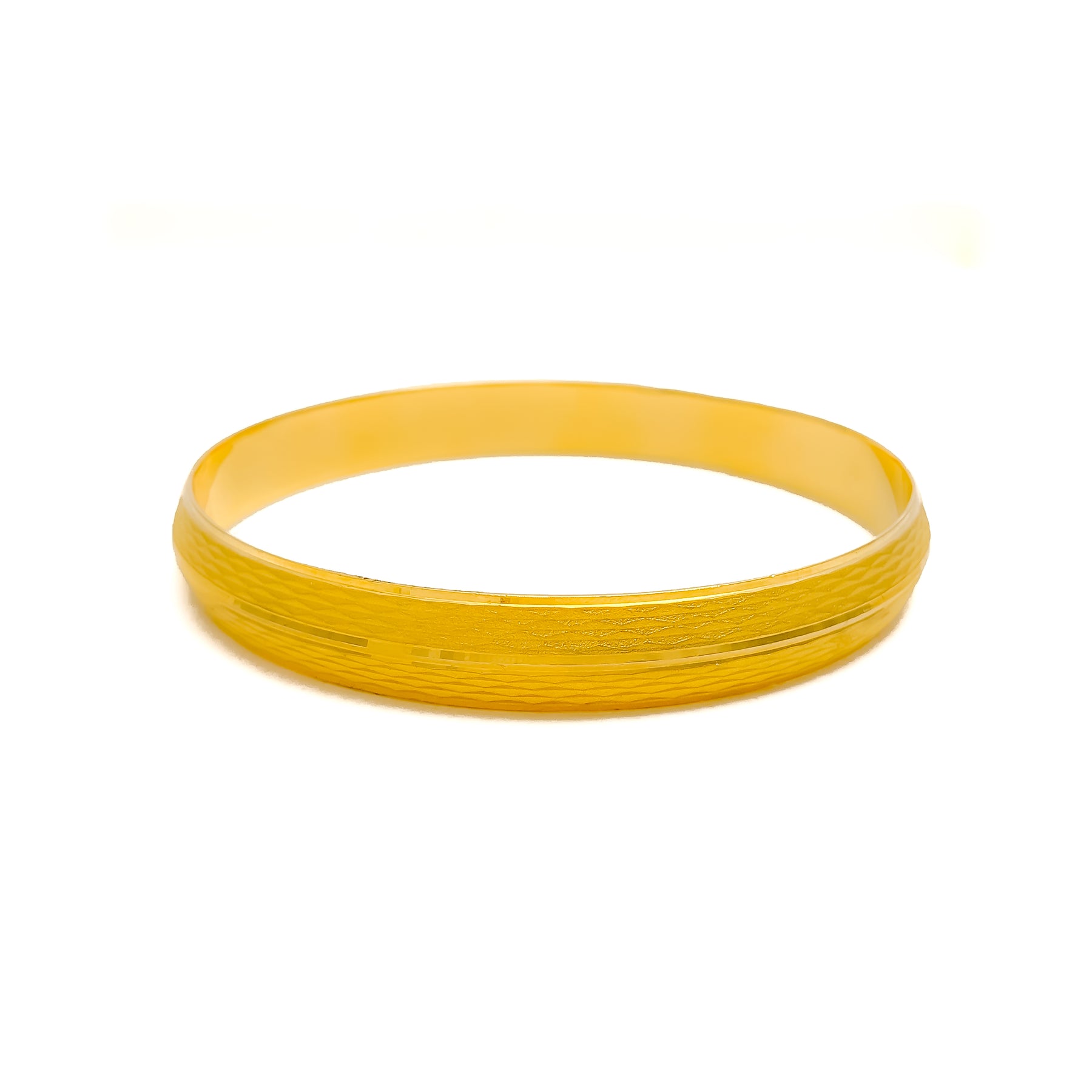 Masterfully designed in bold 22k yellow gold, this men's bangle showcases a rich textured finish that adds dimension and character. Weighing an impressive 61.8 grams, it offers a substantial and luxurious presence on the wrist. The generous 2.75" opening ensures easy wear and comfort. Sized at 2.12, this single bangle is a true statement of prestige.
