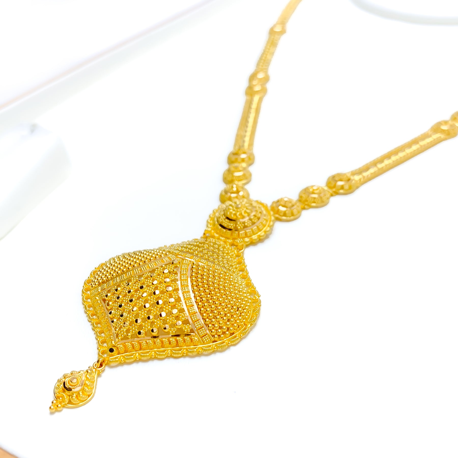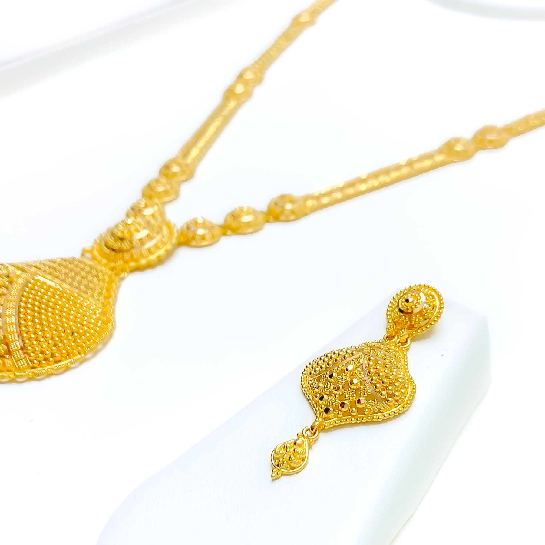 Gracefully designed, this 22k yellow gold necklace set weighs 55.9 grams and features a refined 24" length with a 2.8" leaf-inspired drop. Paired with 1.5" screw-back earrings, 0.6" adjustable links, and a secure hook lock, it offers elevated elegance. A stylish set blending natural motifs with timeless sophistication.