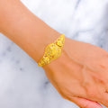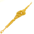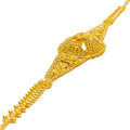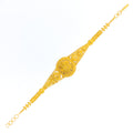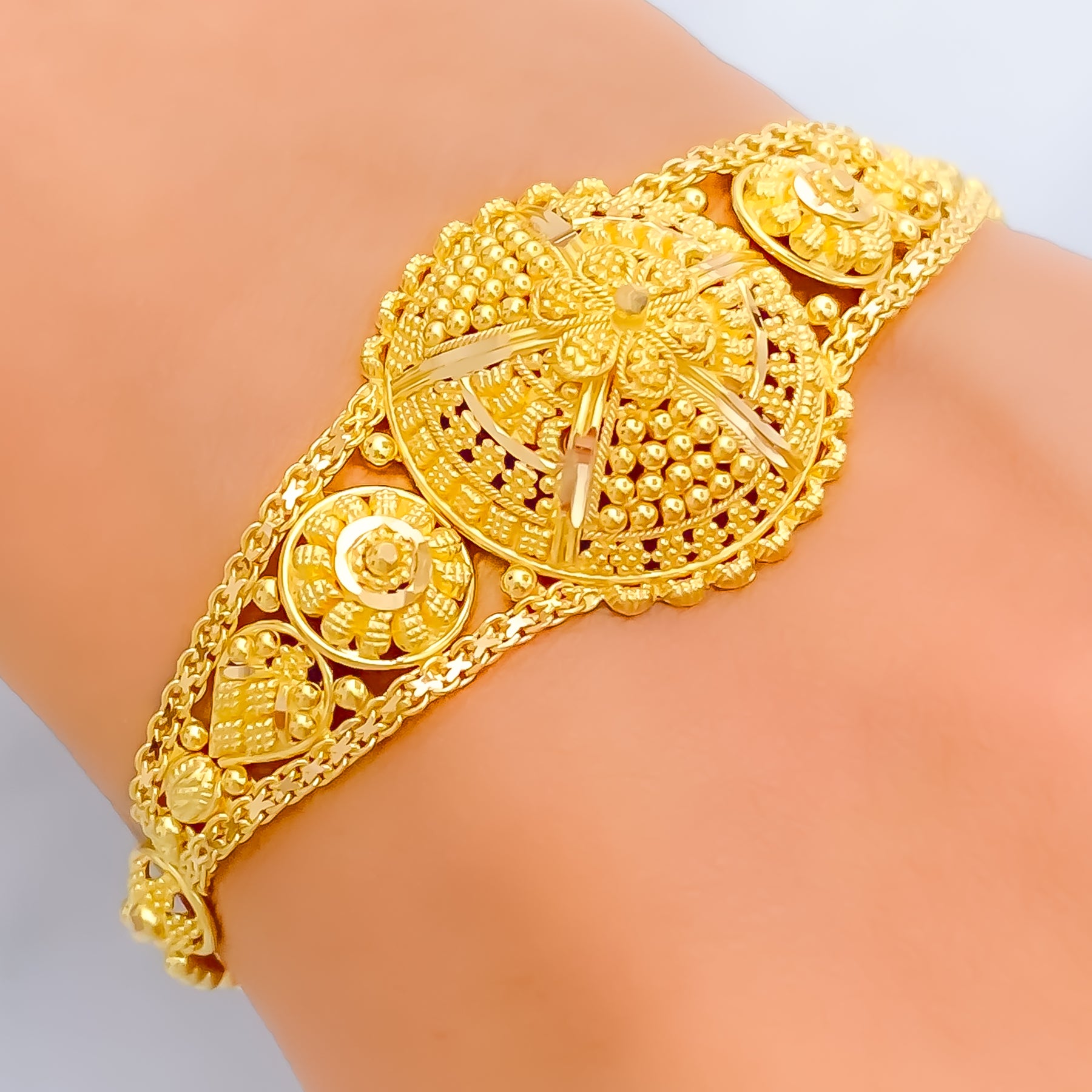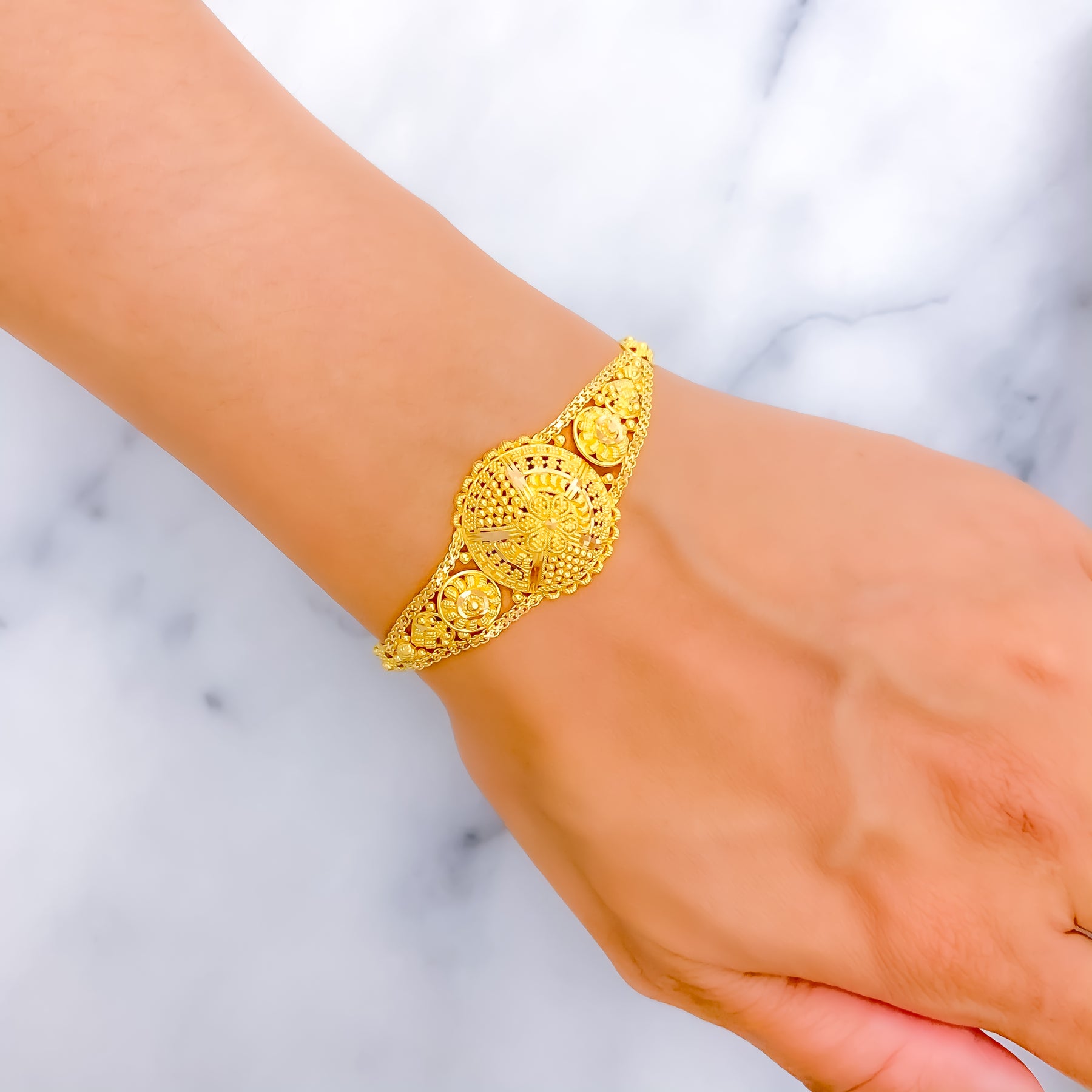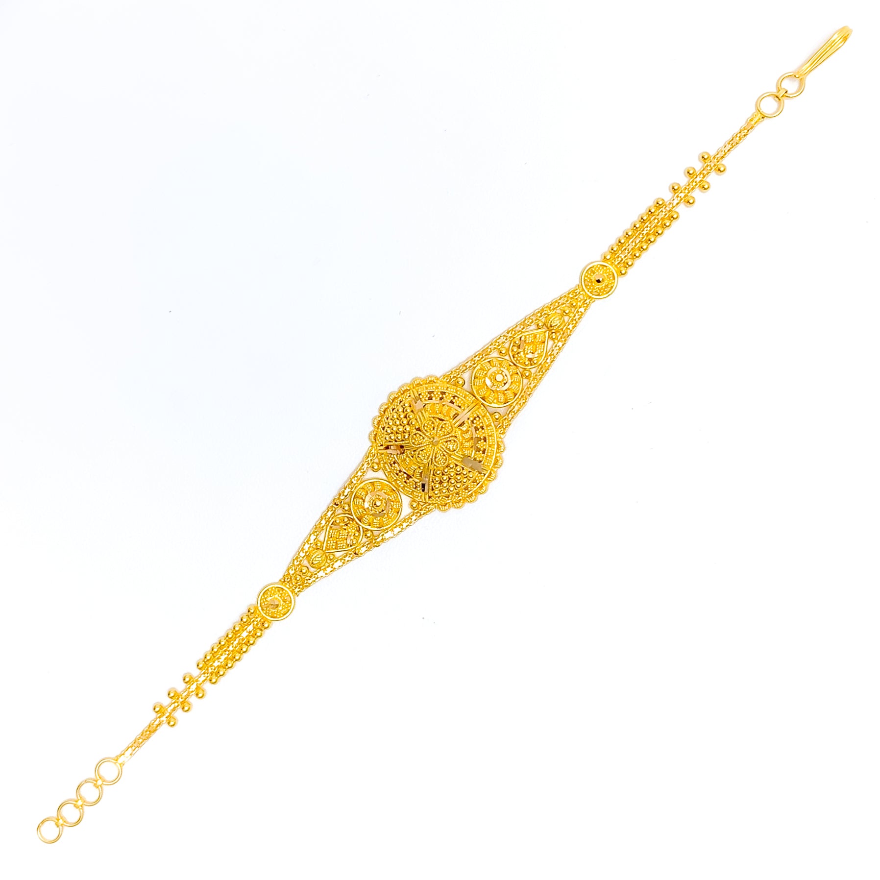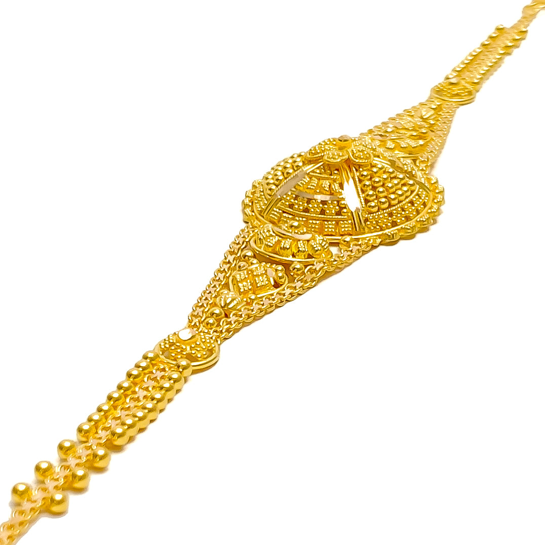 Radiating poise and dimension, this 22k gold bracelet weighs 9.0 grams and features a faceted semi-statement design that reflects light with refined brilliance. At 7.1 inches long with 0.75-inch adjustable links, it offers a tailored, comfortable fit secured by a hook lock. The yellow gold finish enhances its stately presence, making it a tasteful piece for those who favor timeless sophistication with a hint of geometric allure.