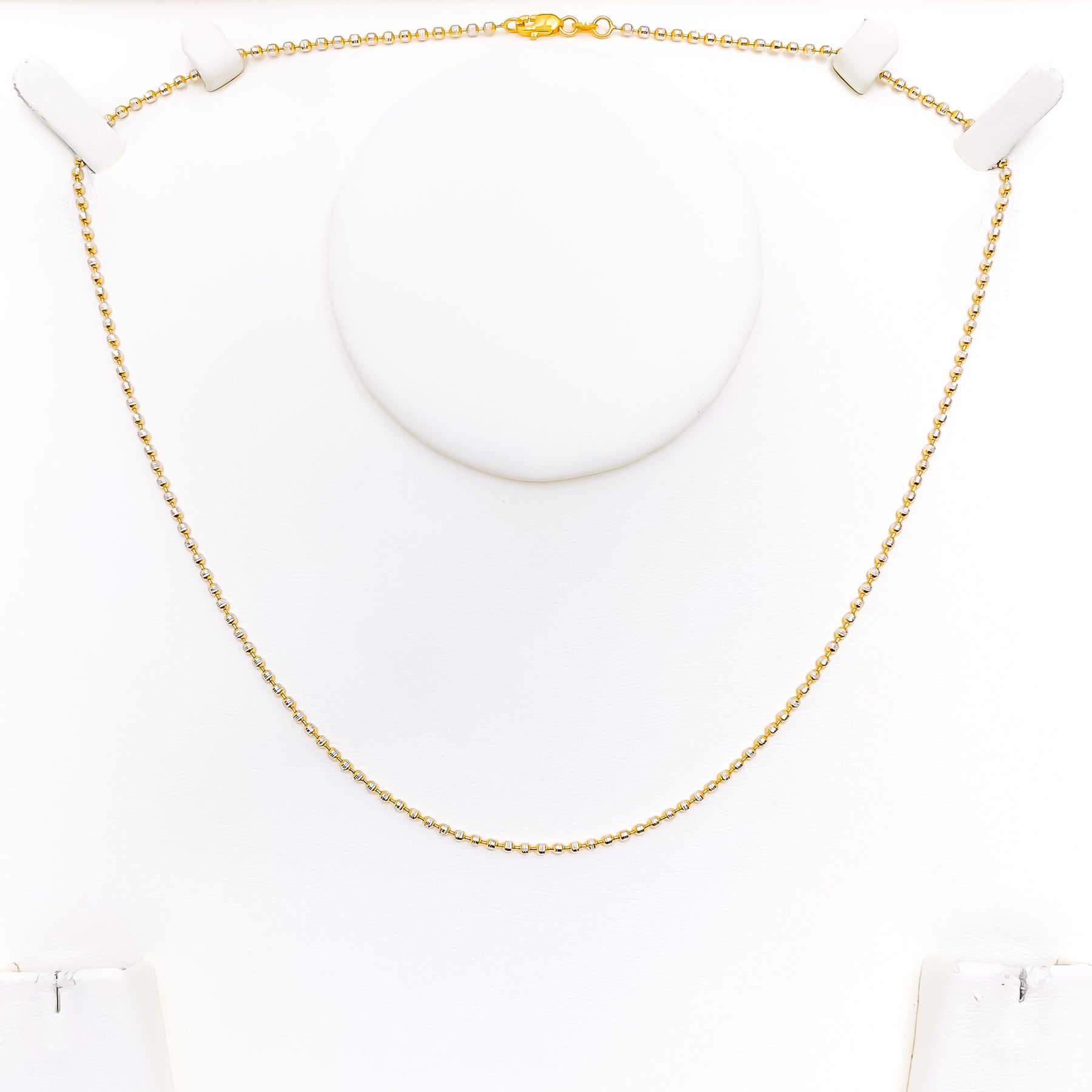 Highlighted by a lively blend of yellow and white gold accents, this 22k chain features intricately arranged multi-bead elements that lend it a bright, contemporary shimmer. Weighing 7.4 grams, it offers a smooth balance of delicacy and presence, making it perfect for daily wear or elegant layering. Its 1.5mm width brings refined dimension while enhancing the radiant two-tone contrast. Finished with a secure lobster lock, this 18-inch design adds polished versatility to any jewelry collection.