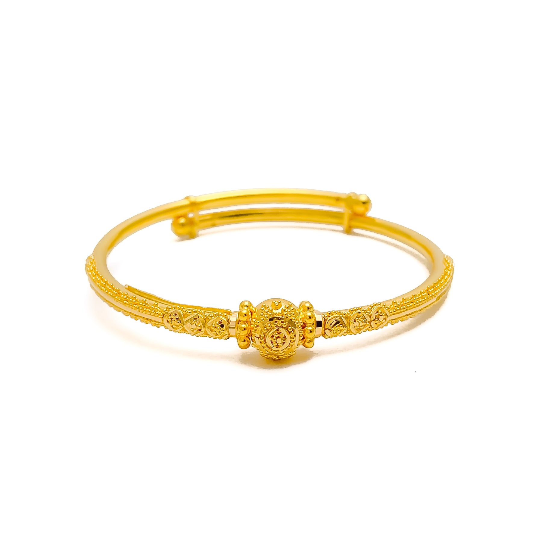 Charming and timeless, this intricately designed 22k gold baby bangle showcases a delicate decorative motif ideal for gifting or treasured keepsakes. Weighing 6.2 grams with a 1.75" diameter, it features an adjustable fit to ensure comfort and longevity. A meaningful piece with heirloom appeal.
