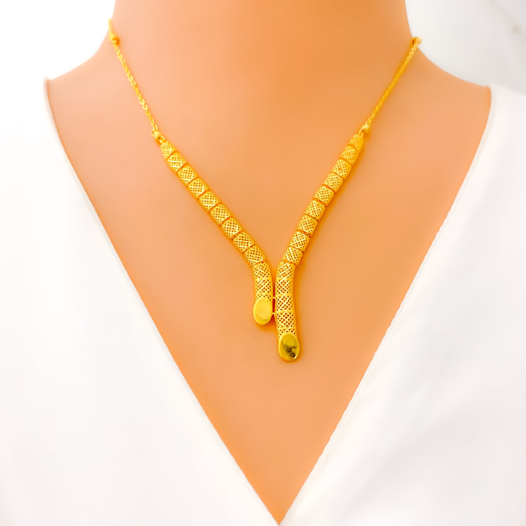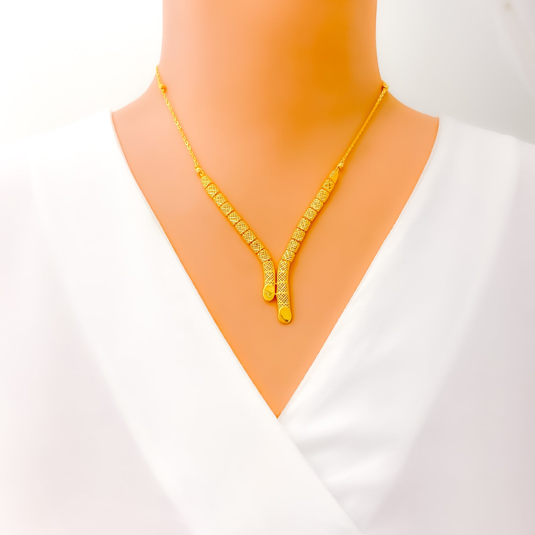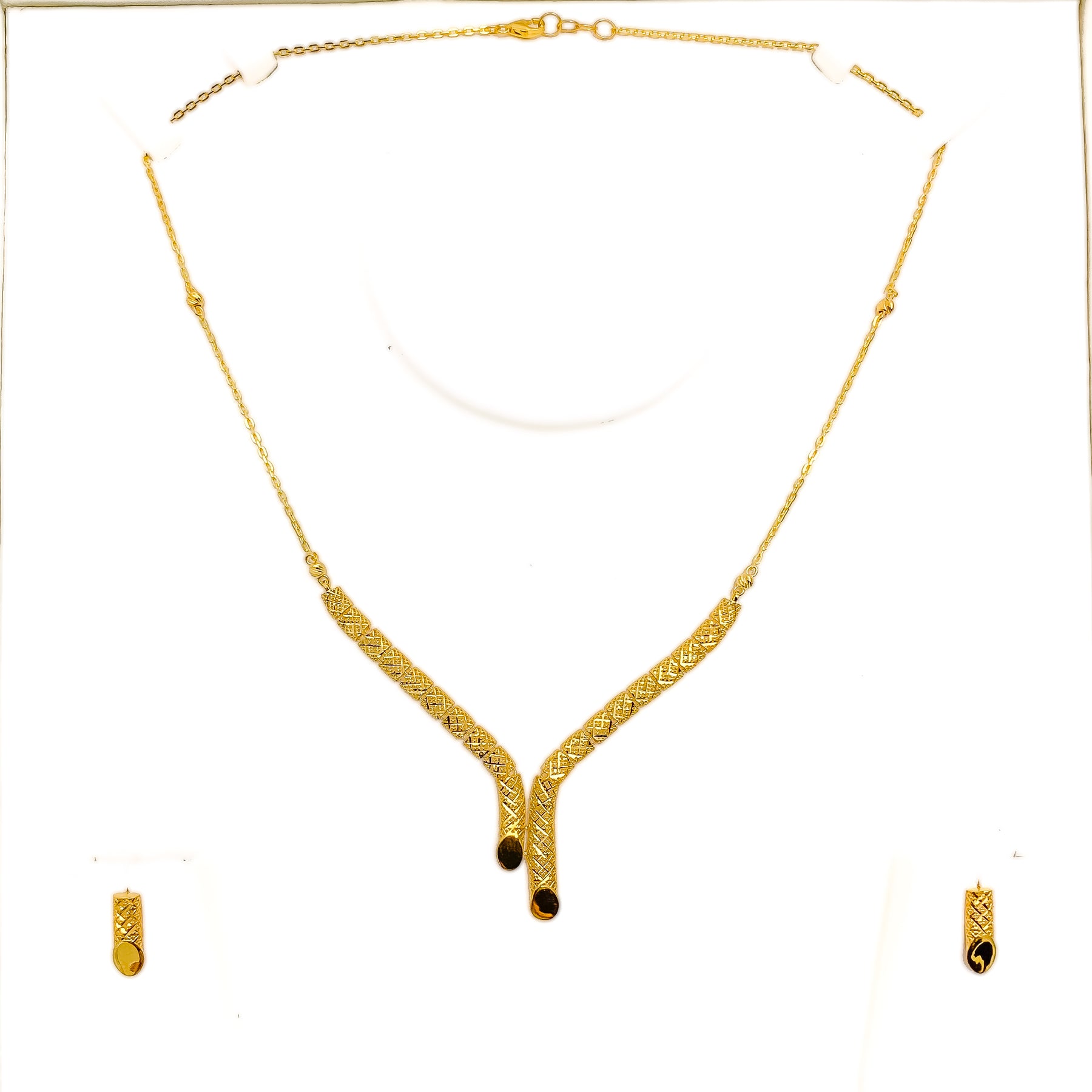 Polished 22k yellow gold set weighs 7.9 grams, presenting a sophisticated lightweight design with warm radiant charm. The 16 inch length with 1 inch drop includes 0.6 inch adjustable links and lobster lock. Matching earrings included measure 0.7 inches for a balanced coordinated look. Push back posts ensure secure comfortable wear with polished elegant appeal.