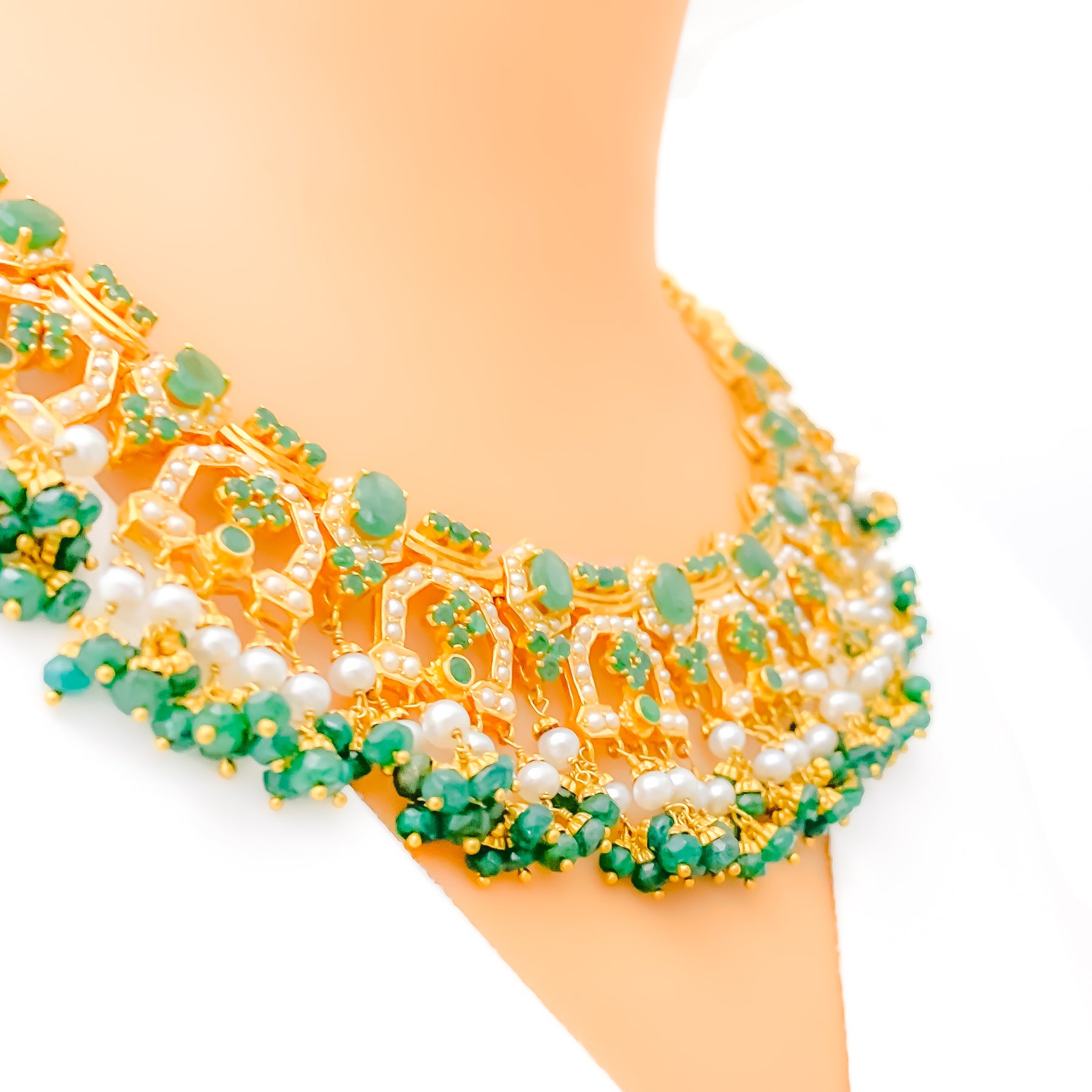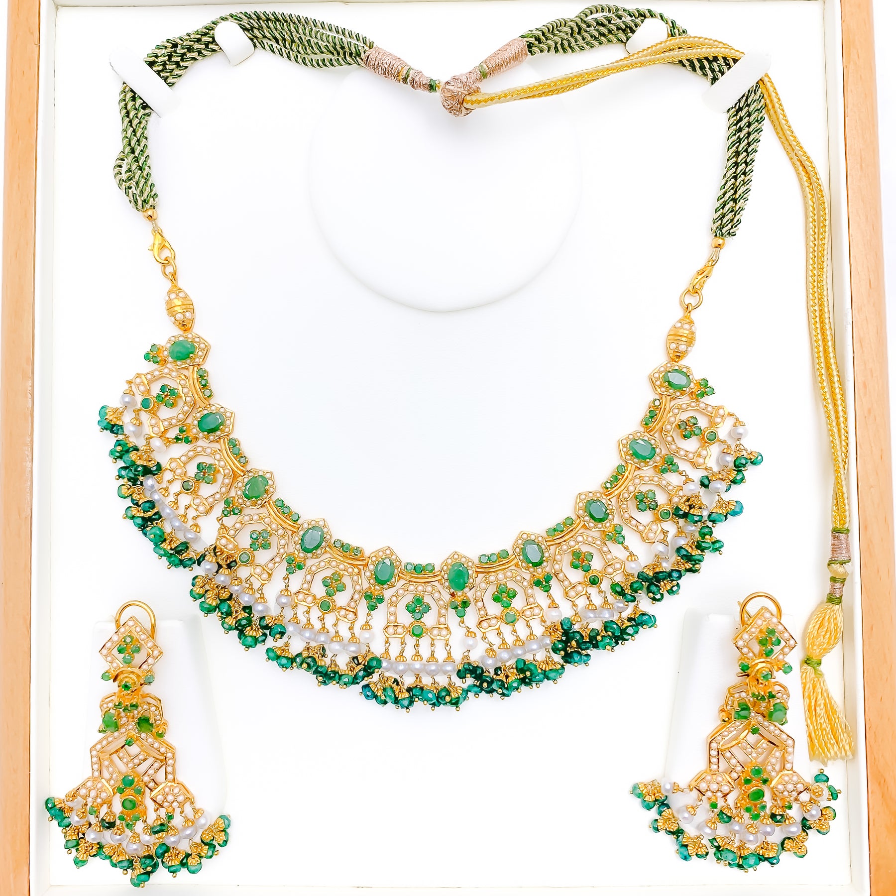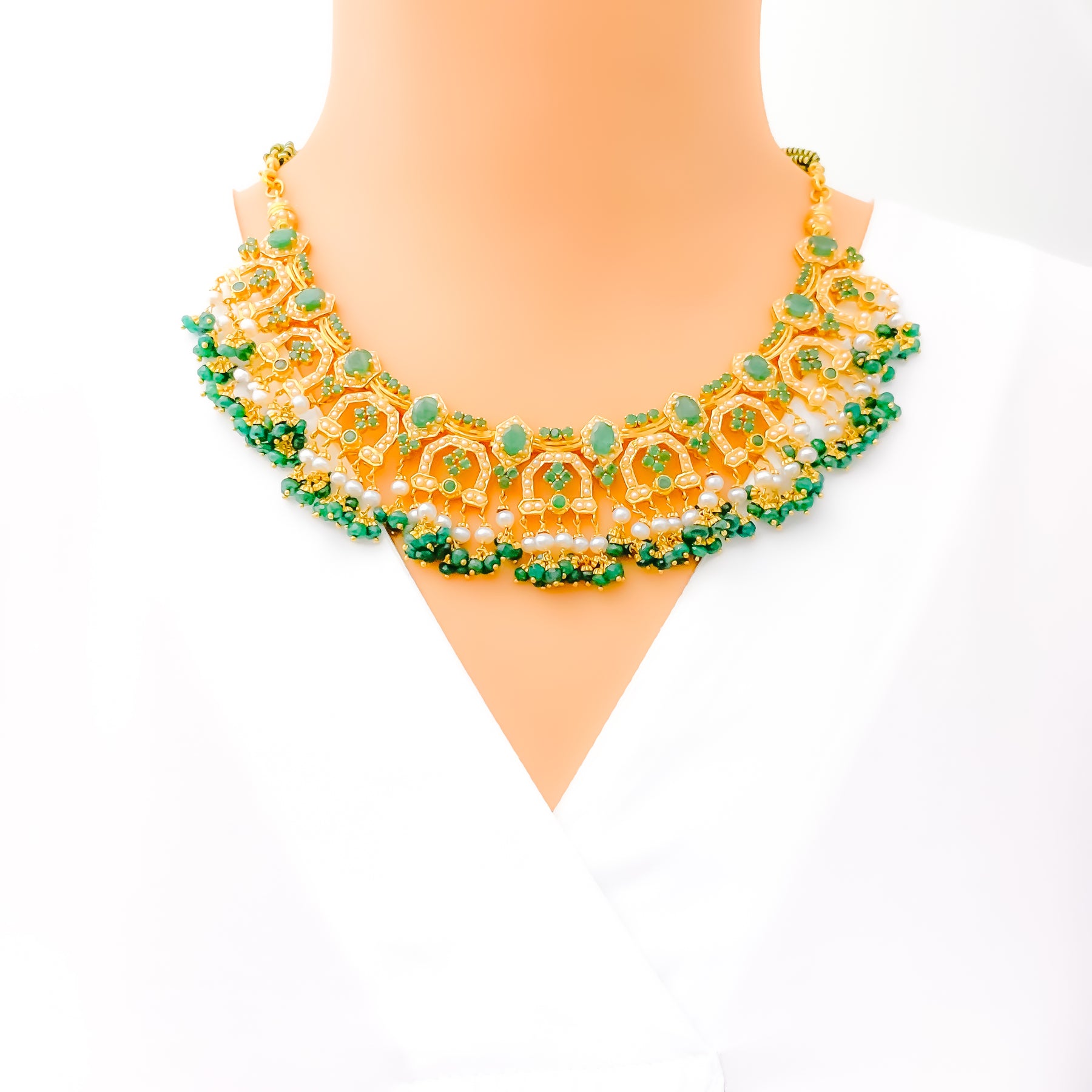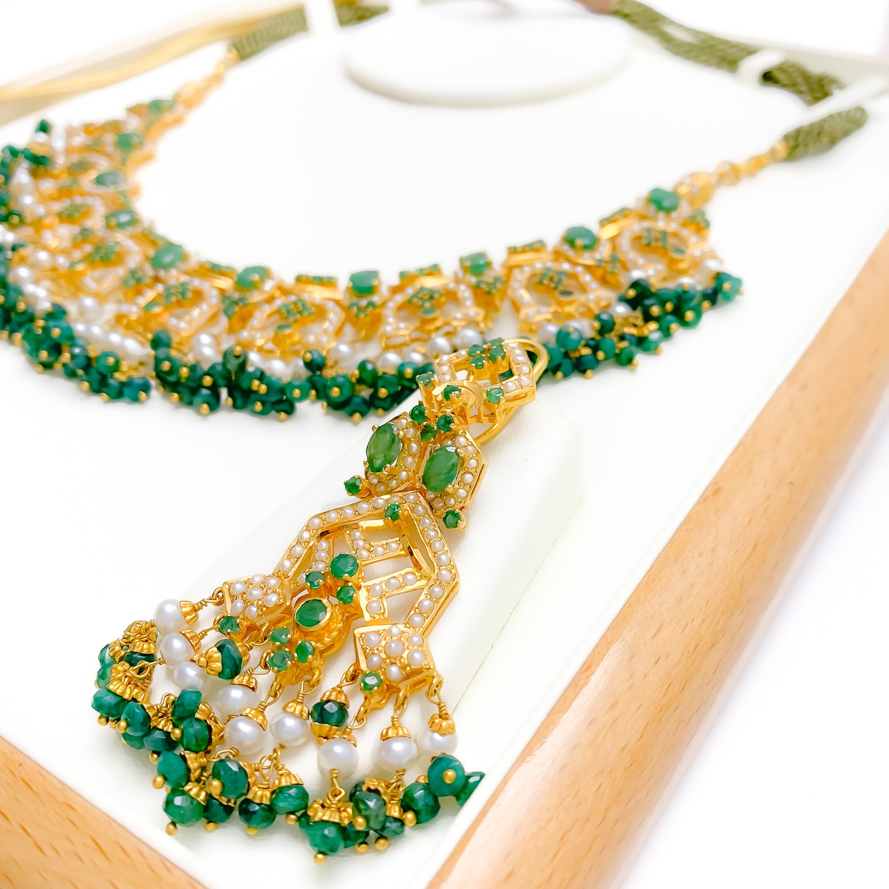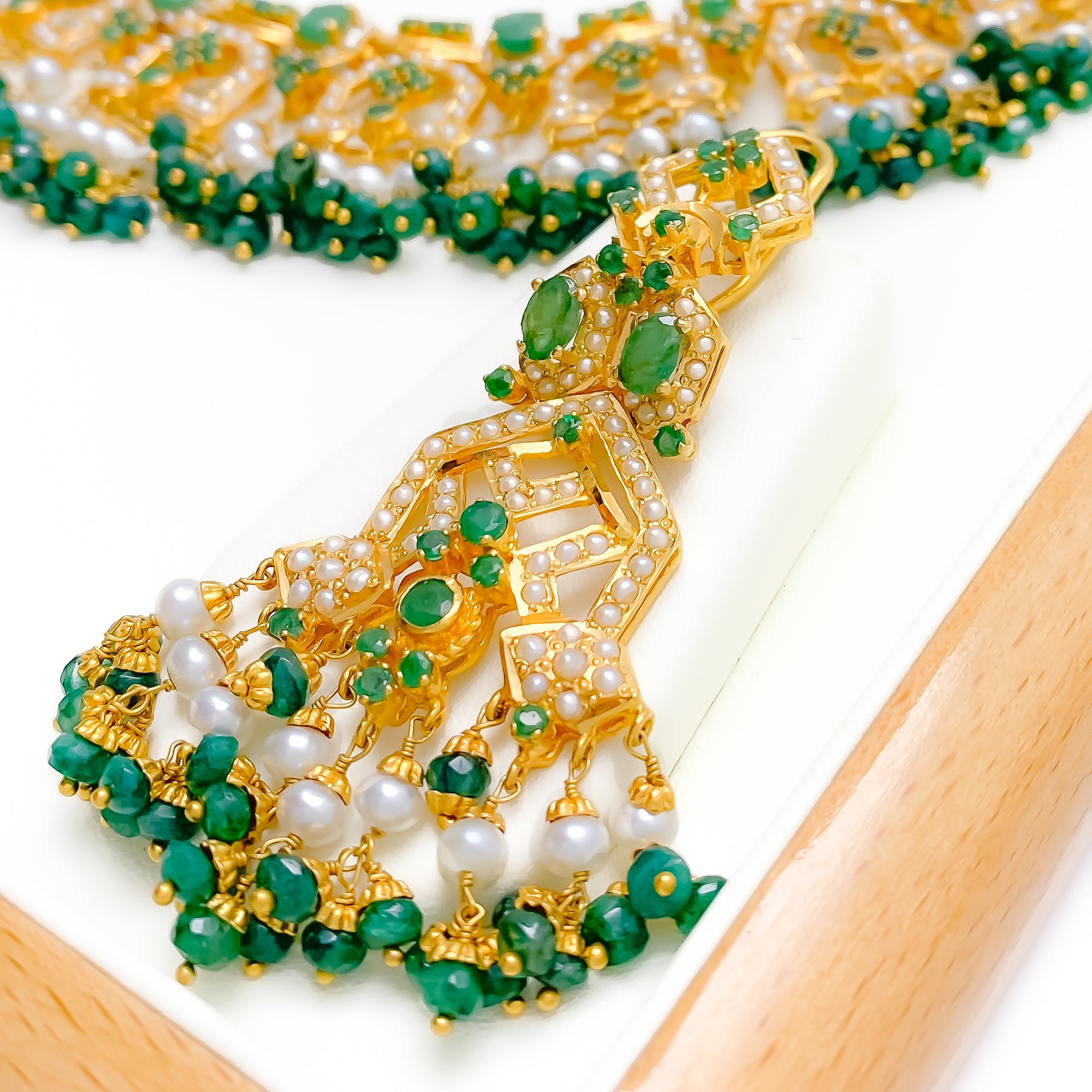 Distinguished with majestic brilliance, this 22k gold necklace set showcases an impressive 74.1-gram profile enriched with lustrous pearls and vibrant emeralds that illuminate its refined 12-inch silhouette. Its warm yellow-gold finish enhances the 1.6-inch width with glowing depth and elevated grandeur. The adjustable dori allows a customized fit suited for many elegant occasions, adding versatility to its opulent design. Complete with matching 2.75-inch push-back earrings, it delivers a royal touch of golden sophistication to any thoughtfully curated ensemble.
