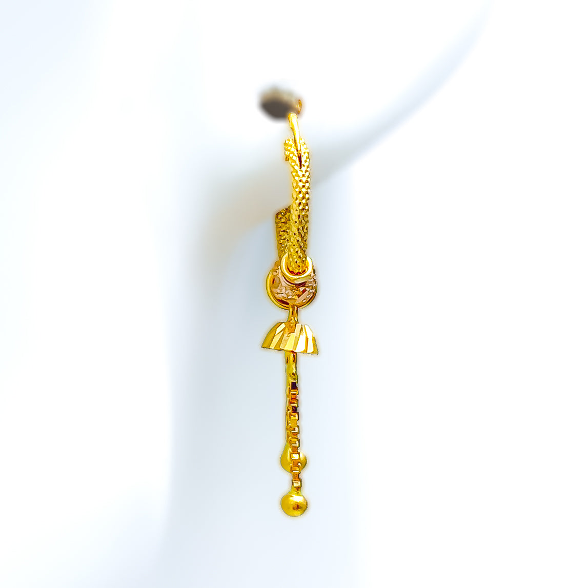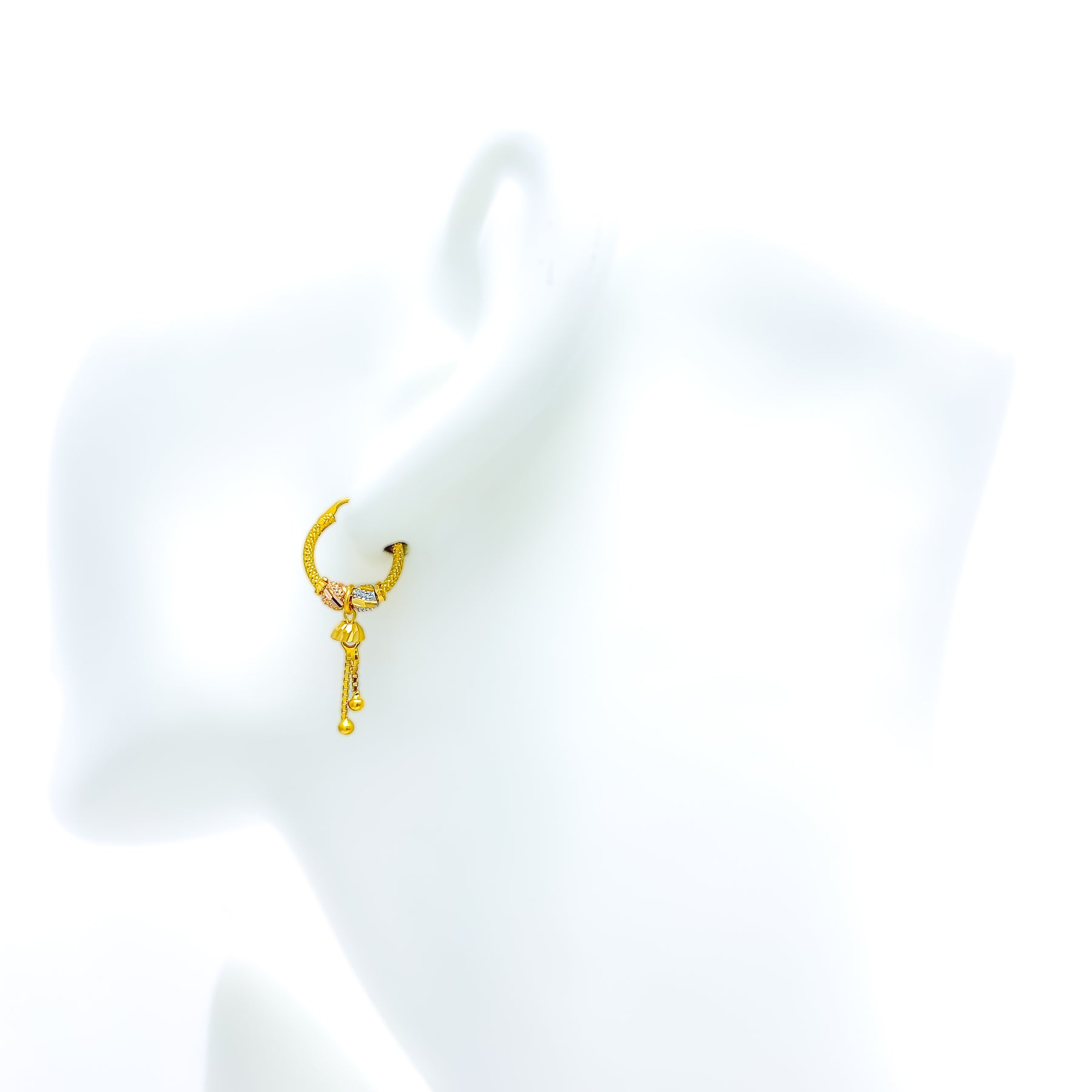 Vibrantly refined, this 22k tri-tone Bali earring weighs 2.9 grams and features a polished yellow, white, and rose gold finish that enhances its colorful poised hoop design. Crafted in a classic Bali silhouette, it presents a 0.5-inch diameter with a graceful 1.25-inch length for balanced elegance. The lightweight hoop construction ensures comfortable wear while maintaining a sleek, expressive profile throughout the day. Distinctive yet timeless, this piece offers versatile charm ideal for festive occasions and elevated everyday styling.