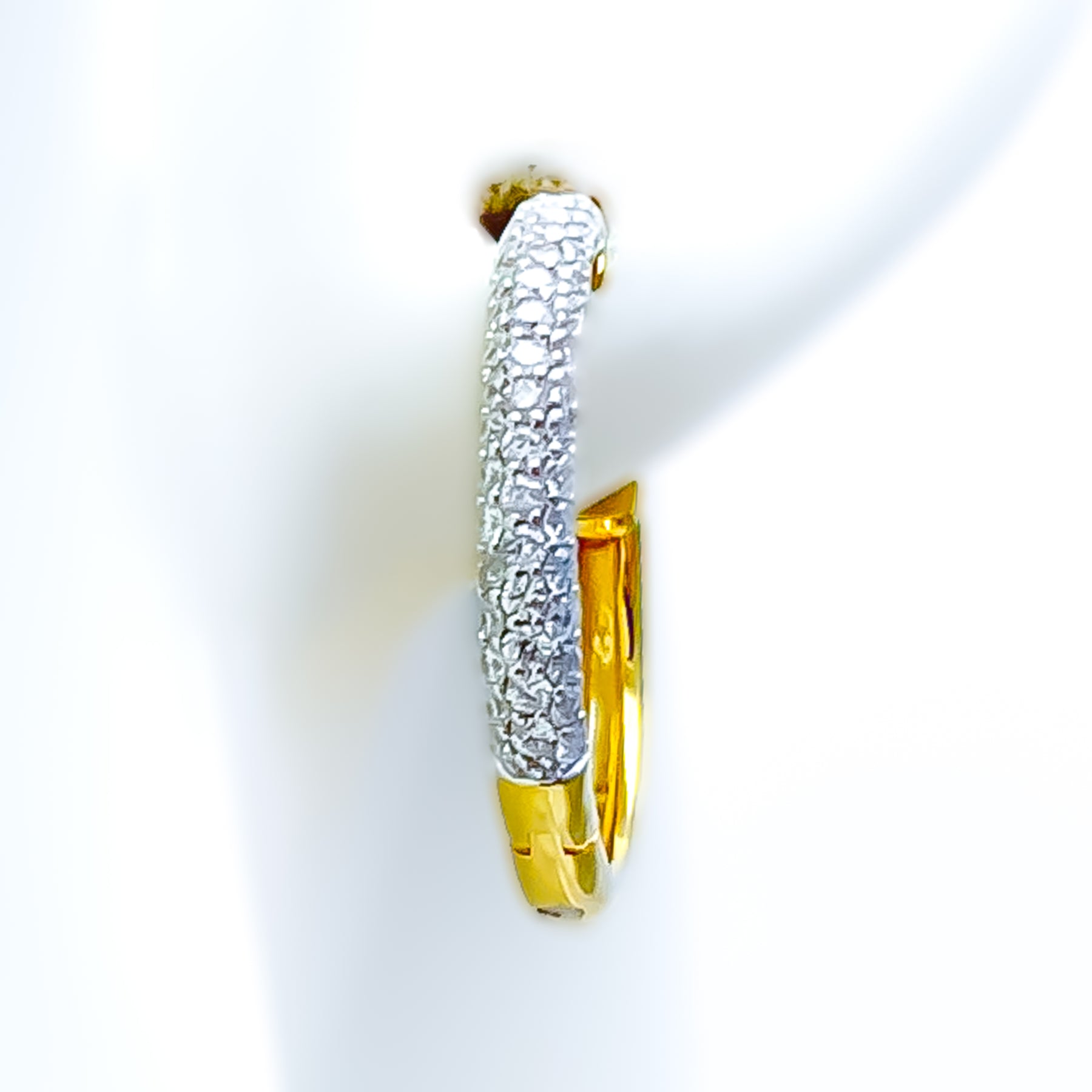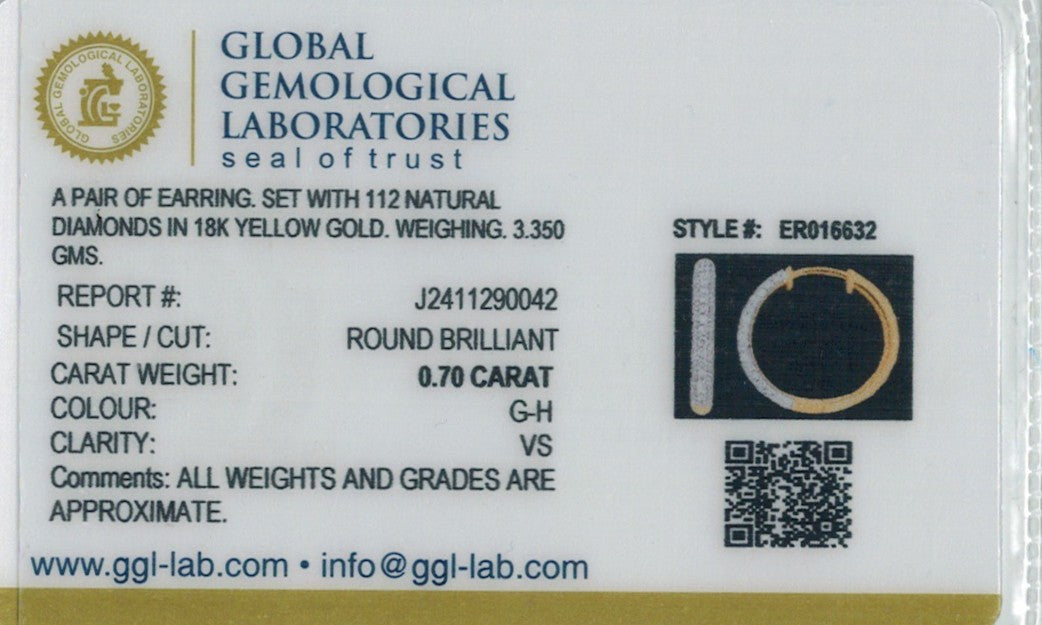 Richly sophisticated, these 18k yellow gold Bali earrings weigh 3.3 grams and dazzle with 0.70ct of round brilliant-cut diamonds in G-H color and VS clarity. With a 0.7" length and secure push lock closure, they offer a perfect blend of regal charm and everyday wearability. GGL certified, this pair exudes imperial elegance and enduring brilliance—ideal for refined gatherings or timeless daily grace.